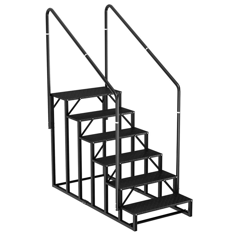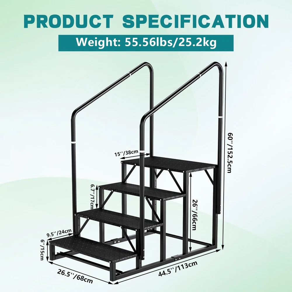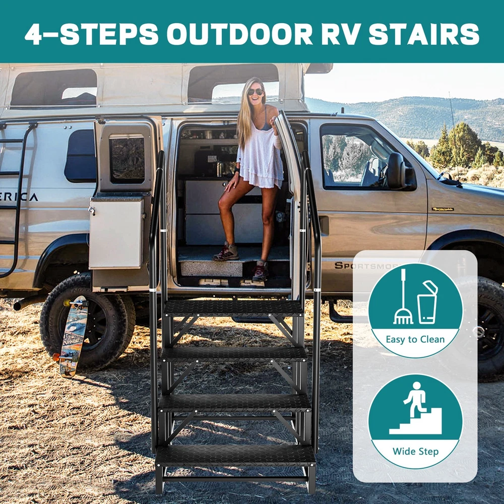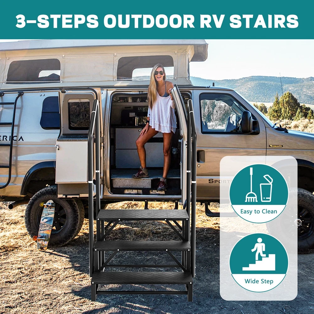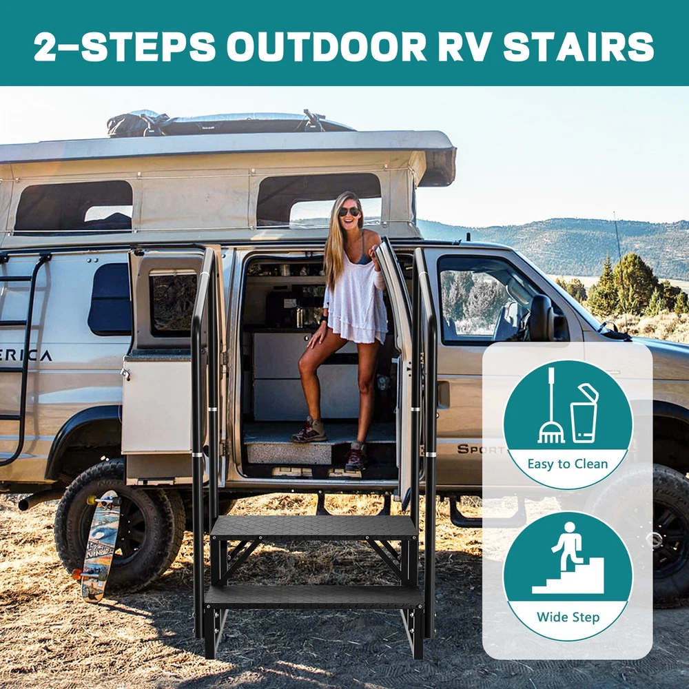 【Sturdy Construction】This RV steps is made from heavy-duty alloy steel, highly resistant to corrosion and deformity. With 500lbs weight capacity, it features triangular bars for added stability, reducing wobbling and the risk of falling. 【Entry Assist Handrail】The mobile RV stair is equipped with handrails that added support when entering and exiting your RV, especially in wet and slippery or nighttime conditions. 【Multiple Size Available】Our camper steps come in different steps to suit your needs, which is 2 to 6 steps. The ladder bookshelf has mounting holes on both sides, allowing for flexible handrail placement. 【Anti-slip Wide Steps】The RV entry steps equipped with thickened panel allows you to step on it more stable, it is not easy to damage and does not need to be pasted that keeping your family and friends safe. 【Wide Application】Our RV step ladder is suitable for various scenarios, such as RVs, travel trailers, campers, swimming spas, and hot tubs, providing support for elderly, children, and other mobility-impaired individuals.