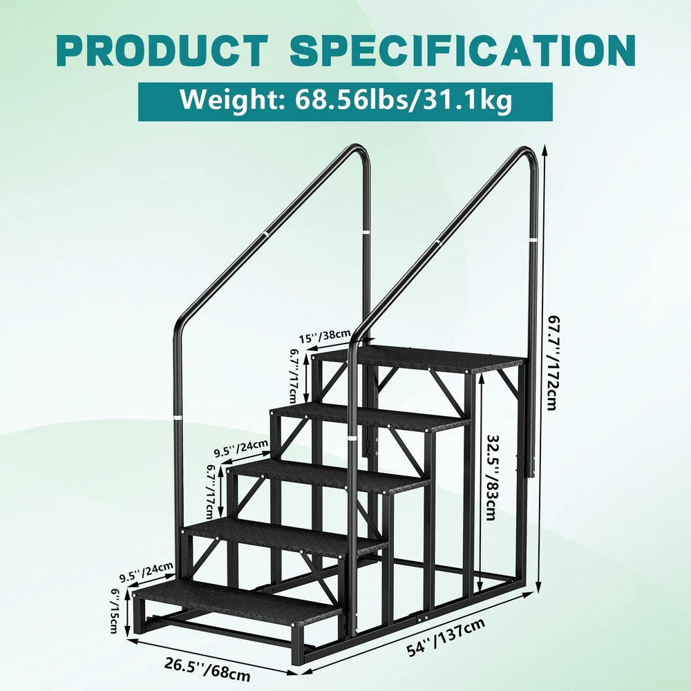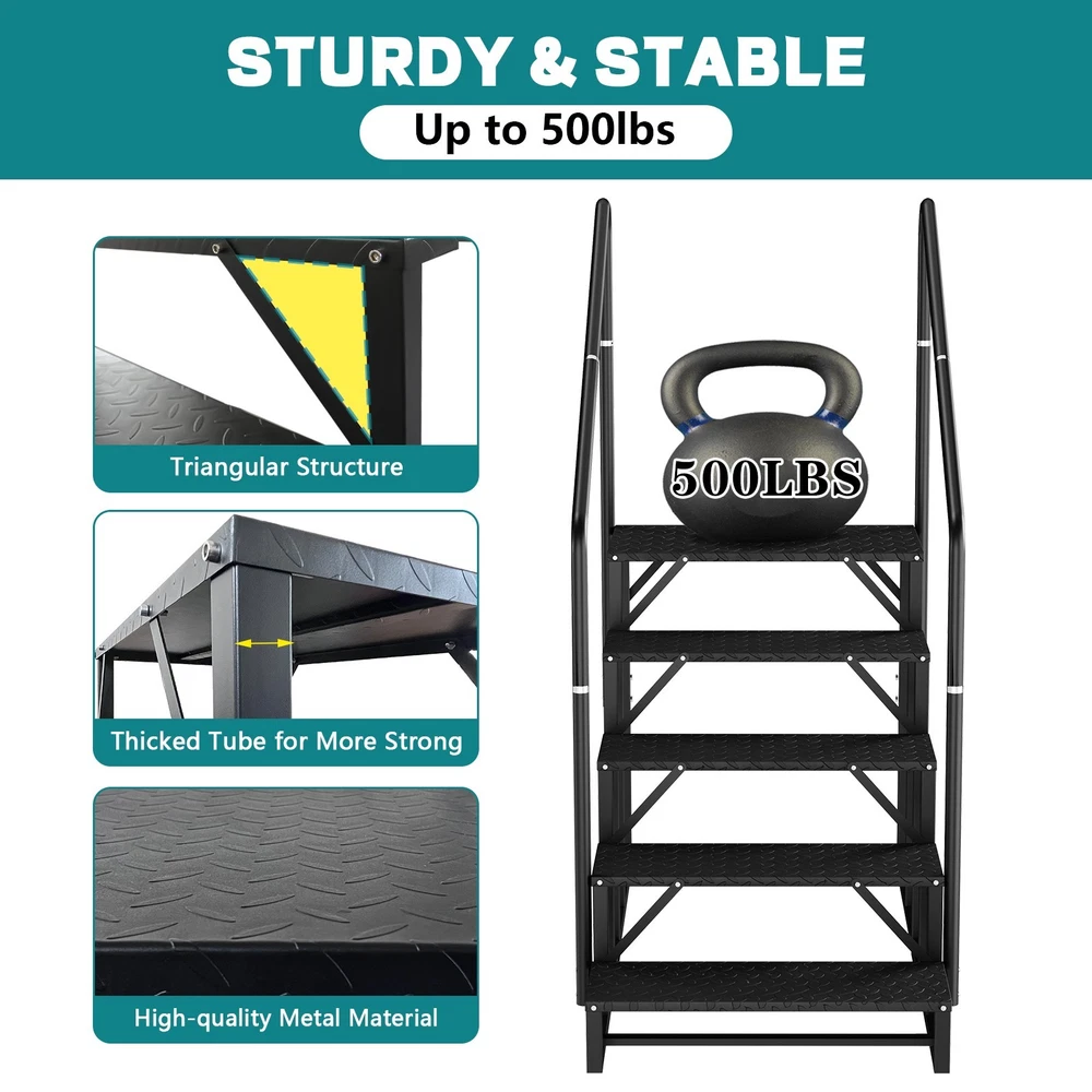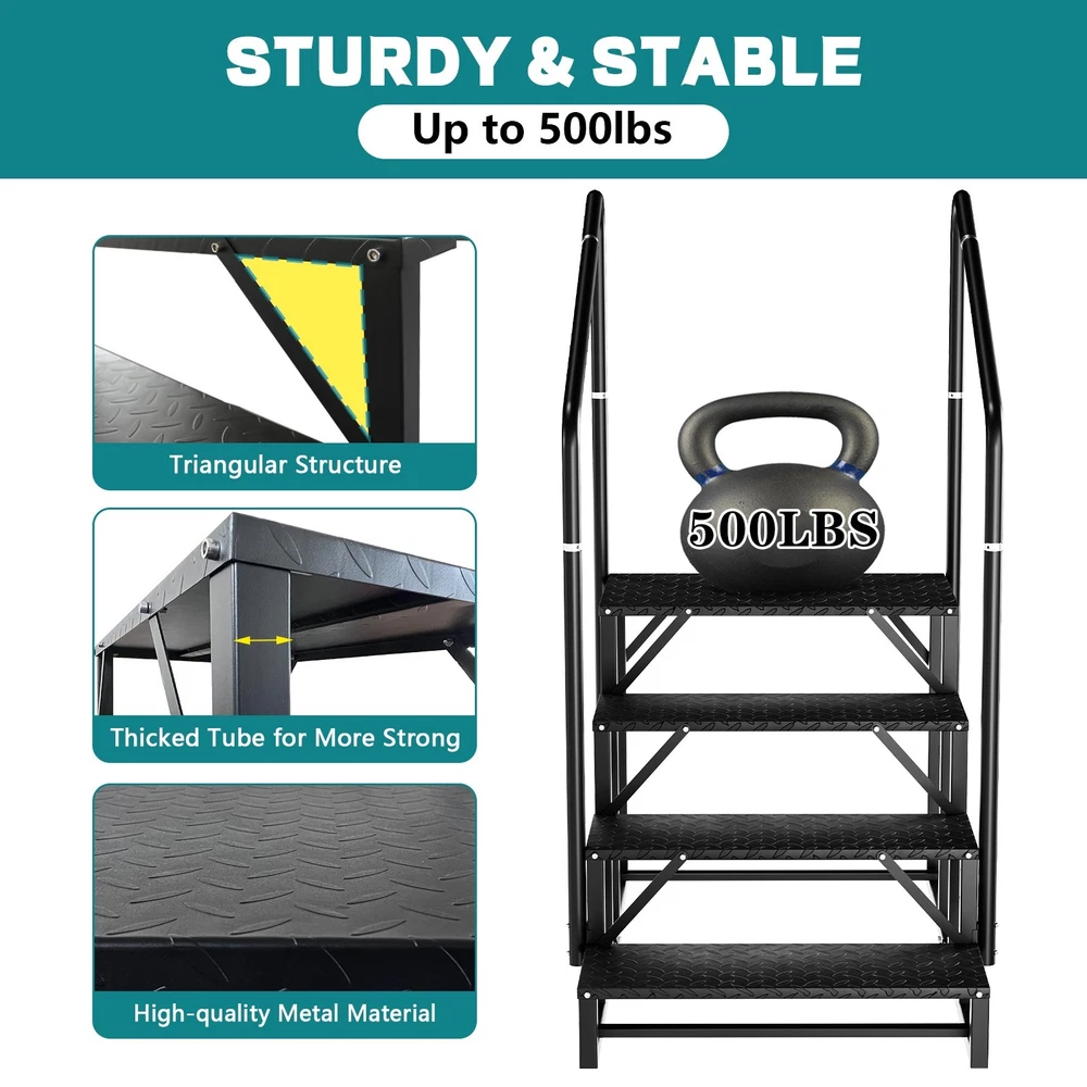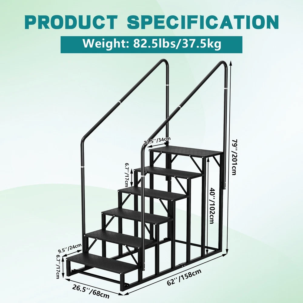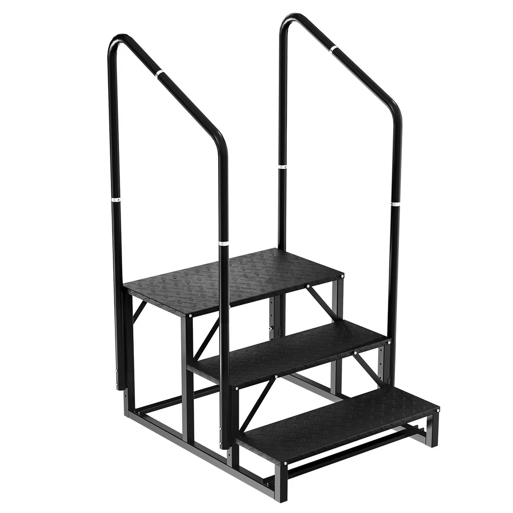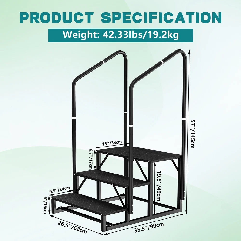 【Sturdy Construction】This RV steps is made from heavy-duty alloy steel, highly resistant to corrosion and deformity. With 500lbs weight capacity, it features triangular bars for added stability, reducing wobbling and the risk of falling. 【Entry Assist Handrail】The mobile RV stair is equipped with handrails that added support when entering and exiting your RV, especially in wet and slippery or nighttime conditions. 【Multiple Size Available】Our camper steps come in different steps to suit your needs, which is 2 to 6 steps. The ladder bookshelf has mounting holes on both sides, allowing for flexible handrail placement. 【Anti-slip Wide Steps】The RV entry steps equipped with thickened panel allows you to step on it more stable, it is not easy to damage and does not need to be pasted that keeping your family and friends safe. 【Wide Application】Our RV step ladder is suitable for various scenarios, such as RVs, travel trailers, campers, swimming spas, and hot tubs, providing support for elderly, children, and other mobility-impaired individuals.