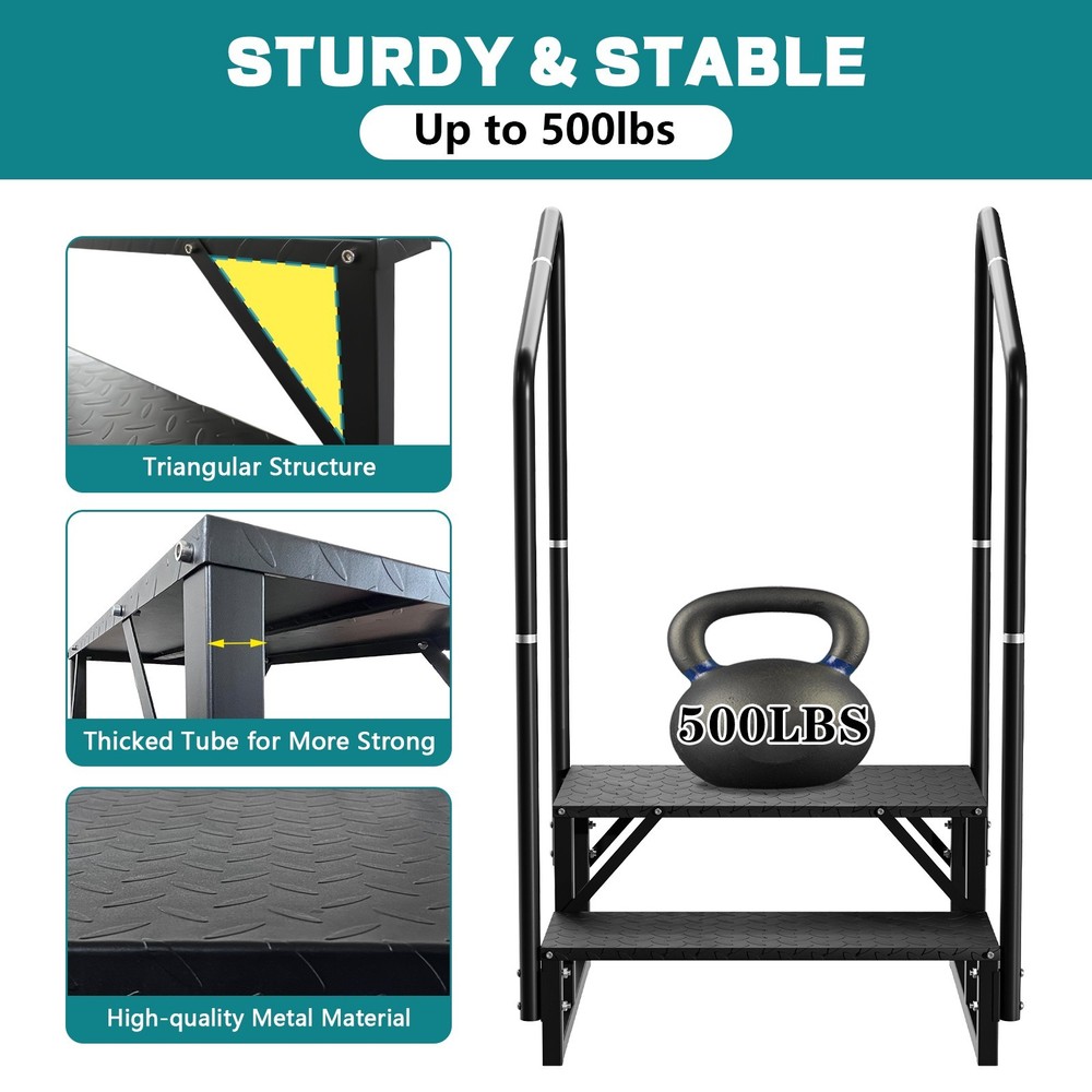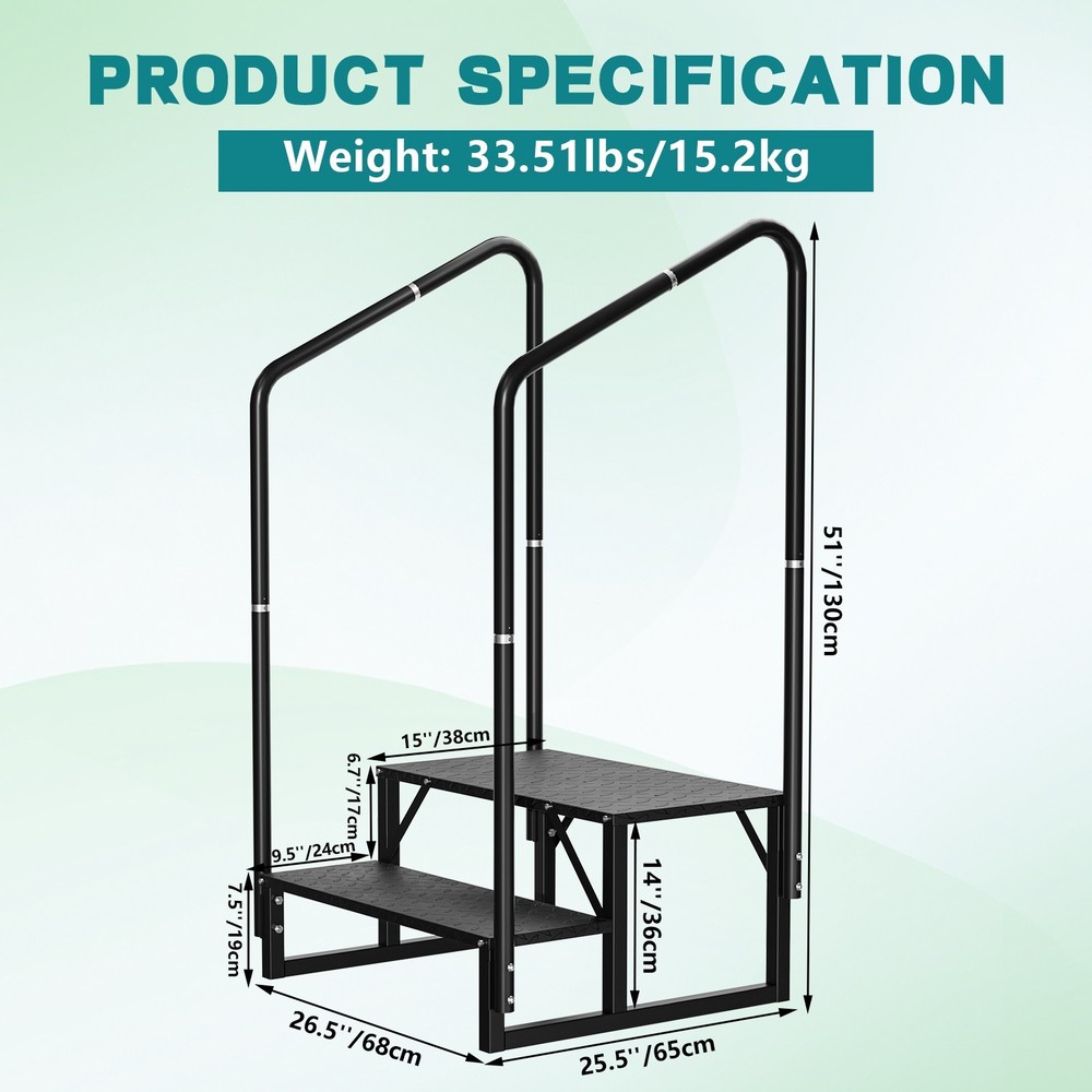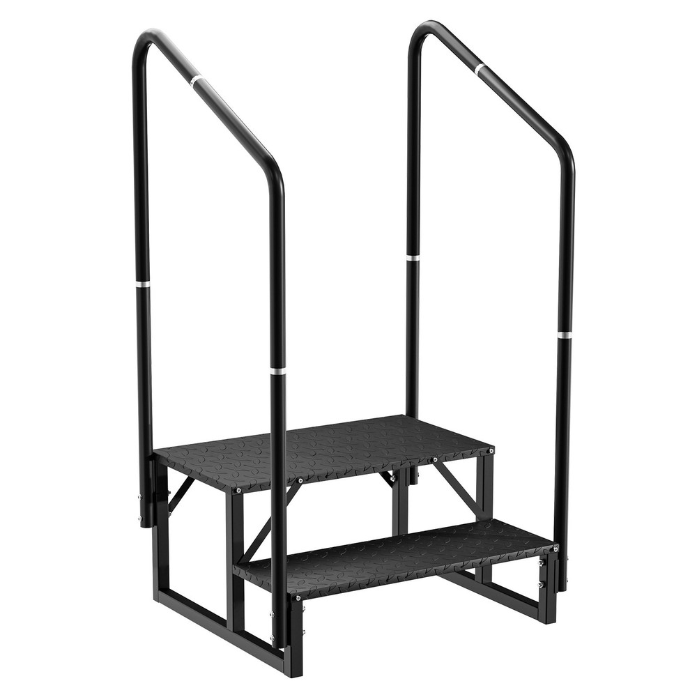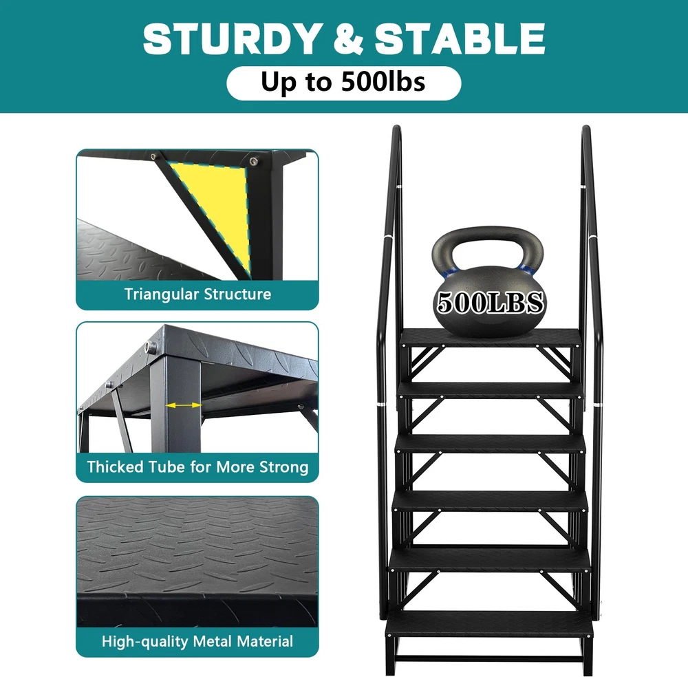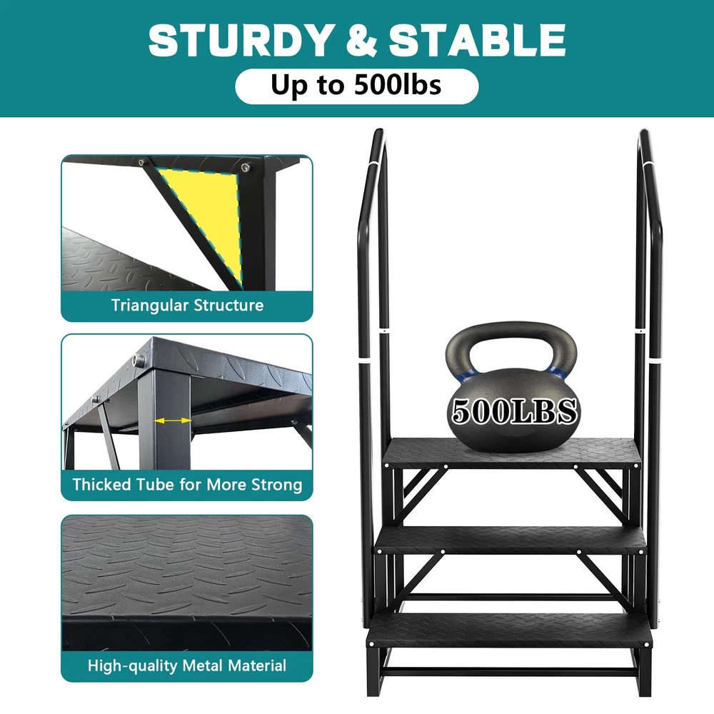 【Sturdy Construction】This RV steps is made from heavy-duty alloy steel, highly resistant to corrosion and deformity. With 500lbs weight capacity, it features triangular bars for added stability, reducing wobbling and the risk of falling. 【Entry Assist Handrail】The mobile RV stair is equipped with handrails that added support when entering and exiting your RV, especially in wet and slippery or nighttime conditions. 【Multiple Size Available】Our camper steps come in different steps to suit your needs, which is 2 to 6 steps. The ladder bookshelf has mounting holes on both sides, allowing for flexible handrail placement. 【Anti-slip Wide Steps】The RV entry steps equipped with thickened panel allows you to step on it more stable, it is not easy to damage and does not need to be pasted that keeping your family and friends safe. 【Wide Application】Our RV step ladder is suitable for various scenarios, such as RVs, travel trailers, campers, swimming spas, and hot tubs, providing support for elderly, children, and other mobility-impaired individuals.