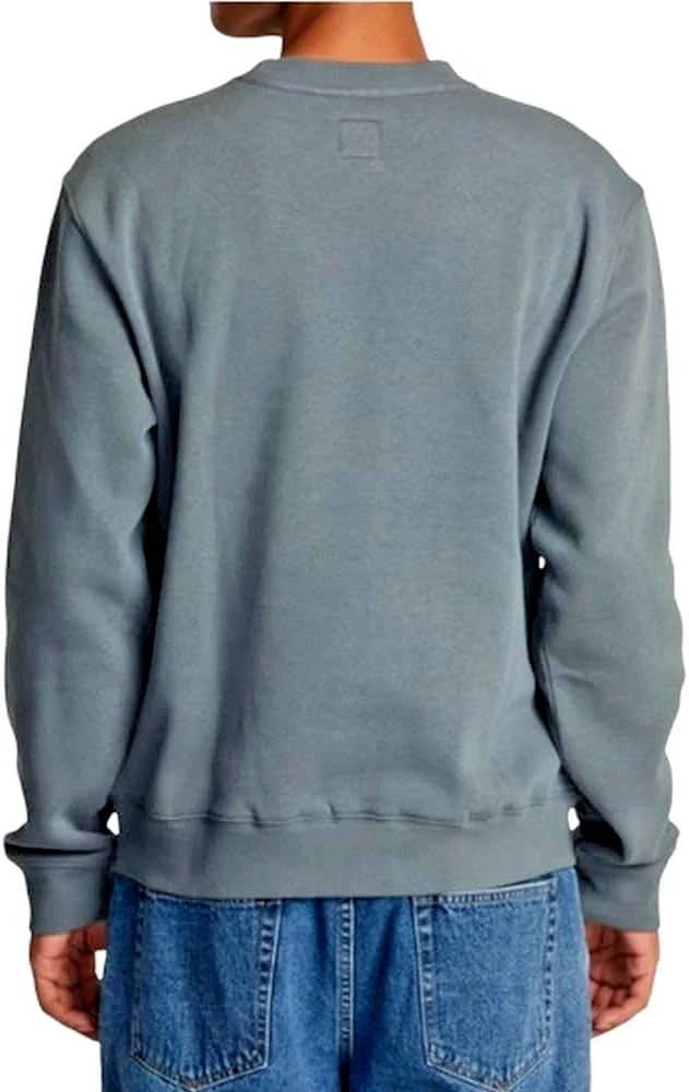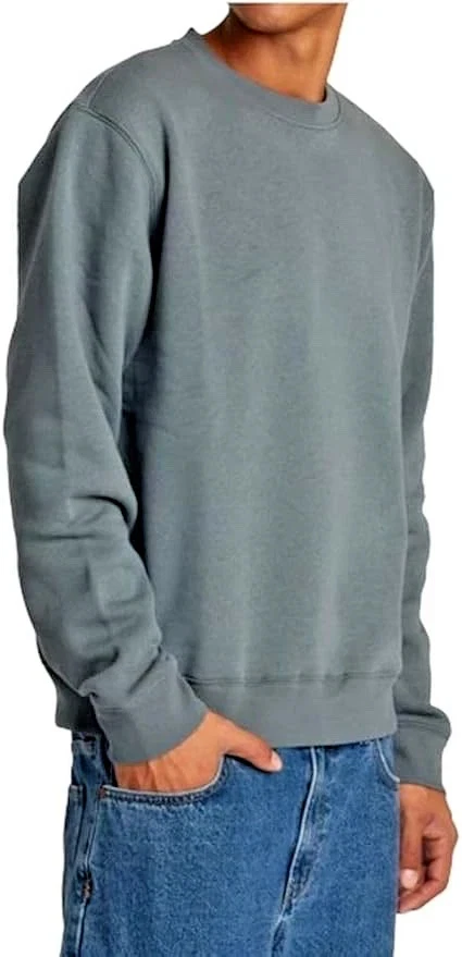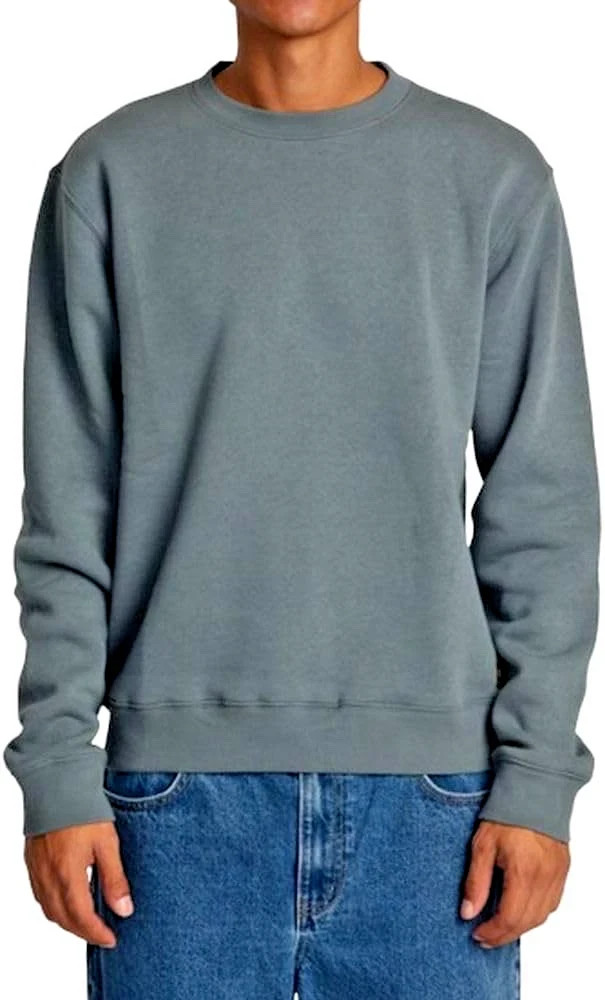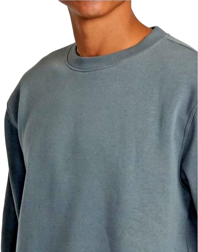 The RVCA Men's Relaxed Fit Fleece Crewneck in Balsam Green is a stylish and comfortable sweatshirt perfect for everyday wear. Made from a blend of 80% cotton and 20% polyester, this pullover features a classic crew neckline and long sleeves, making it easy to care for with machine washable fabric. The relaxed fit and logo accents add a touch of sporty flair, making it a versatile option for various activities such as walking. With its solid color and quality construction, this RVCA sweatshirt is a must-have for any man's wardrobe. Fit: Relaxed fit. Neck: Crew neck. Sleeves: Long sleeve. Closure:Pullover closure. Ribbed cuff, collar and hem.