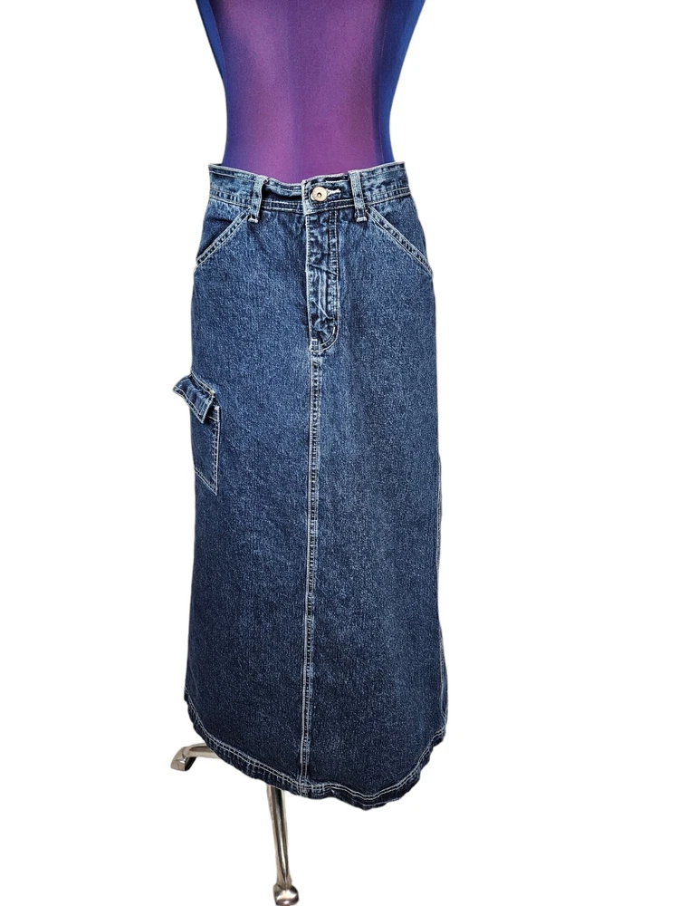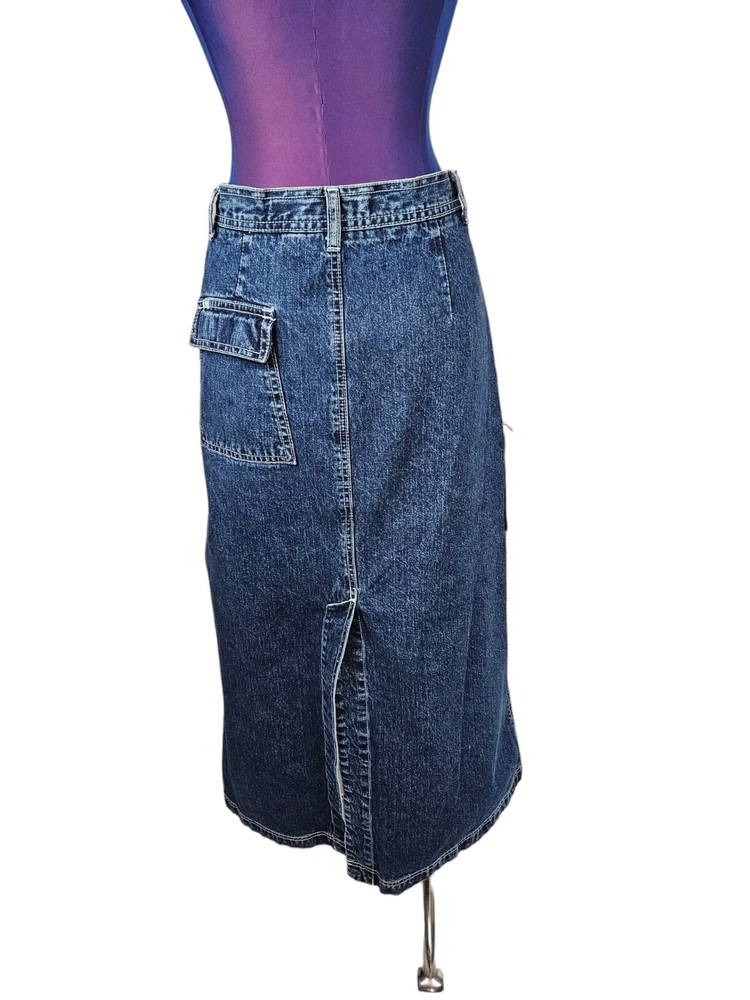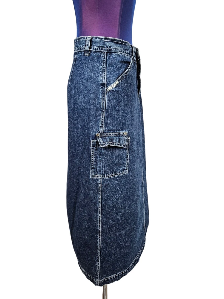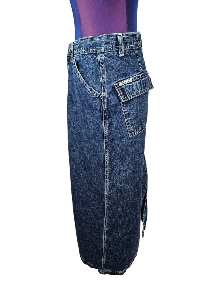 R.V.T Dark Wash Cargo Denim Maxi Jean Skirt Y2K Baggy Style Size 5/6 Women's C58 In excellent condition R.V.T Dark Wash Cargo Denim Maxi Jean Skirt Y2K Baggy Style Size 5/6 Women's. A true wear-with-everything classic, this timeless style pairs perfectly with your favorite tee or strappy tank for endless ways to wear. Features dark wash denim cargo maxi jean skirt, a-line silhouette, rigid denim, zip fly with button closure, 2 front slip pockets, 1 side cargo pocket with flap, 1 back pocket with flap, seam at front, back slit, belt loops, high waisted, Y2K style, baggy slouchy look, 90s jean skirt. Measurements laying flat waist 14" hips 19.5" length 33.5" Fabric 100% cotton This is a pre-owned item that may show signs of wear. In excellent condition, no flaws.