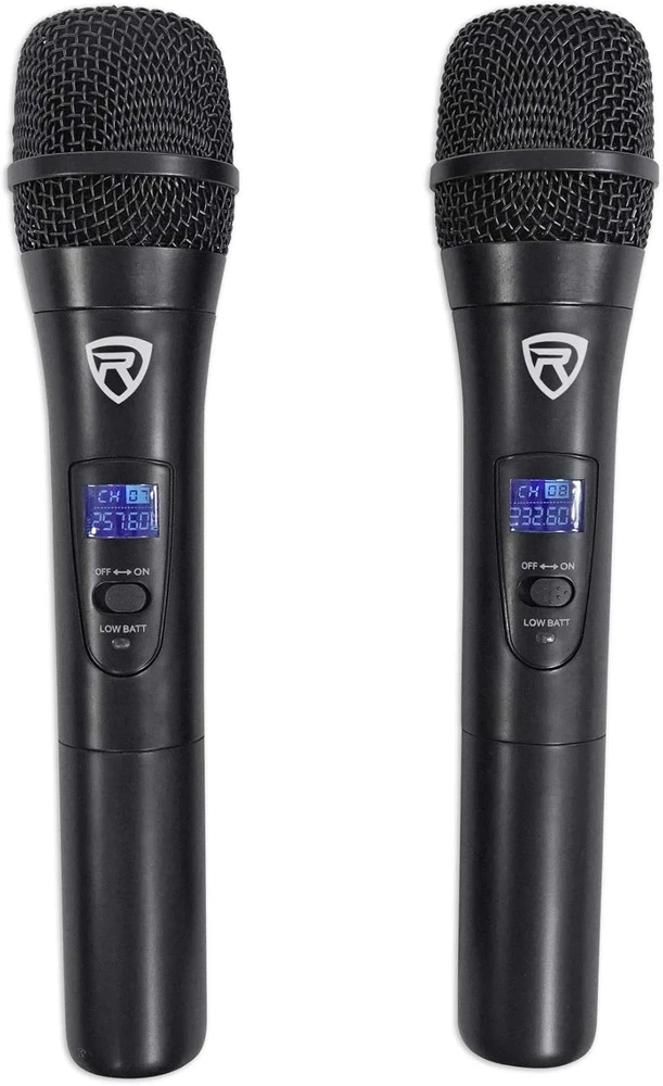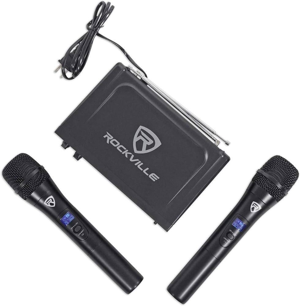 Rockville RWM1203VH VHF Dual Channel Handheld Wireless Microphone System. Large display on receiver + digital display on each mic. Each mic is large and solid with a nice weighted feel. Improved high performance wireless handheld microphone capsule. Includes transmitter with two handheld, high sensitivity, unidirectional, wireless cardioid microphones. Featuring a dual filter design to limit feedback and interference. Ultra signal stability eliminates unwanted distortion. Transmitter automatically links to receiver for ease of use. Use two handheld mics at once. Individual microphone volume controls. Low power consumption for longer battery life. System comes in 4 different frequency options. You can request a specific one in the notes, A. 255. 1/227. 1 MHZ , B. 224. 9/256. 9 MHZ, C. 228. 9/253. 4 MHZ, D. 230. 8/255. 8 MHZ Operating Range: 150 feet or more. Channel: Two Channel. Frequency Range: 210MHz - 270MHz. Frequency Response: 40Hz-18KHz. S/N. : >103dB (1KHz-A). Operating Temp: 14° F 122° F. Oscillation Mode: Quartz Crystal. Frequency Stability: ± 0. 005%. Modulation Mode: VHF. Harmonic Radiation : < 63dBm. RF Output Power: 10mW. Power Voltage: AC110V- 60Hz. Mic Battery: AA x 2. Sensitivity: (S/N=30dB) >2mV. Audio Output Impedance: 600Ω . Audio Output Level. : 0-0. 5V. Power Supply: AC110V 60Hz. Current Consumption: ≤ 50mA. Audio Out Connector: 1/4" unbalanced. Transmitter: Frequency Stability: ± 0. 005%. RF Output Power: ≤ 10mW. Modulation Mode: VHF. Maximum Deviation Range: ± 50KHz. Microphone Mode: Fixed. Power Supply: AA/1. 5V× 2. Current Consumption: ≤ 35mA. Includes: 2 wireless handheld microphones 1 receiver unit User manual Batteries Transfer Cable Features: Rockville RWM1203VH VHF Dual Channel Handheld Wireless Microphone System Large display on receiver + digital display on each mic Each mic is large and solid with a nice weighted feel Improved high performance wireless handheld microphone capsule Includes transmitter with two handheld, high sensitivity, unidirectional, wireless cardioid microphones Featuring a dual filter design to limit feedback and interference Ultra signal stability eliminates unwanted distortion Transmitter automatically links to receiver for ease of use Use two handheld mics at once Individual microphone volume controls Low power consumption for longer battery life System comes in 4 different frequency options. You can request a specific one in the notes A. 255. 1/227. 1 MHZ B. 224. 9/256. 9 MHZ C. 228. 9/253. 4 MHZ D. 230. 8/255. 8 MHZ Specifications: System: Operating Range: 150 feet or more Channel: Two Channel Frequency Range: 210MHz - 270MHz Frequency Response: 40Hz-18KHz S/N. : >103dB (1KHz-A) Operating Temp: 14 DegreeF - 122 DegreeF Oscillation Mode: Quartz Crystal Frequency Stability: ± 0. 005% Modulation Mode: VHF Harmonic Radiation : 2mV Audio Output Impedance: 600Ω Audio Output Level. : 0-0. 5V Power Supply: AC110V 60Hz Current Consumption: ≤ 50mA Audio Out Connector: 1/4˝ unbalanced Transmitter: Frequency Stability: ± 0. 005% RF Output Power: ≤ 10mW Modulation Mode: VHF Maximum Deviation Range: ± 50KHz Microphone Mode: Fixed Power Supply: AA/1. 5V× 2 Current Consumption: ≤ 35mA