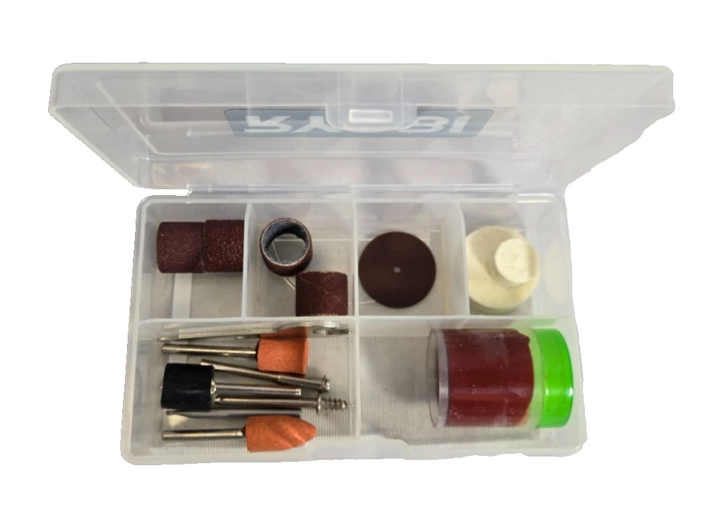 RYOBI 1.2 Amp Corded Rotary Tool with 14 Accessories (RRT100) Open Box - Excellent Condition - Tool & Accessories appear to be unused (see photos) Missing one cut off wheel (2 were included in original sealed box), all other items listed on box are included For more product info, see photos of box