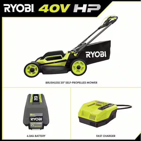 Ryobi 40V HP Brushless 20 in. Cordless Electric Battery Walk Behind Self-Propelled Lawn Mower with 6.0 Ah Battery and Charger About This Product The RYOBI 40V HP Brushless 20" Self-Propelled Lawn Mower delivers more power than a 150cc gas mower, making it a true gas replacement. Ideal for up to 1/2 acre, this mower comes with an included 40V 6Ah lithium battery for up to 40 minutes of runtime. The brushless motor and advanced electronics automatically react to mowing conditions by increasing the blade speed to eliminate bogging down and powering through the toughest cut. Equipped with self-propelled rear wheel drive, this mower ensures an effortless, efficient mowing experience. For your utmost convenience, adjust the height of your cut with the 7-position single point height adjustment. When you are finished, easily fold the handles and store vertically for compact storage. Best of all, it is part of the RYOBI 40V system where any 40V battery works with any 40V product. This self-propelled mower is backed by the RYOBI 5-Year Manufacturer's Tool Warranty, 3-Year Manufacturer's Battery Warranty, and includes RY401018 40V HP Brushless 20" Self-Propelled Mower, OP40605 40V 6Ah Lithium Battery, OP408 40V Fast Charger, Grass Catcher Bag, Start Key, Mulch Plug, Side Discharge Chute, and Operator's Manuals. Highlights 40V HP technology delivers more power than a 150cc gas mower, making it a true gas replacement Ideal for up to 1/2 acre with up to 40 minutes of runtime using included 40V 6Ah battery Brushless motor and advanced electronics automatically react to mowing conditions by increasing the blade speed to eliminate bogging down and powering through the toughest cut Self-propelled rear wheel drive for an effortless, efficient mowing experience Experience gas performance with just the push of a button. No gas, no maintenance, no hassle. Single-point height adjustment allows you to quickly select the perfect height for your lawn with 7 different positions (1.5 in.- 4 in.) The pass through bag removal allows you to quickly empty the grass bag without spilling grass clippings Folding handles easily collapse for compact, vertical storage even in tight places Included 40V Fast Charger delivers 2X faster charging Compatible with AC04029 20" Replacement Blade, AC20GB01 Replacement Grass Bag, AC04020FC Extra Capacity Grass Bag, ACMC02 Mower Cover, ACLS01 Lawn Striper Part of the RYOBI 40V System - Any 40V Battery Works With Any 40V Product 5-year manufacturer's tool warranty; 3-year manufacturer's battery warranty Includes: RY401018 40V HP Brushless 20" Self-Propelled Mower, OP40605 40V 6Ah Lithium Battery, OP408 40V Fast Charger, Grass Catcher Bag, Start Key, Mulch Plug, Side Discharge Chute, and Operator's Manuals