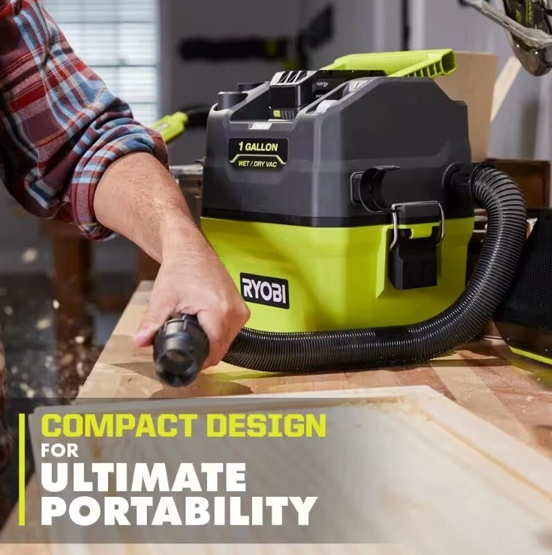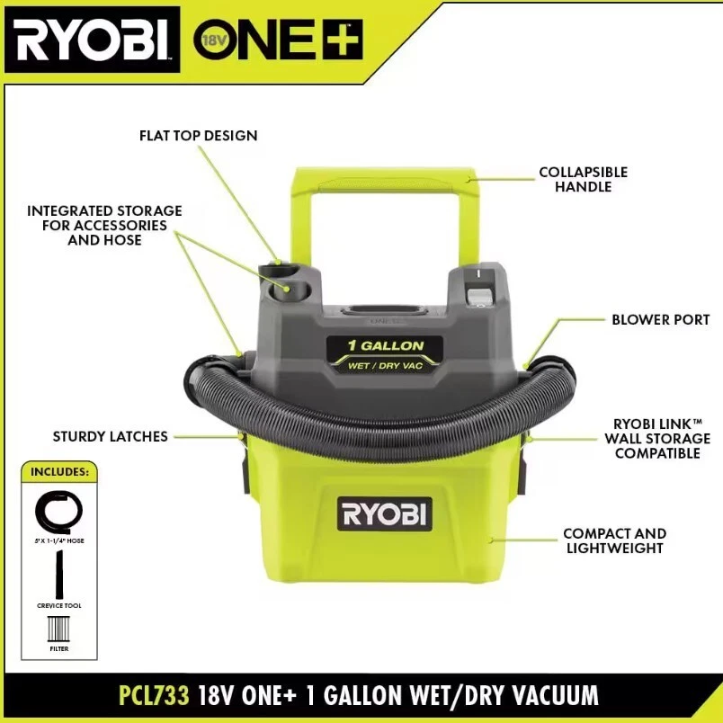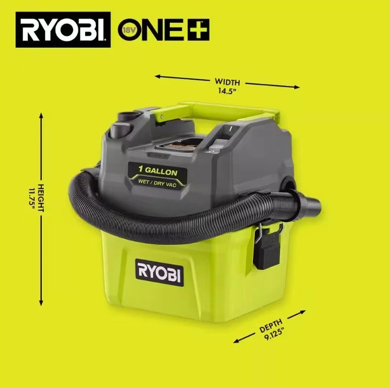 NOTE: NO DELIVERY TO FREIGHT FORWARDING COMPANY ADDRESSES AND WAREHOUSE, THE UPS STORE, UNITED STATES POSTAL SERVICE. NOTE: WE DON'T WORK ON SATURDAY AND SUNDAY. UPON ON KINDS OF SHIPPINGS ADDRESSES, PACKAGES WILL BE SHIPPED UP TO 10 BUSINESS DAYS. RYOBI ONE+ 18V Cordless 1 Gal. Wet/Dry Vacuum (Tool Only)(Battery Not Included) About This Product Enhance your RYOBI 18V ONE+ System with the 18V 1 Gallon Wet/Dry Vacuum. This vacuum delivers powerful suction in a compact and lightweight design. It is perfect for cleaning wet and dry debris with cordless portability. The integrated storage allows you to easily store the included hose and accessories. The 5’ hose gives you additional reach when cleaning, and the crevice tool is ideal for cleaning in tight spaces. This wet/dry vacuum is compatible with RYOBI LINK Wall Storage (Wall Rails sold separately) for hassle free storing and access. The sturdy latches give you improved durability for longer tool life, and the blower port gives you increased cleaning versatility by having two tools in one. At only 7 pounds, this wet/dry vacuum makes it easy to clean up around your car, workshop, and more. The collapsible handle and flat top design make this RYOBI’s most compact and portable wet/dry vacuum. Compatible filters and accessories available online: Standard Filter (A32VC05), HEPA Filter (A32RF08), Foam Filters (A32WF03), 6’ x 1-1/4” Hose (A32VH03) and 1-1/4” 2PC Wet/Dry Accessory Kit (A323G01). Best of all, it is part of the RYOBI ONE+ System of over 300 Cordless Products that all work on the same battery platform. This 18V ONE+ 1 Gallon Wet/Dry Vacuum is backed by the RYOBI 3-Year Manufacturer’s Warranty and includes a 5’ x 1-1/4” Hose, Crevice Tool, Cartridge Filter and Operator’s Manuals. Battery and charger sold separately. Highlights Powerful suction for wet and dry debris Compact design for ultimate portability RYOBI LINK Wall Storage compatible (Wall Rails sold separately) Blower port for increased versatility Integrated storage for accessories and hose 5’ x 1-1/4” hose for added flexibility and reach Crevice tool is ideal for cleaning tight spaces Sturdy latches for improved durability Filters available online: Standard Filter (A32VC05), HEPA Filter (A32RF08), and Foam Filters (A32WF03) Accessories available online: 6’ x 1-1/4” Hose (A32VH03) and 1-1/4” 2PC Wet/Dry Accessory Kit (A323G01) Best-in-Class 18V Cordless Cleaning System Part of the RYOBI 18V ONE+ System of Over 300 Cordless Products 3-year manufacturer's warranty Includes: PCL733 18V ONE+ Cordless 1 Gallon Wet/Dry Vacuum, 5’ x 1-1/4” Hose, Crevice Tool, Cartridge Filter and Operator’s Manual Battery and charger sold separately