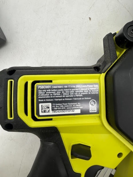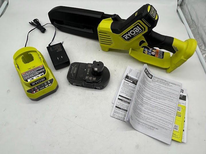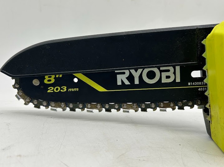 Visible signs of use on chain and in housing. Please see photos. Saw has been tested and operates as it should. Battery and charger included. The RYOBI 18V ONE+ HP Compact 8" Pruning Chainsaw is the perfect tool for homeowners and gardeners who want a powerful , compact , and easy-to-use chainsaw for pruning and light limbing. Featuring ONE+ HP Technology , this chainsaw combines a brushless motor , advanced electronics, and high-performance lithium technology to deliver 3X faster cutting for efficient and smooth operation. Designed with an 8" bar & chain , this pruning chainsaw can handle branches up to 6 inches in diameter, making it ideal for tackling those hard-to-reach areas and smaller trimming tasks. The saw is 30% more compact than traditional models, allowing you to access tight spaces with ease, while the oil-free design eliminates the mess and hassle of dealing with oiling. With a variable speed trigger , you get maximum control over your cuts, while the tool-less chain tensioning system lets you easily adjust the chain with the included combination wrench . Equipped with a chain guard for extra safety and a guarded handle , this chainsaw is built with safety in mind. It also boasts an impressive 65+ cuts per charge with the included 18V ONE+ 2Ah battery (battery and charger sold separately). Key Features: 3X Faster Cutting: Powered by ONE+ HP Technology for increased efficiency and faster cuts. Compact & Lightweight: 30% smaller for better access to tight spaces and hard-to-reach areas. High-Performance Cutting: 8" bar & chain easily cuts branches up to 6" in diameter , ideal for pruning and light limbing. Hassle-Free Operation: Oil-free design eliminates the mess and the need for constant oiling. Tool-less Chain Tensioning: Adjust chain tension easily with the convenient tool storage on board. Enhanced Control: The variable speed trigger offers you maximum control, whether you're trimming delicate branches or tackling tougher limbs. Safety Features: Chain guard and guarded handle ensure a safer cutting experience. 65+ Cuts per Charge: Get more work done on a single charge with the 18V ONE+ 2Ah battery (battery and charger sold separately). What's Included: 18V ONE+ HP Compact 8" Pruning Chainsaw Scabbard Combination Wrench Operator's Manual As part of the RYOBI ONE+ system , this chainsaw is compatible with all other RYOBI 18V ONE+ batteries and products, making it a great addition to your existing tool collection. We take great care to inspect all items and ensure they are accurately described. Should you have any issues with your purchase, please let us know immediately. We are committed to resolving any concerns promptly and to your satisfaction. Our small business truly appreciates your patronage.