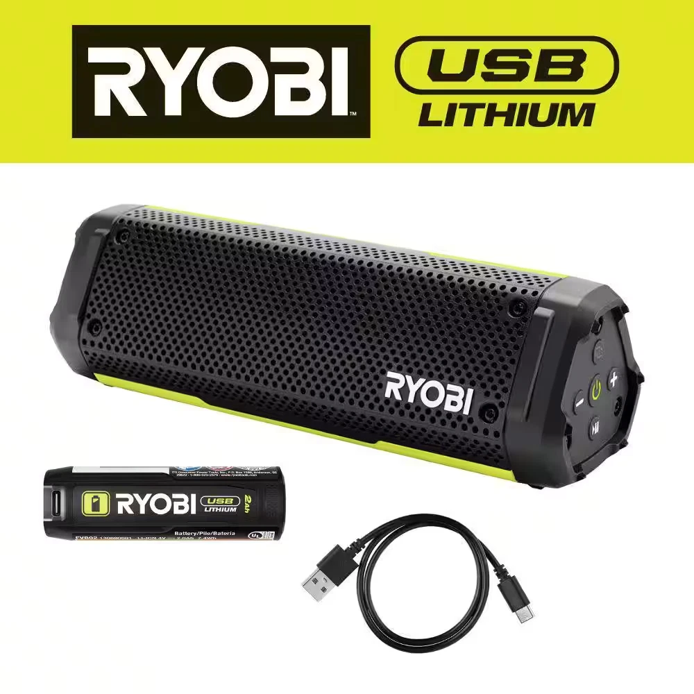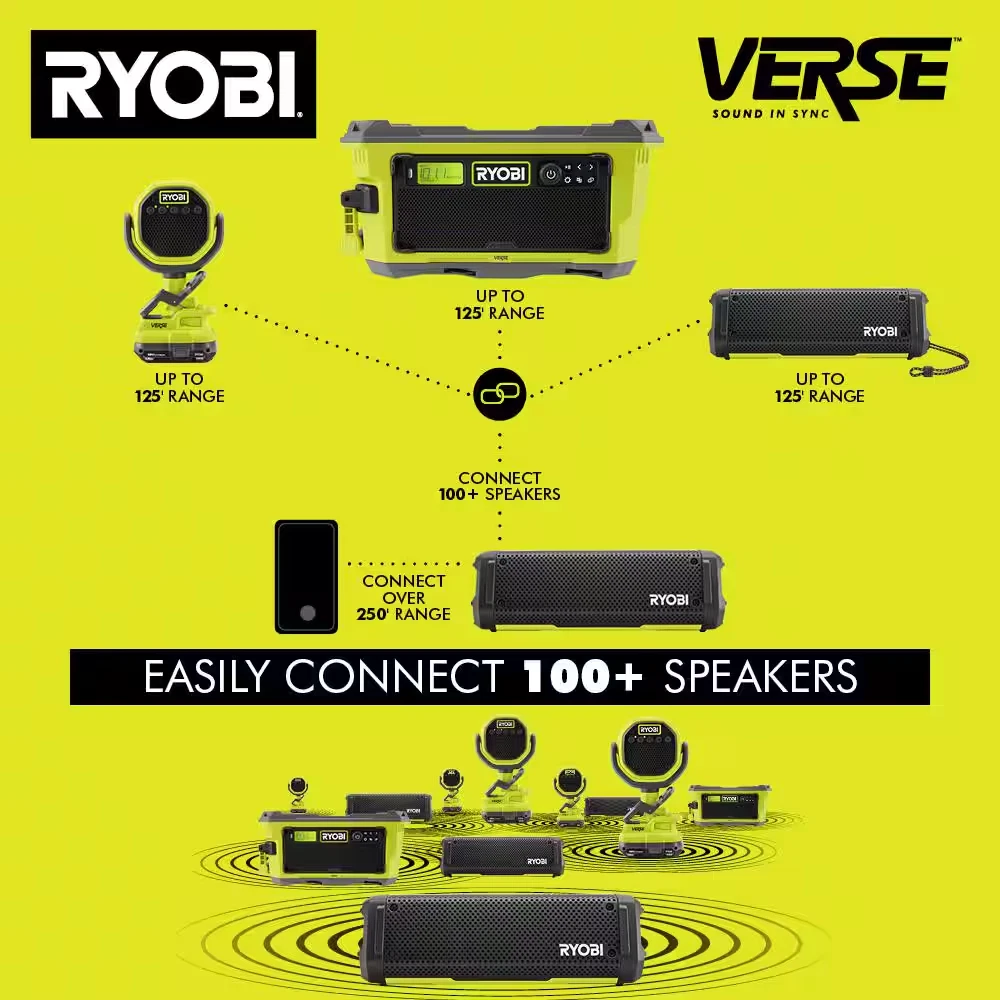 Premium Sound Quality And VERSE Multi-Speaker Connectivity IP67 Dust And Waterproof Built To Withstand All Conditions Powered By The RYOBI USB Lithium Battery System The RYOBI USB Lithium VERSE Compact Speaker Kit is the perfect blend of portability and premium sound. The powerful speaker and tweeter create studio-quality sound, anywhere you go. The IP67 dustproof and waterproof rating ensures this speaker is a reliable solution built to withstand all conditions. Listen to what you want, where you want, with up to 250’ of BLUETOOTH range. Utilize this speaker independently or use VERSE technology to connect additional speakers for even greater sound, no app required. Quickly & easily connect 100+ RYOBI VERSE speakers with up to 125' of speaker to speaker connection range. Stay powered with up to 6 hours of runtime. Use the speaker’s on-board USB-C charging port for unlimited runtime or swap batteries and charge them remotely with the included USB cable. The included USB Lithium 2Ah battery features a USB-C port that also charges mobile devices, and a LED fuel gauge that clearly indicates the battery level status with the press of a button, eliminating guess work. The product also features an LED indicator to signal when the battery is charged (green) or has low battery (red) while in-use. Best of all, it is part of the RYOBI USB Lithium System of tools that provides compact, rechargeable, everyday solutions for cordless power and productivity. The USB Lithium VERSE Compact Speaker Kit is backed by the RYOBI 2-year manufacturer's warranty and includes a USB Lithium 2Ah Lithium Battery, USB Cable, Lanyard and Operator's Manual. Powerful speaker and tweeter for premium and dynamic sound Take this speaker anywhere with IP67 dustproof and waterproof rating Amplify your experience seamlessly by connecting 100+ RYOBI VERSE products without the use of an app (USB Lithium Compact Speaker, 18V ONE+ Clamp Speaker and 18V ONE+ LINK Stereo) Stay connected with up to 250’ of BLUETOOTH streaming range and up to 125’ to VERSE secondary speaker Up to 6 hours of runtime (With included 2Ah battery) Recharge USB Lithium Batteries while you listen with the on-board USB-C port providing unlimited runtime On-board LED indicators signal battery and connection status The included USB Lithium 2Ah battery features a USB-C port that also charges mobile devices LED fuel gauge on the battery indicates battery level status with the press of a button The RYOBI USB Lithium Battery System: Everyday Solutions. Rechargeable Power. 2-year manufacturer’s warranty Includes: FVA51 USB Lithium VERSE Compact Speaker, USB Lithium 2Ah Lithium Battery, USB Cable, Lanyard, and Operator's Manual