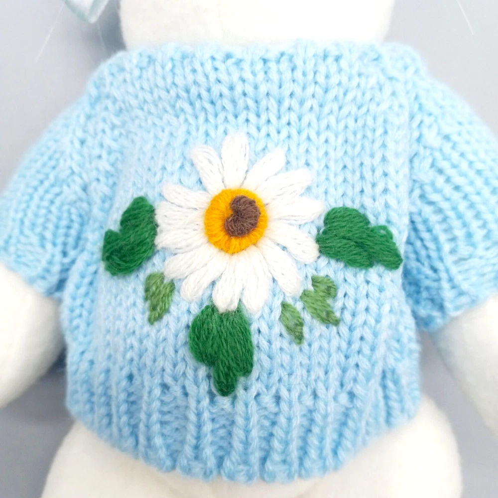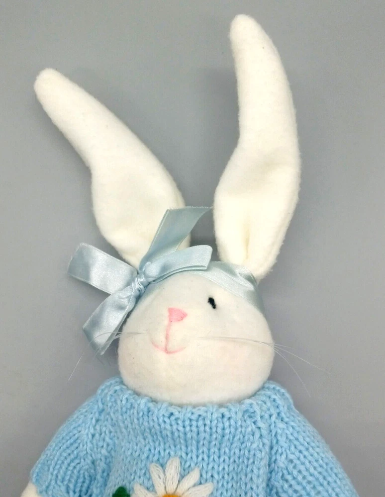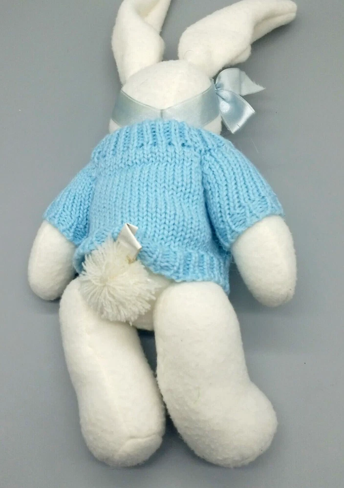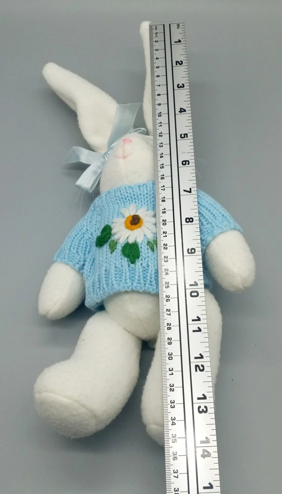 This adorable Terry's Village plush rabbit is perfect for Easter with its blue sweater and floppy ears. Made in China this small (6-14 in) stuffed animal is not a toy but a wonderful addition to any collection. The rabbit is white in color and belongs to the character family of Bunny, Rabbit, and Hare. It is recommended for ages 4 and up. This stuffed animal is perfect for any occasion and is sure to be a hit with anyone who loves rabbits or stuffed animals.