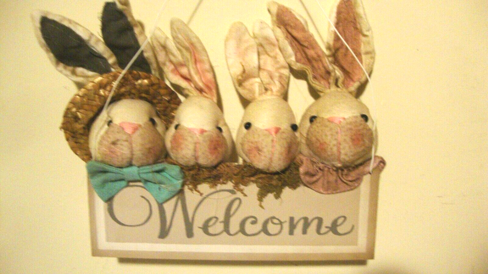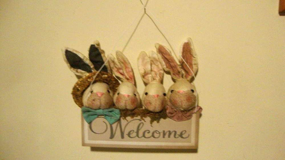 Here is a new spring wall hanger , this is made of wood and fabric and has metal hanger, the wood sign reads Welcome and their is 4 attached bunnies acrossed the sign in multi color clothind and one has attached wicker hat on, this measures 10 inch wide by 10 inch high and is 3 inch in diameter, this would accent any door or wall hook hanging for spring or summer season, and check out my many other nice decor and lighting.