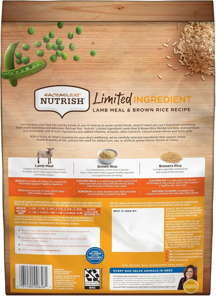 Contains one (1) 6 pound bag of Rachael Ray Nutrish Limited Ingredient Lamb Meal & Brown Rice Recipe dry dog food (packaging design may vary) Only 6 ingredients with added vitamins, minerals, taurine and other nutrients Lamb meal is the number one ingredient No fillers, artificial flavors, colors or artificial preservatives Safely USA cooked with the world's finest ingredients