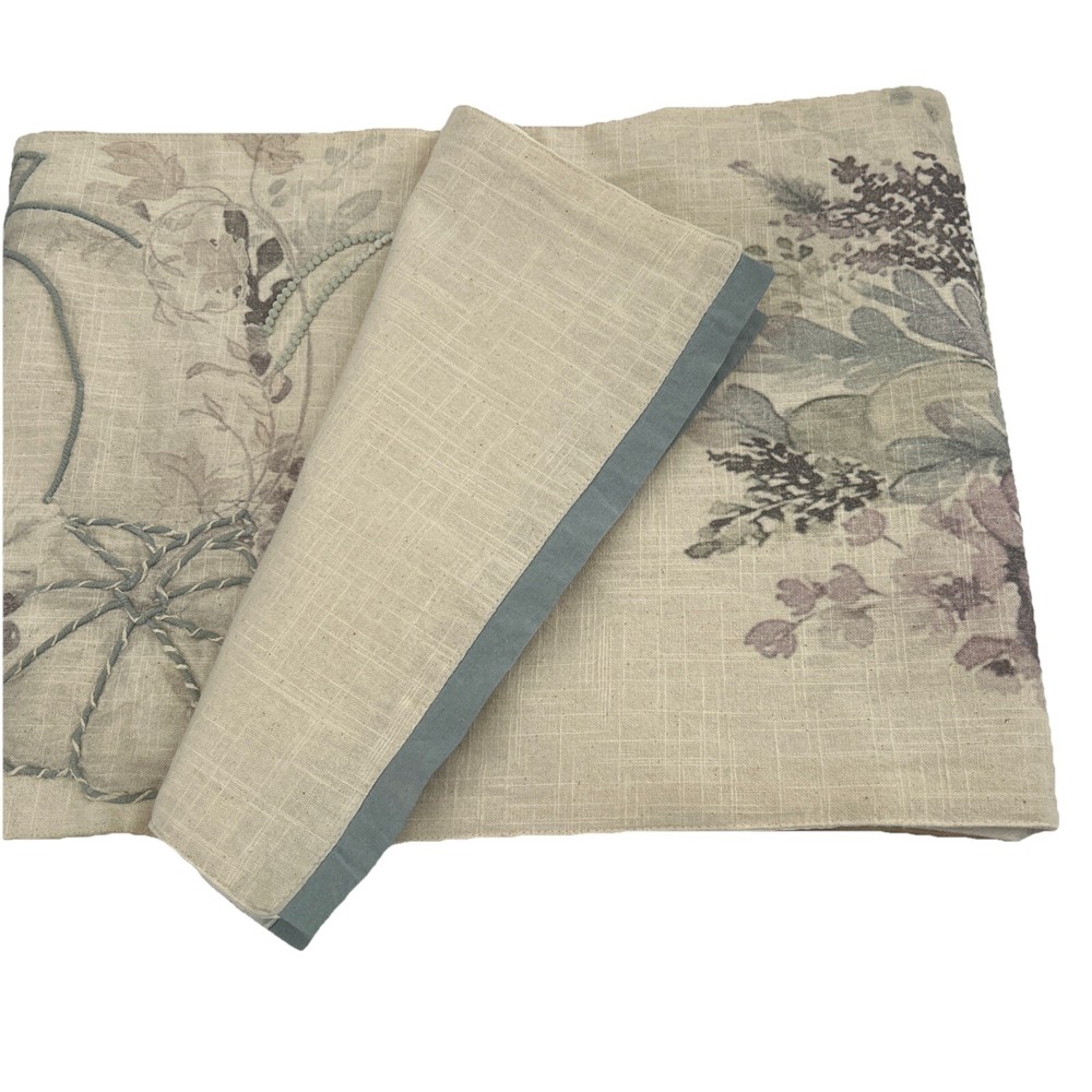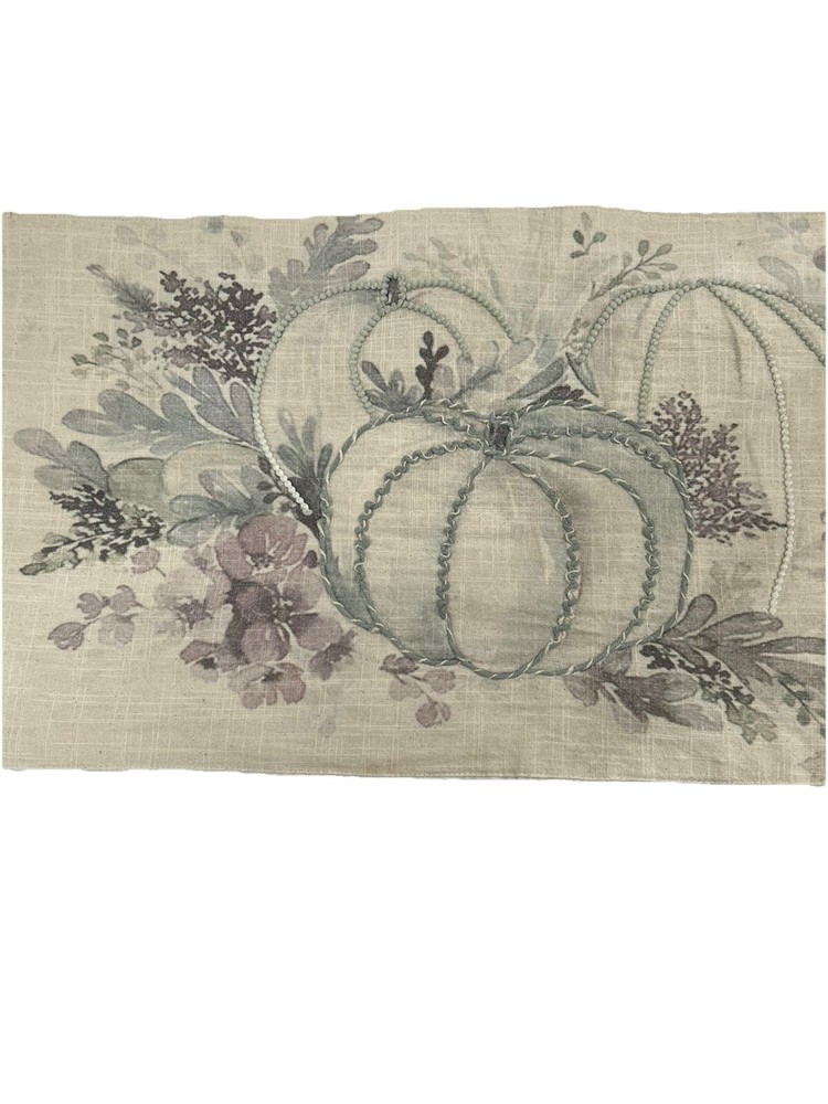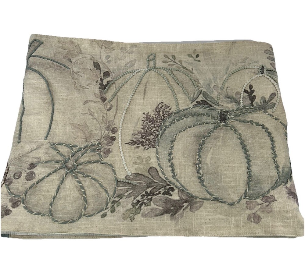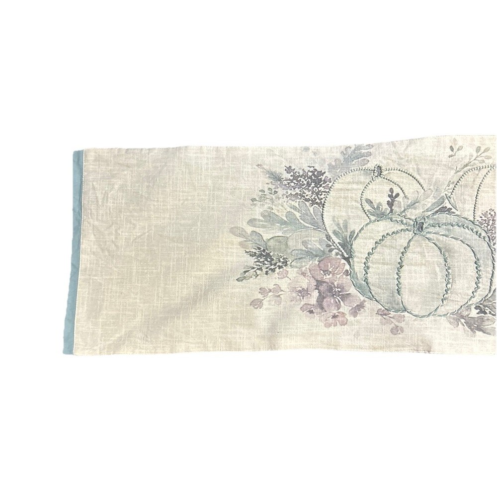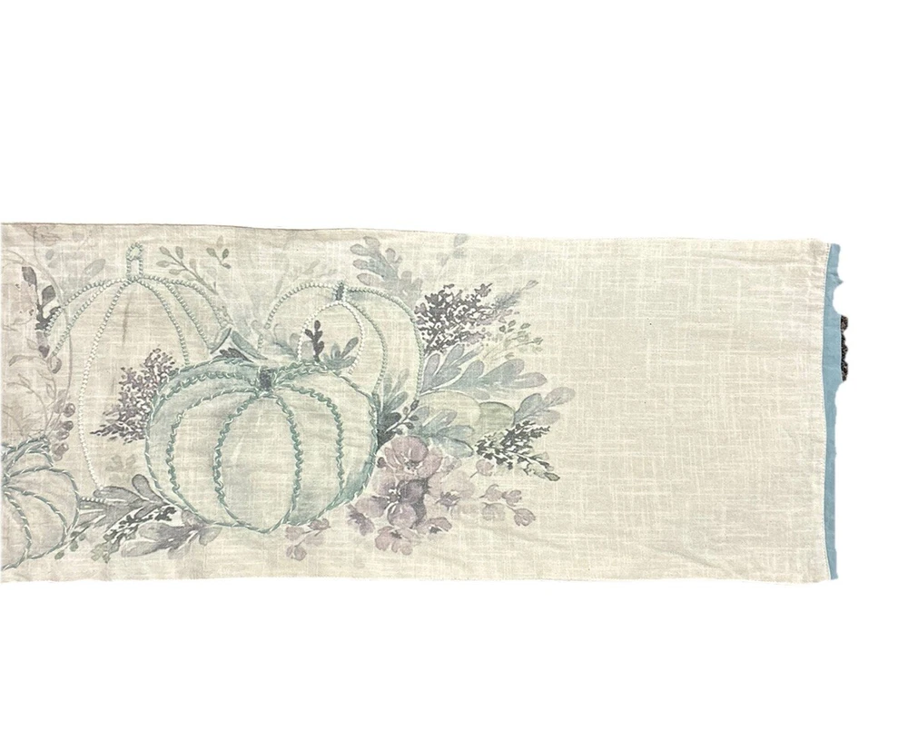 Muted blues, grays, green and cream with a pop of lite plum. Raised yarn and thread texturing on pumpkins. New with tags. Small spot on end and mark on back side. Shabby chic subtle tones Style: The Farmhouse Approximately 70 inches long and 13 inches wide There are some marks on the back due to use. No odors. Please see photos of your condition and measurements. If you have any questions, please let us know. Thank you for your support this small shop! Happy holidays. home decor, autumn decor, blue theme, pumpkin spice, gourds, family dinner, staged kitchen table, neutrals