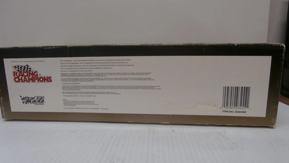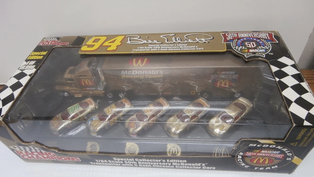 You are bidding on: Racing Champions Bill Elliott 1/64 Scale. 50th Anniversary McDonalds Edition Description Condition: new. This is a Racing Champions Bill Elliott 1/64 Scale. 50th Anniversary McDonalds Edition Great to add to your collection. Scale 1:64 This is a new box that has been in storage. This is a transporter with 5 Gold-Chrome cars ***************************************************************************************************** PLEASE READ: I buy mostly estates, close outs, shelf pulls, and auction items. As the history of the item is not always known. I will describe all of my items listed to the best of my ability, if there are any flaws to the item it will be noted in the listing and photos of the flaw shown. At times I may miss a flaw, as I am only human. Please contact me and I will make it right and make sure that you are happy with you interaction and purchase from Big Man Tim. See photos for details and ask all questions before purchasing. "FREE SHIPPING" Thank you for shopping in my store. Check out the other items in my eBay Store! HAPPY BIDDING 112524/TM warehouse