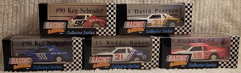 This lot of 5 Nascar 1:64 Diecast cars include drivers: #21 Buddy Baker. #21 David Pearson, #15 Ricky Rudd and 2 Different #90 Ken Schrader. All boxes and cars are in excellent condition with minimal shelf wear. Shipping is $7.00. Your item will be carefully packaged. All Items are usually shipped the very next business day unless the buyer is contacted otherwise. We do combine shipping on multiple item's won or bought. Please wait for an invoice before paying We purchase all packaging supplies and only use the quality packing materials.