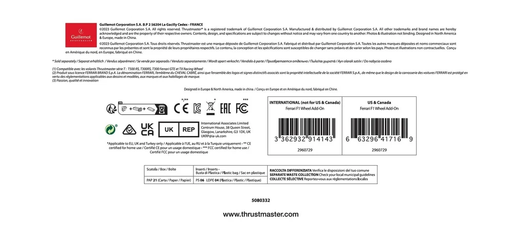 Thrustmaster F1 Racing Wheel (compatible w/ PS5, PS5 Pro, PS4, XBOX Series X/S, One, PC) Description The Ferrari F1 Wheel Add-On is a detachable racing wheel featuring the “THRUSTMASTER Quick Release” system allowing users to quickly switch from the T500 RS GT wheel to the F1 Ferrari wheel (and conversely). It is a full-size replica of the Formula 1 Ferrari 2011 racing wheel, under official license by Ferrari, for the THRUSTMASTER T500 RS (T500 RS driving simulator sold separately). There are two available game modes: 1.) “Normal” mode, PC and PS3™ compatible (offering 13 action buttons and 3 D-pads); and 2.) “Advanced” mode, PC compatible (offering 25 action buttons and 1 D-pad). Please note that a T500 RS firmware update (available from THRUSTMASTER's website) is required to operate the F1 Ferrari racing wheel. From the Manufacturer > P.when('A').execute(function(A) { A.on('a:expander:toggle_description:toggle:collapse', function(data) { window.scroll(0, data.expander.$expander[0].offsetTop-100); }); }); Manufacturer Contact Information > See more Features: Collectors item. Detachable Ferrari 150th Italia racing wheel replica for the Thrustmaster T300RS (PS3 & PS4); T500RS (PS3, PS4, Xbox One & PC); and TX Wheel (Xbox One & PC), all sold separately A precise, robust and realistic racing wheel Full-size replica of the Formula 1 Ferrari 2011 racing wheel, under official license by Ferrari Reinforced scratched-brushed metal face is heavier and more solid compared to plastic, ensuring optimum stability and inertia Rubber-textured wheel offering a realistic and comfortable grip Product Details: Release date: October 18, 2011 Product Dimensions: 12.52 x 8.9 x 5.39 inches; 2.87 Pounds Type of item: Video Game Language: English, French Item model number: 4160571 Is Discontinued By Manufacturer: No Item Weight: 2.86 pounds Manufacturer: Thrustmaster Date First Available: September 27, 2011 Delivery We Do Not Ship Outside of the Continental US. Return Policy All items qualify for returns within 30 days of receipt. Seller is responsible for return shipping on any item that is not damaged. Feedback We take our reputation seriously, we buy and sell online, so we understand the value of trust. If you are unsatisfied with your order, please contact us and we will work with you to resolve it to your satisfaction. WELOCME TO BUY SpoilerKing Gurney Flap Add-on Lip Spoiler (284Q) Compatible with Honda Civic... 130.63 USD Free shipping Flashpower Steering Wheel Short Adapter 9 bolt and Horn Button Polished Compa... 86.47 USD Free shipping Wheels, Fit For Toyota Tundra & Sequoia, 18x9, 5x150, +12mm Offset, Black 206.03 USD Free shipping Seat Covers - Fit For Saturn Sky 2007-2010 - Artificial Leather 176.63 USD Free shipping Soft Leather Steering Wheel Cover, 14.5-15.5 Inch Comfy Grip Baby Pink 27.59 USD Free shipping Super Shifter, Shift Box Assembly, Push Button Reverse, Compatible with Dune ... 159.89 USD Free shipping Steering Wheel Spinner Knob, Power Handle Universal Fit For Cars Trucks Tractors 14.71 USD Free shipping Phoenix USA NF23 17" Wheel Simulator 262.11 USD Free shipping Grant 772 Formula GT Steering Wheel 147.48 USD Free shipping 6 Hole Billet Steering Wheel Adapter for 1978-1982 All Model Fords 55.19 USD Free shipping Steering Wheel Spinner Knob, w/ Quick Release, Sport Style 70.83 USD Free shipping Evan Fischer Radiator Support Compatible with 2011-2014 Hyundai Elantra - HY1... 138.91 USD Free shipping Universal Car Racing Steering Wheel 350mm/13.8" 6 Bolts Automotive Drift Stee... 38.63 USD Free shipping Steering Wheel, Grant 772 Formula GT, Sport Design 147.48 USD Free shipping Steering Wheel Cover, Microfiber Leather, Anti-Slip, Fit For 15 Inch, Beige 22.99 USD Free shipping Hallman PRO-RX-BK Boost Controller, Black 130.63 USD Free shipping Stabilizer, PS, IFP, Fox Shox 98524173, Silver 205.93 USD Free shipping Truhart Rear Toe Control Arms Compatible For 2016+ Civic 149.95 USD Free shipping Sim Racing Pedals - 3-Pedal Set - w/ Load Cell - for PC/PS4/PS5 364.31 USD Free shipping Pink Steering Wheel Cover w/Crystal Rhinestones, Leather, Anti-Slip, 14.5-15 In 24.35 USD Free shipping Fanatec Sim Racing ClubSport Steering Wheel F1 Esports V2 – Officially Lic 273.23 USD Free shipping