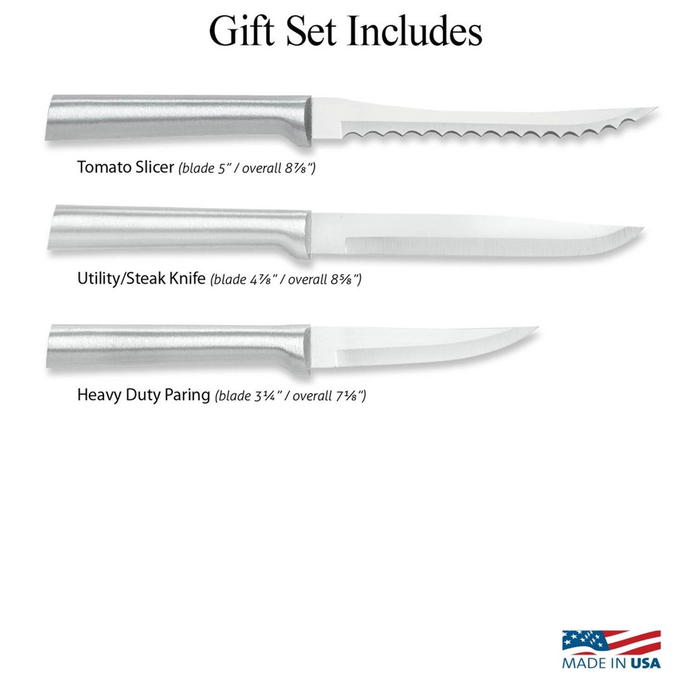 Sharp Knives That Last - USA Made! This 3-piece Cooking Essentials Gift Set includes three well-loved classics from Rada (who has been crafting USA-Made knives since 1948!) Whether purchasing as a gift or for your own home, these knives make food prep a breeze. Give it a try and you'll discover immediately why we call it essential. 3-piece set includes: Heavy Duty Paring Knife, Utility/Steak Knife, and Tomato Slicer. A great gift for any cook (including yourself!). Knives are hollow ground to achieve and maintain a sharp edge that lasts. Hand-sharpened surgical-grade T420 high-carbon stainless steel blades. Silver cast aluminum handles (the original Rada handle). Set comes nicely packaged in a box. Hand wash. USA made in the Midwest since 1948 Visit Our Store Contact Us Rada Knives Cooking Essentials Gift Set - 3 pcs Sharp Knives That Last - USA Made! This 3-piece Cooking Essentials Gift Set includes three well-loved classics from Rada (who has been crafting USA-Made knives since 1948!) Whether purchasing as a gift or for your own home, these knives make food prep a breeze. Give it a try and you'll discover immediately why we call it essential. 3-piece set includes: Heavy Duty Paring Knife, Utility/Steak Knife, and Tomato Slicer A great gift for any cook (including yourself!) Knives are hollow ground to achieve and maintain a sharp edge that lasts Hand-sharpened surgical-grade T420 high-carbon stainless steel blades Silver cast aluminum handles (the original Rada handle) Set comes nicely packaged in a box Hand wash USA made in the Midwest since 1948 More About Rada Meticulously crafted one at a time, using a dozen or more steps, Rada knives are hand-sharpened and made from surgical-grade high-carbon stainless steel, so blades stay sharp! Every Rada product is 100% made in the USA, from raw materials all the way through construction. For Best Care As with all fine cutlery, hand wash and dry immediately. Hand washing helps protect the blades' cutting edge and helps protect your knives from corrosion. What's Included: Heavy Duty Paring Knife: Blade 3-1/4", Total length 7-1/8" Utility/Steak Knife: Blade 4-7/8", Total length 8-5/8" Tomato Slicer: Blade 5", Total length 8-7/8"