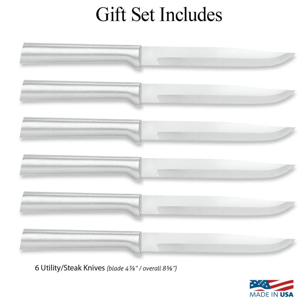 Quality USA Steak Knives - Ready for Gifting! Designed with a super-sharp 4-7/8" straight-edge blade, the Utility/Steak Knives are some of Rada's most popular. These indispensable kitchen knives have a 4-7/8" blade that cuts through virtually any food. Their perfectly sized handles guarantees a good grip. Set of 6 steak knives. Perfect for equipping your own kitchen or for giving as housewarming, wedding and holiday gifts. They glide through food easily, whether used at the table or for meal prep. Finger guard protects fingers while cutting. Crafted of super-hard surgical-grade T420 high-carbon stainless steel for a blade that retains its edge and remains incredibly sharp. Silver cast aluminum handles (the original Rada handle). Set comes nicely packaged in a gift box Visit Our Store Contact Us Rada Utility Steak Knives Gift Set - 6 pcs Quality USA Steak Knives - Ready for Gifting! Designed with a super-sharp 4-7/8" straight-edge blade, the Utility/Steak Knives are some of Rada's most popular. These indispensable kitchen knives have a 4-7/8" blade that cuts through virtually any food. Their perfectly sized handles guarantees a good grip. Set of 6 steak knives Perfect for equipping your own kitchen or for giving as housewarming, wedding and holiday gifts They glide through food easily, whether used at the table or for meal prep Finger guard protects fingers while cutting Crafted of super-hard surgical-grade T420 high-carbon stainless steel for a blade that retains its edge and remains incredibly sharp Silver cast aluminum handles (the original Rada handle) Set comes nicely packaged in a gift box Hand wash only Blade Length: 4-7/8"L Overall Length: 8-5/8"L USA made by Rada since 1948 More About Rada Meticulously crafted one at a time, using a dozen or more steps, Rada knives are hand-sharpened and made from surgical-grade high-carbon stainless steel, so blades stay sharp! Every Rada product is 100% made in the USA, from raw materials all the way through construction. For Best Care As with all fine cutlery, hand wash and dry immediately. Hand washing helps protect the blades' cutting edge and helps protect your knives from corrosion. What's Included: Six 4-7/8" Utility Steak Knives Note: Blade length is referenced above.