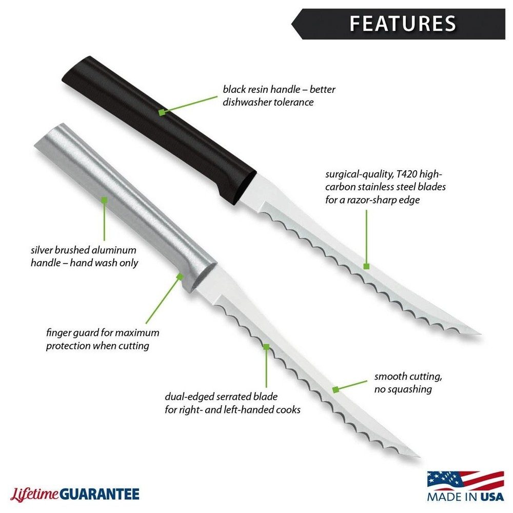 This knife is a game-changer in the kitchen! The dual serrated blade glides through tomatoes, peppers, and even delicate berries without crushing them. The comfortable stainless-steel resin handle feels sturdy, and it’s great that it’s dishwasher safe. Love that it’s made in the USA and comes with a lifetime warranty. Perfect for both left and right-handed users—highly recommend for effortless slicing!