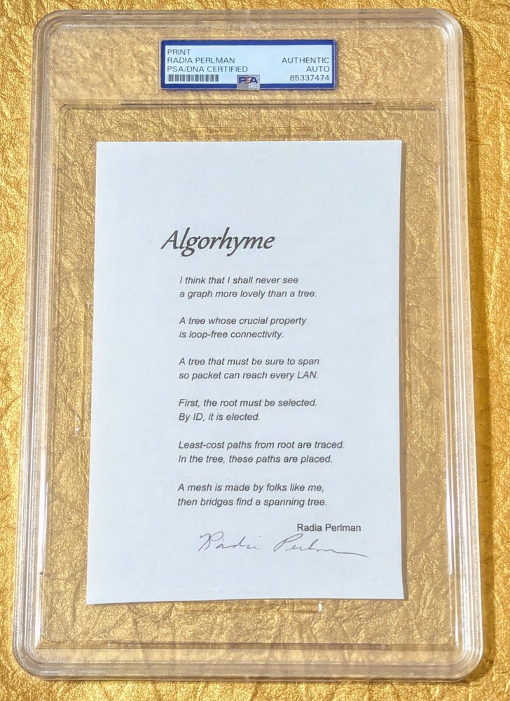 You Have Just Landed on MOONGRAPHS Your Journey into Investment Grade Autographs is Ready for Liftoff! 3...2...1...Enjoy The Exploration. MOONGRAPHS Presents: Radia Perlman Autograph Signed Algorhyme Poem PSA DNA 'Mother of The Internet'. Total size: Autographs Featured on MOONGRAPHS are Certified 100% Authentic by P S A/DNA Authentication Services. P S A/DNA is the world's leading third-party Authentication service for autographs and memorabilia. P S A/DNA uses state-of-the-art, proprietary advanced technology to provide security and protection utilizing their four-level Authentication process. This Autograph is Protected by Encapsulation. P S A/DNA has Authenticated and evaluated this autograph, and to reinforce it's Guarantee of Authenticity it has been Encapsulated in P S A/DNA's sonically sealed, tamper-evident holder, safe, secure and ready to display.