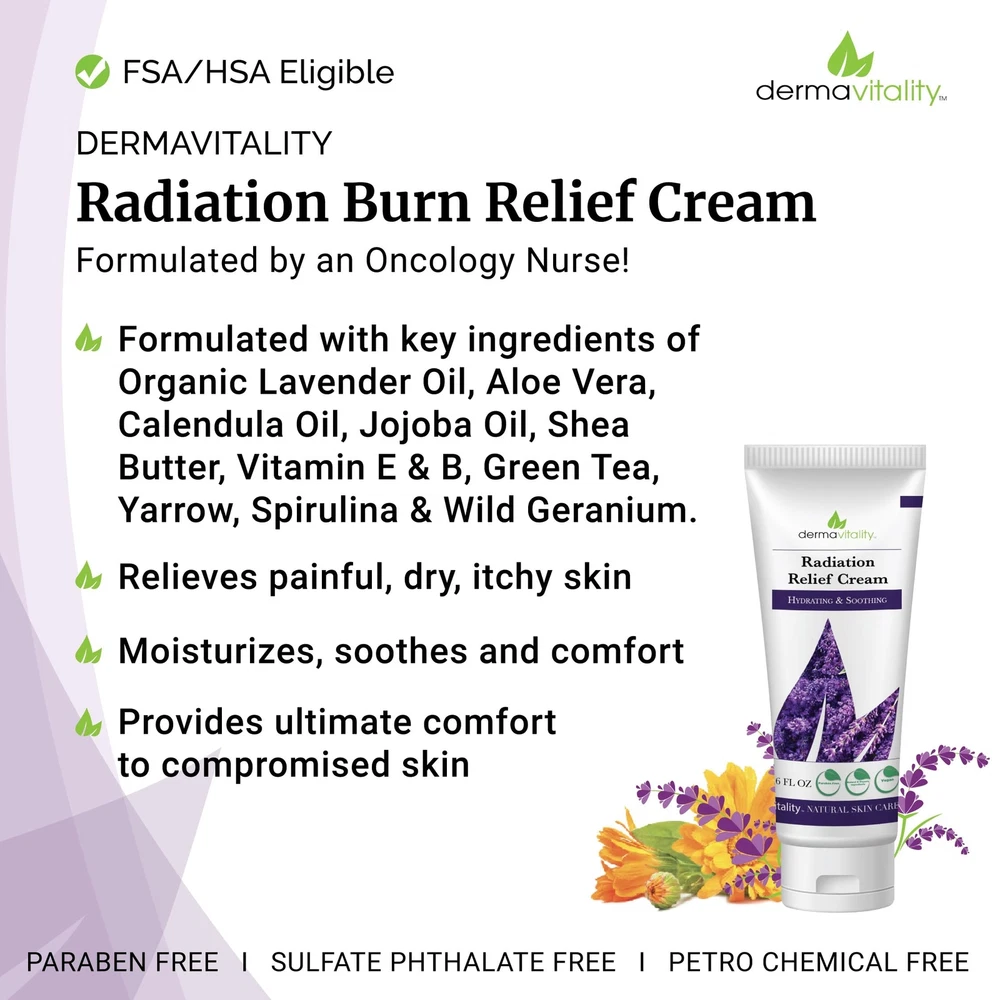 All Natural Radiation Cream PARABEN, PHTHALATE AND PETROCHEMICAL FREE: Dermavitlity Radiation Burn Cream is made with plant-based, organic, and natural ingredients. Our Lotion for Radiation burns moisturizes, hydrates, and soothes your skin. FORMULATED BY AN ONCOLOGY NURSE: Dermavitality's calendula oil-based cream for radiation treatment is formulated by an oncology nurse with over 10 years of experience. Recommended – Nurse and a physician recommended skin recovery cream to calm and soothe your skin. NON-GREASY FAST ABSORBING: Dermavitality Lotion for radiation therapy is rich and creamy, it glides on gently, is not greasy, absorbs quickly will not stain your clothes and is comforting and soothing, You can put it in the refrigerator for ultimate cooling . RELIEVES, IRRITATED DRY ITCHY SKIN: Dermavitality Radiation Cream is made with Calendula oil, Shea Butter, botanical organic aloe vera, calendula, botanical hyaluronic acid, shea butter, organic jojoba, Irish moss, spirulina and organic gotu kola and other that provide cooling soothing . CALMING LAVENDER SCENT: Dermavitality Botanical Cream does not contain any artificial fragrance or perfumes. It is made with therapeutic lavender oil scent offers a light, pleasant that is calming and relaxing. Made in USA.