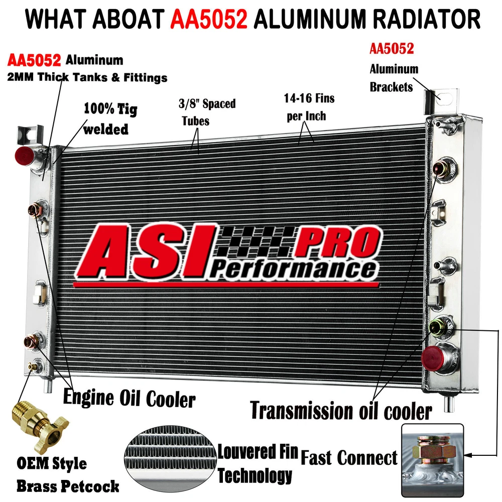 DELIVERY PAYMENT RETURNS WARRANTY FEEDBACK Store Home Car&Truck Radiator Oil Tank/Can Arms/Carrier Motorcycle Radiator Intercooler&Kit Exhaust Head Pipe Radiator Intercooler Hose Pipe Cooling Thermo Fans&relay Radiator Cap&Filler Neck&Plug Other Products DESCRIPTION Package Include: 1 x 2-Row AA5052 Aluminum Radiator Radiator Size : Condition : New Row: 2 Rows Core Material: Full Aluminum Core Size: 37 1/2" W x 19 3/5" H Overall Size: 42 8/9'' W x 23 3/8'' H I nlet: 1 1/2'' O utlet: 1 7/9'' Trans mission Oil Cooler: 7/8-14UNF Engine Oil Cooler: 7/8-14UNF Transmission: Automatic / Manua l Petcock Drain: OEM Style Brass Petcock Drain High Performance Racing Spec. Fitment: Year Make Model Engine 2002 GMC B7 8.1L 496Cu. In. V8 GAS OHV Naturally Aspirated 2001 GMC B7 8.1L 496Cu. In. V8 GAS OHV Naturally Aspirated 2002 GMC C6500 Topkick 8.1L 496Cu. In. V8 GAS OHV Naturally Aspirated 2001 GMC C6500 Topkick 8.1L 496Cu. In. V8 GAS OHV Naturally Aspirated 2002 GMC C7500 Topkick 8.1L 496Cu. In. V8 GAS OHV Naturally Aspirated 2001 GMC C7500 Topkick 8.1L 496Cu. In. V8 GAS OHV Naturally Aspirated 2002 GMC Sierra 2500 HD 8.1L 496Cu. In. V8 GAS OHV Naturally Aspirated 2001 GMC Sierra 2500 HD 8.1L 496Cu. In. V8 GAS OHV Naturally Aspirated 2002 GMC Sierra 3500 8.1L 496Cu. In. V8 GAS OHV Naturally Aspirated 2001 GMC Sierra 3500 8.1L 496Cu. In. V8 GAS OHV Naturally Aspirated 2002 Chevrolet Silverado 2500 HD 8.1L 496Cu. In. V8 GAS OHV Naturally Aspirated 2001 Chevrolet Silverado 2500 HD 8.1L 496Cu. In. V8 GAS OHV Naturally Aspirated 2002 Chevrolet Silverado 3500 8.1L 496Cu. In. V8 GAS OHV Naturally Aspirated 2001 Chevrolet Silverado 3500 8.1L 496Cu. In. V8 GAS OHV Naturally Aspirated Upgrade Performance : 1.Made from Aircraft AA5052 grade aluminum for prolonged lifespanand with raw aluminum finish 2.Brazed core technology to guarantee optimum performance and dependability 3.All AA5052 Aluminum 2mm thick tanks and fittings,Ensure it's hard and durable 4.OEM style brass petcock drain much better than other plastic one on eBay 5.Carefully crafted to exceptional OE standards for precise fit. D escription: Our Radiator is made of AA5052 aircraft aluminum. Its different from other sellers T-3303 Series. In fact, AA5052 series Aluminum is much better than T-3303 series. More than 90% of aftermarket manufacturers use the T-3303 series Aluminum , because it is cheaper and easier to get the material. However, T-3303 aluminum has many disadvantages, such as poor polishing effect, softness, easiness to scratch and corrode, poor heat dissipation effect. If the T-3303 aluminum radiator is operated in high pressure and high temperature for a long time, the leaking problem would occur very soon. AA5052 Aluminum is an Al-Mg alloy with good corrosion resistance, excellent reliability and cold work ability and strength. The main alloying element of AA5052 is magnesium, which has good forming and processing properties. It is widely used in the manufacture of aircraft fuel tanks, oil pipes, and sheet metal parts of transportation vehicles and ships, hardware products, and electrical-appliance casings. This AA5052 Aluminum Radiator is designed to provide maximum cooling efficiency to prevent premature engine failure. Its light-weight, and high-heat transferring aluminum features a tube and fin design that, dramatically increases surface area that enables the heat to dissipate more efficiently. This AA5052 Aluminum Radiator is at least 30%-45% more efficient than stock ones. Most importantly, it has a much higher capacity for coolant than stock ones, which means that your cooling system will be more efficient and will be more resistant to temperature surges in racing applications. RETURN & EXCHANGE DELIVERY PAYMENT RETURNS WARRANTY FEEDBACK DELIVERY Paypal ONLY --the easiest and most secure way to pay on line PAYMENT All orders will be sent within one business day after payment received. Note: Please contact for quote if international postage NOT display. (shipping and handling charge is only for the lower 48 states in USA, other states'[Alaska, Hawaii, and Puerto Rico etc.]shipping cost , please contact us for quote.) RETURNS A new return is considered a brand new item that you ended up not needing or perhaps you purchased incorrectly for your specific vehicle. Please keep in mind that spending time before purchasing the part to confirm it is indeed exactly what you need can help prevent you from ordering the wrong part. Please remember to email us which warehouse to send the item back before return. And all returns must be shipped back in their original factory packaging. Shipping Damage Shipping damage is any item/package suspected of being broken or damaged in anyway during the shipping process. We purchase full insurance for this, however the damage must be reported to us within 3 days of receiving the package. WARRANTY 1 Year warranty against manufacture defect. Replace/return are available if buyers receive wrong/damaged/defective items. For replacement or return , buyer should keep the item in acceptable packing. Before replace or return ,buyer should submit proof to us by pics if possible. Anyway ,by nice communications ,we can find a way to make you satisfied FEEDBACK Very appreciated for your support. I hope you are happy with your purchase. We maintain high standards of excellence and strive for 100% customer satisfaction! Feedback is very important to us. We request that you contact us immediately BEFORE you give us or feedback, so that we can satisfactorily address your concerns. If you have any problem, please feel free to contact us via ebay message, we will reply your email within 24 hours (except weekends and holidays). We will do our best to solve your problem as soon as possible. We appreciate your continued patience and willingness to work with us. Thank you for choosing us and have a great day! DELIVERY PAYMENT RETURNS WARRANTY FEEDBACK Copyright ? ASI_coolingsupport. All Rights Reserved. Package Include: 1 x