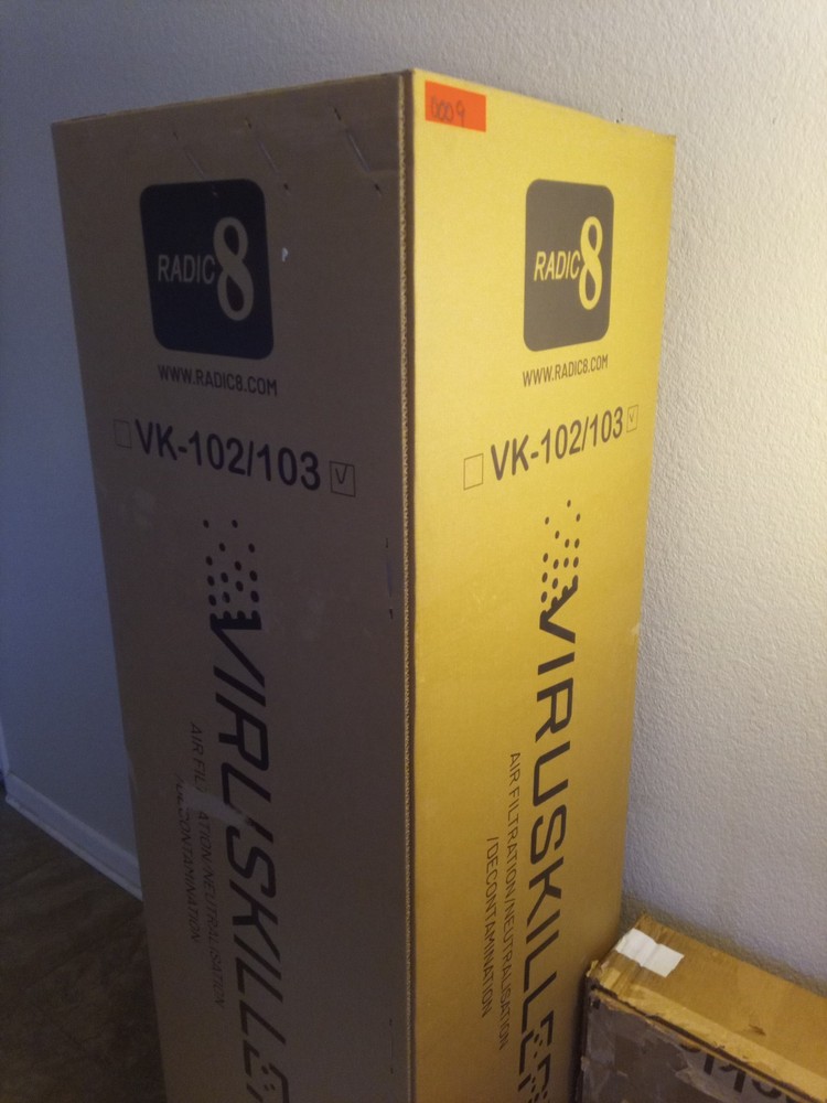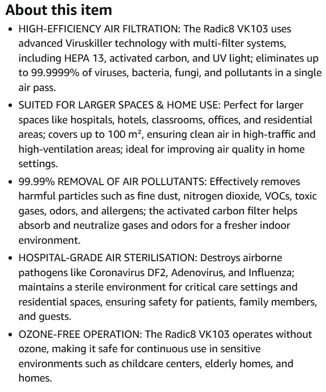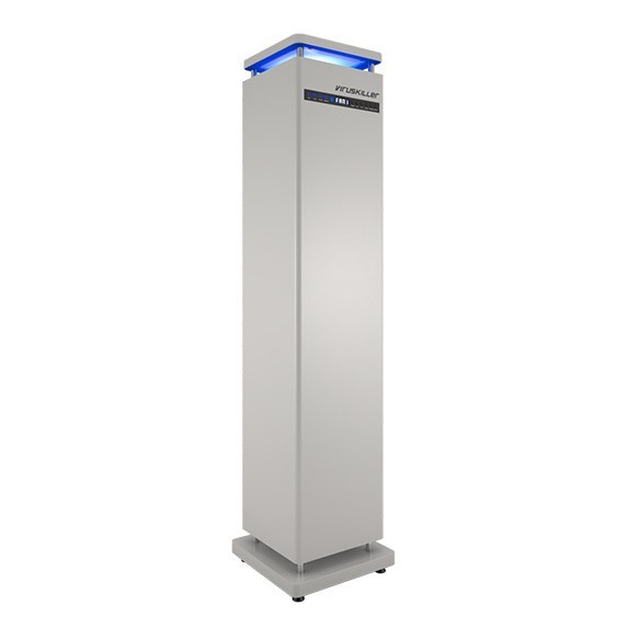 The VIRUSKILLER Radic8 VK103 Air Filter & Air Sterilizer is a high-capacity air purifier designed for both commercial and home use, covering up to 100 m². Utilizing Viruskiller technology, it eliminates up to 99.9999% of airborne viruses, bacteria, fungi, and harmful gases. Equipped with HEPA 13, activated carbon filters, and UV-C lamps, the VK103 removes ultra-fine dust, nitrogen dioxide, VOCs, toxic gases, and allergens, providing cleaner, healthier air. The activated carbon filter absorbs and neutralizes odors and gases for a fresher indoor environment. Ideal for high-traffic areas such as hospitals, offices, schools, and homes, the VK103 ensures a sterile environment, neutralizing pathogens like Coronavirus DF2, Adenovirus, and Influenza. Its ozone-free operation makes it safe for continuous use in sensitive environments like childcare centers and elderly homes. With its free-standing design and high airflow capacity, the VK103 is perfect for any space needing superior air quality control, whether in a commercial setting or at home.