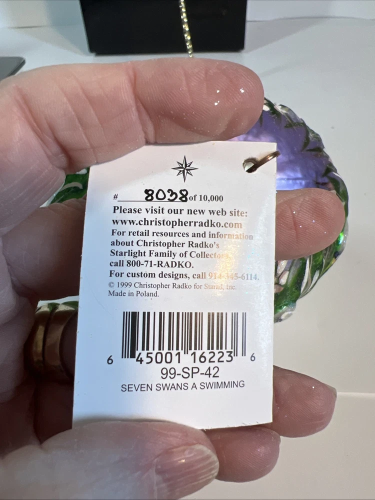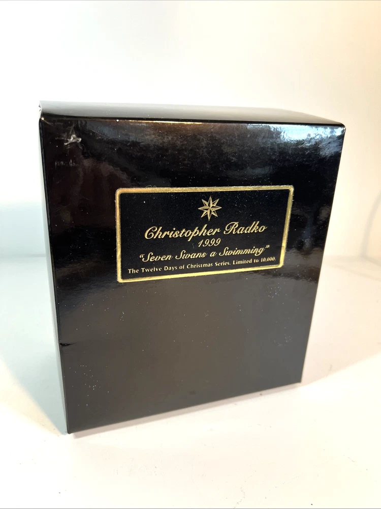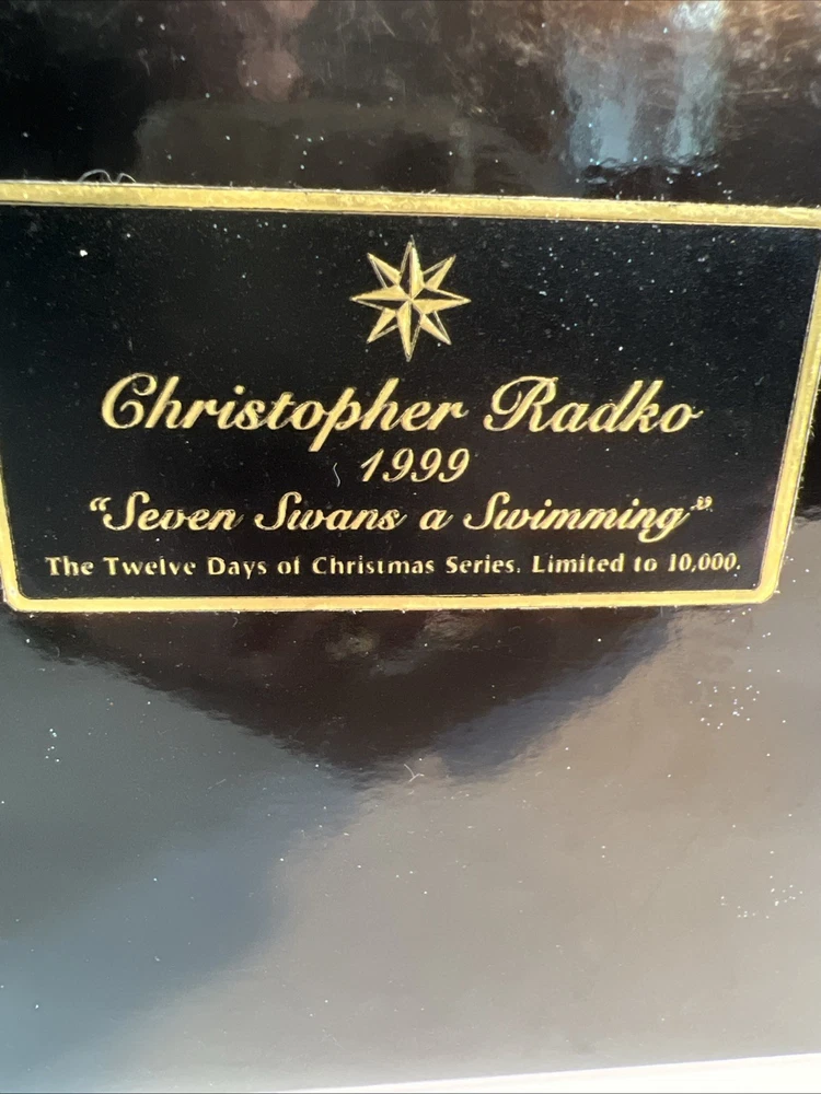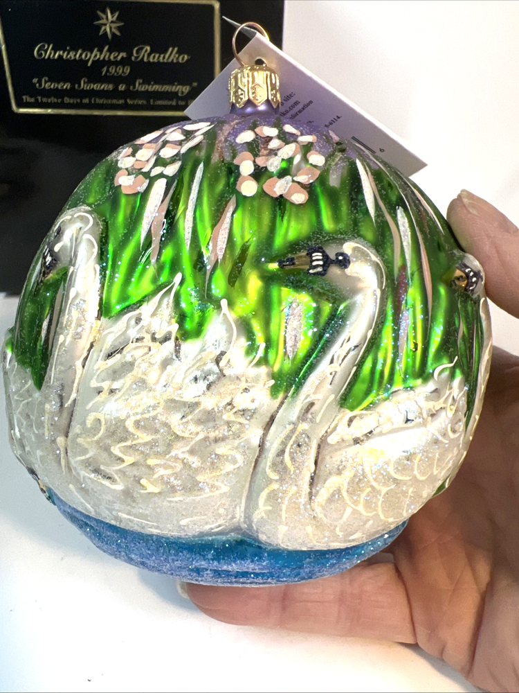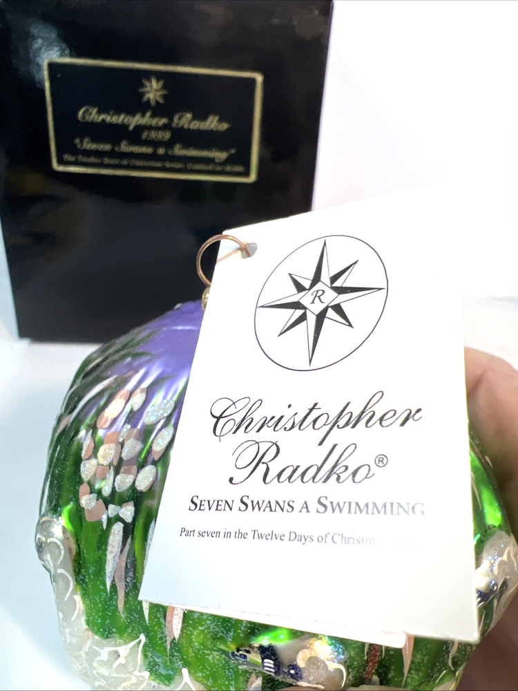 The Radko SEVEN SWANS A SWIMMING Christmas Ornament is a vintage collectible from the 12 Days of Christmas series. Handmade of glass, this multicolor ornament was manufactured in 1999 by the renowned brand Christopher Radko. This limited edition ornament is a unique and festive addition to any holiday decor collection, perfect for adults who appreciate art glass pieces. I will pack with care and get it to you ASAP thanks for looking !