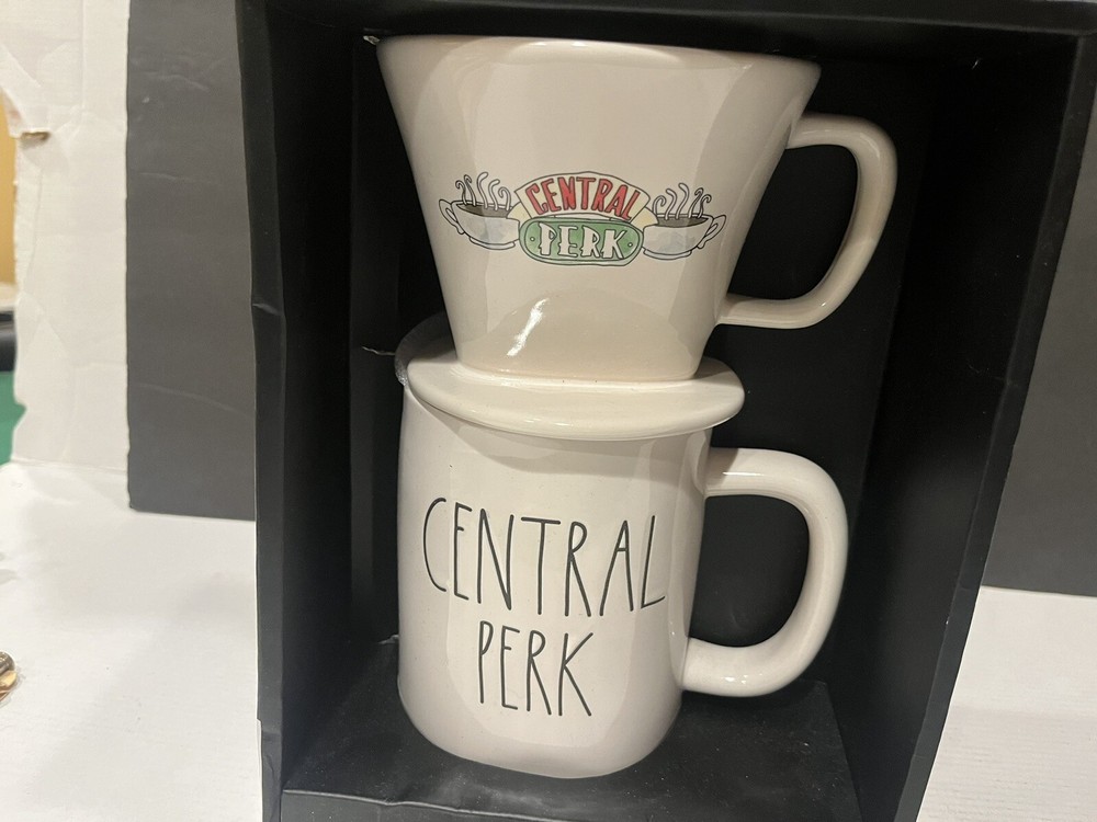 Enjoy your favorite hot beverage with this stylish Rae Dunn F•R•I•E•N•D•S TV Show Central Perk Coffee Drip & Mug Set. The set features a 19.5 oz capacity mug and a coffee drip that will keep your coffee fresh and flavorful. The mug and drip are made of high-quality ceramic material and are both dishwasher and microwave safe. Perfect for all occasions, this set is a great addition to any coffee or tea lover's collection. The white color and farmhouse pattern give it a vintage look, while the Friends theme adds a touch of nostalgia. Made in China, this original Rae Dunn Artisan Collection set is sure to impress. E
