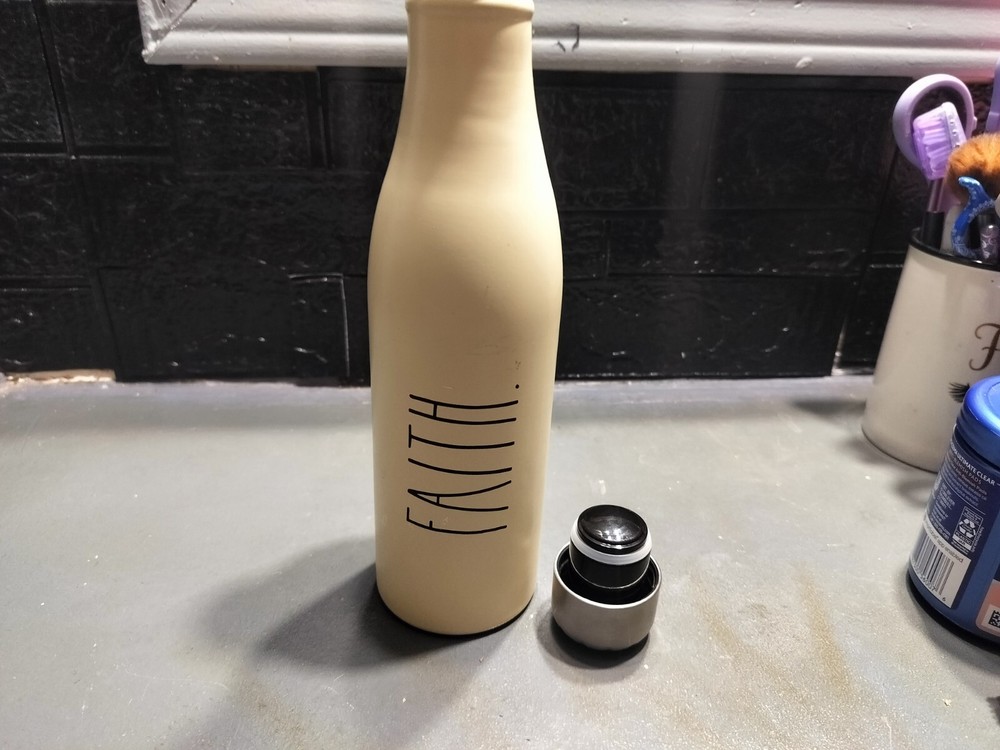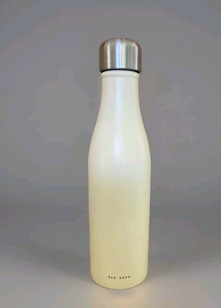 The Rae Dunn Stainless Steel Cup Faith is a designer bottle with a screw-on lid in beige color. It has a 22 fl oz volume, made of stainless steel, and features BPA-Free, Phthalate-Free, wide mouth, double wall insulation, vacuum wall, leakproof, child-resistant cap, and is both reusable and refillable.