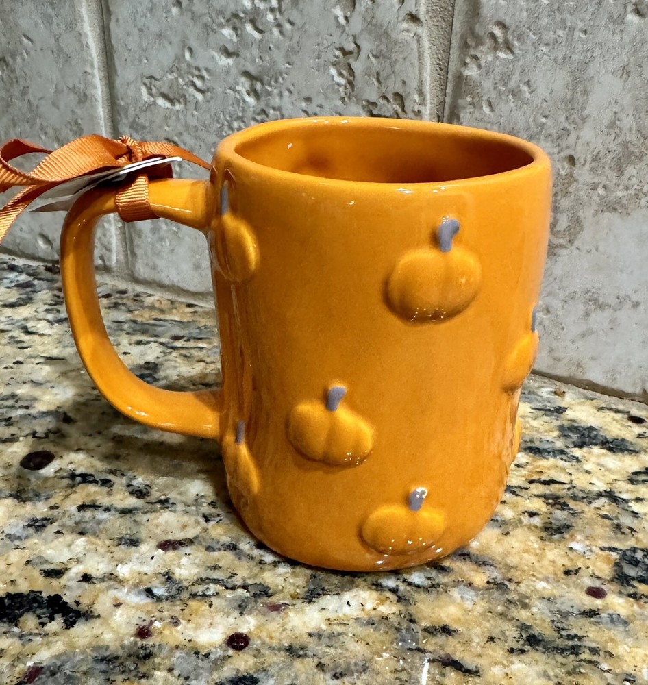 Rae Dunn PUMPKIN SPICE Orange Mug With Raised Pumpkins Fall Vibes NEW With Tags Colors may appear different depending on screen or monitor viewed on.