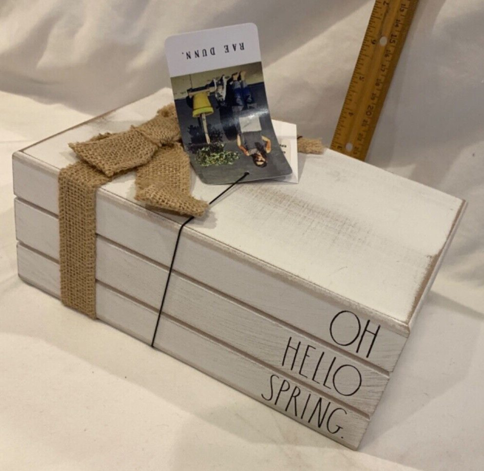 This farmhouse style display box is designed to resemble a wood crate and heaters the greeting "Oh Hello Spring". Designed by the artist Rae Dunn, you can use this box as a base to display other items, or just by itself on a shelf or countertop. The box measures 9"W x 6"D x 4"H.