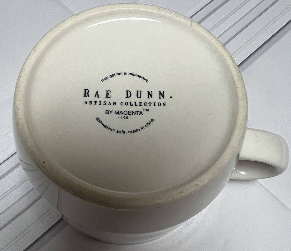 Number of Items in Set:One PieceOrigin:CaliforniaItem Diameter:4.5 InVintage:NoProduction Technique:PotteryHandmade:NoBackstamp:PrintedShape:RoundTheme:AmericanSigned:NoFinish:GlossyItem Height:4 InchesTime Period Manufactured:2010-2019Production Style:Art PotteryBrand:Rae DunnOccasion:All OccasionsStyle:ContemporaryCountry/Region of Manufacture:ChinaDepartment:Unisex Adults,Teens,GirlsColor:WhiteOriginal/Licensed Reproduction:OriginalMaterial:CeramicProduct Line:Rea DunnPattern:ChocolateFeatures:Dishwasher Safe,Microwave Safe,Decorative,Decorated,With HandleType:MugCapacity:12 Oz