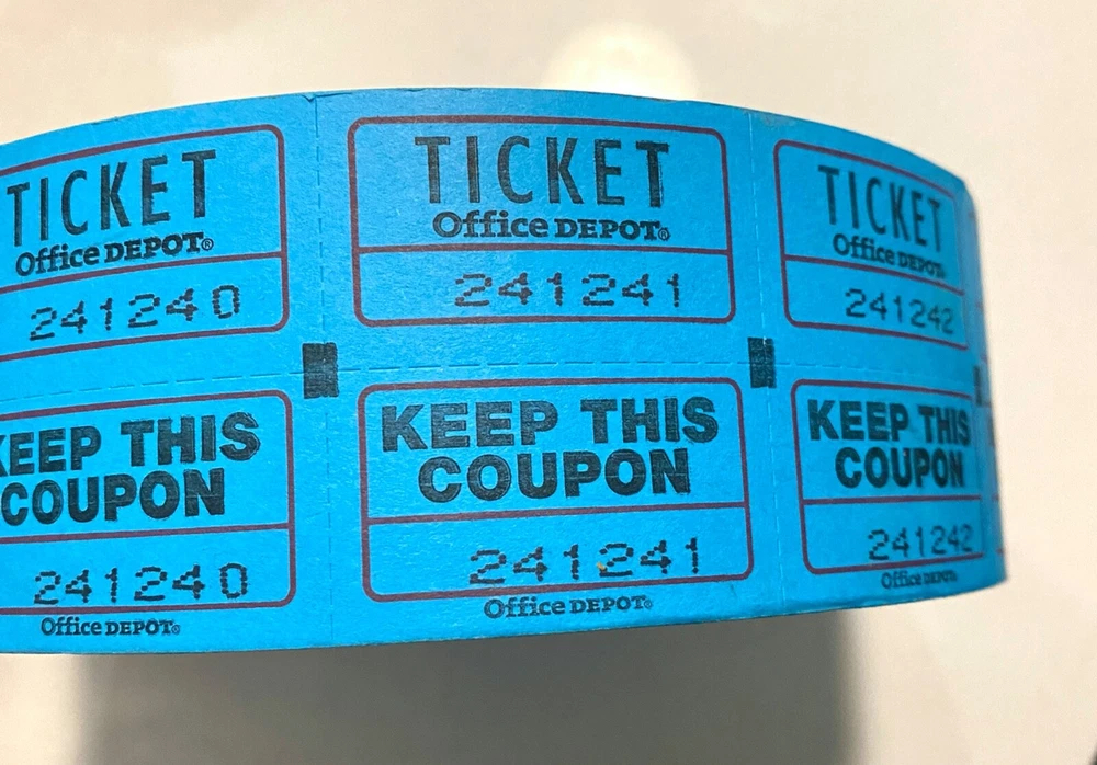 Raffle Ticket Roll Double Stub 50/50 “Keep This Coupon”, Office Depot Brand You will receive one (1) full roll of double stub 50/50 raffle tickets (2000 tickets) This roll is consecutively numbered The ticket portion in the back has lines for name, address, and phone Each ticket measures 1 3/4" long x 2" wide The roll color is blue What you see in the pictures is what you will receive. · If you have any questions, please ask before purchase.