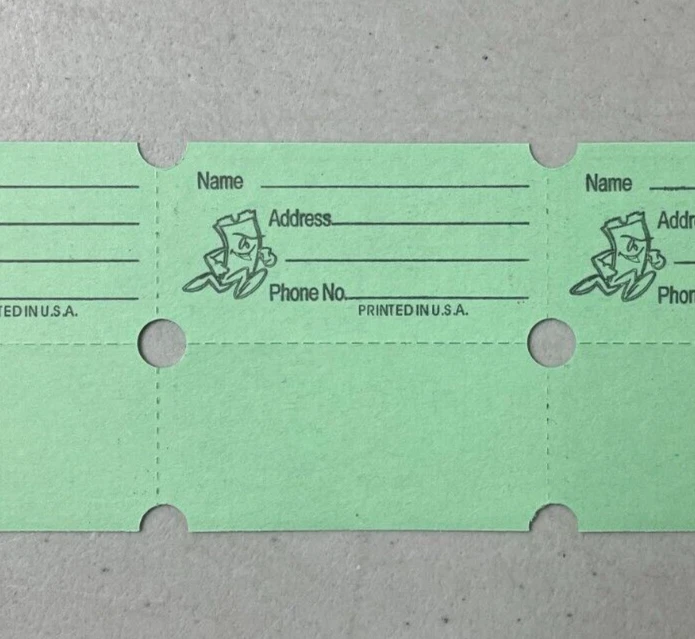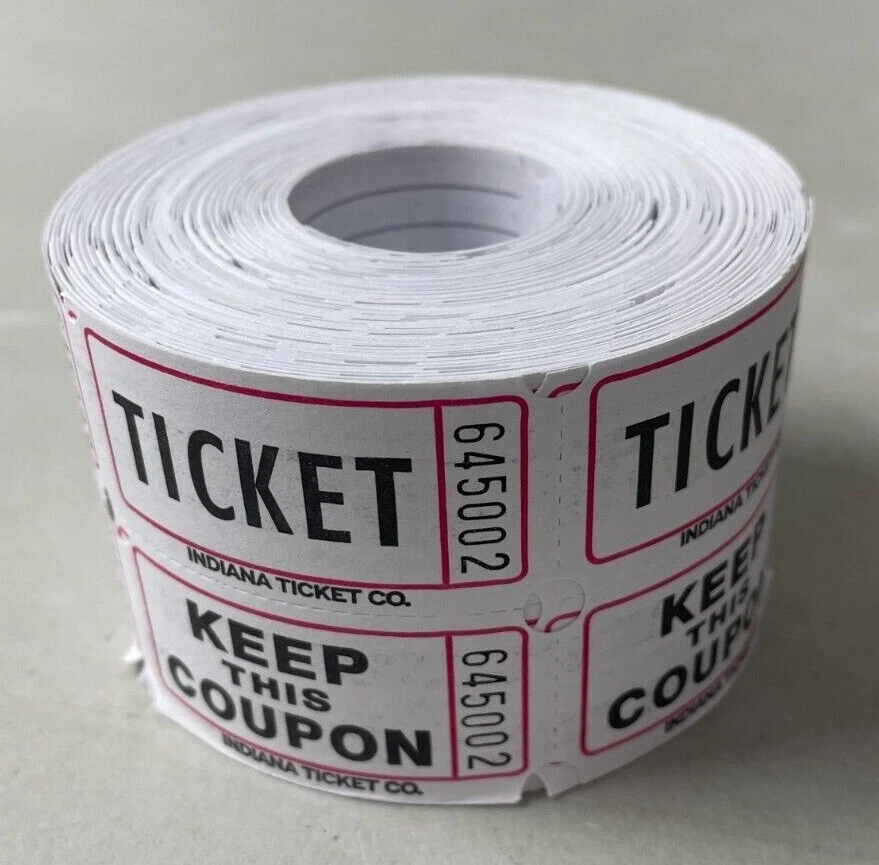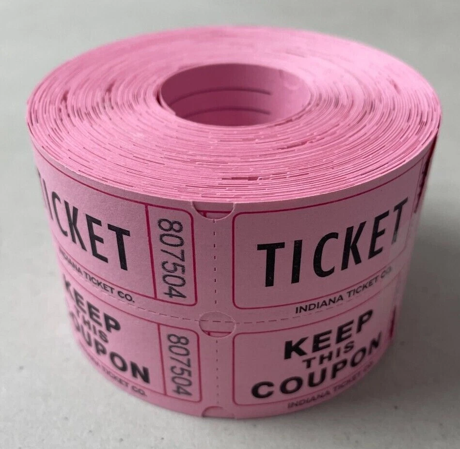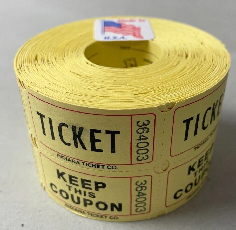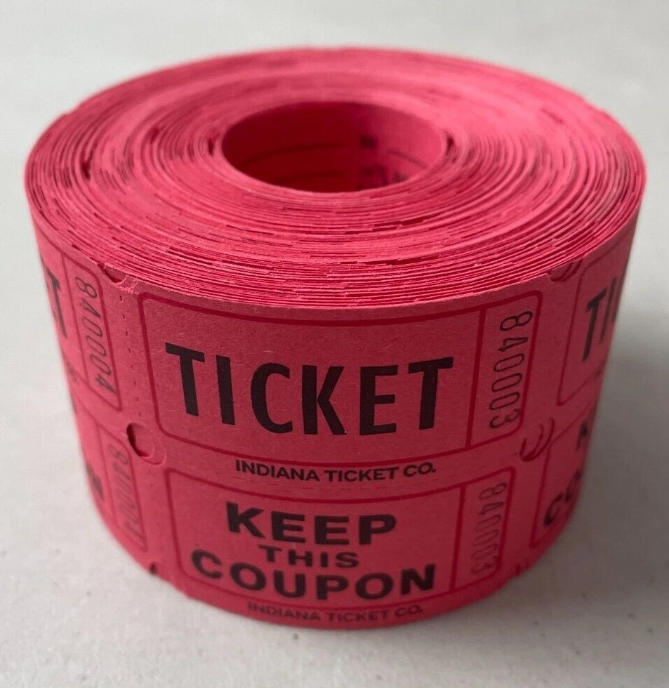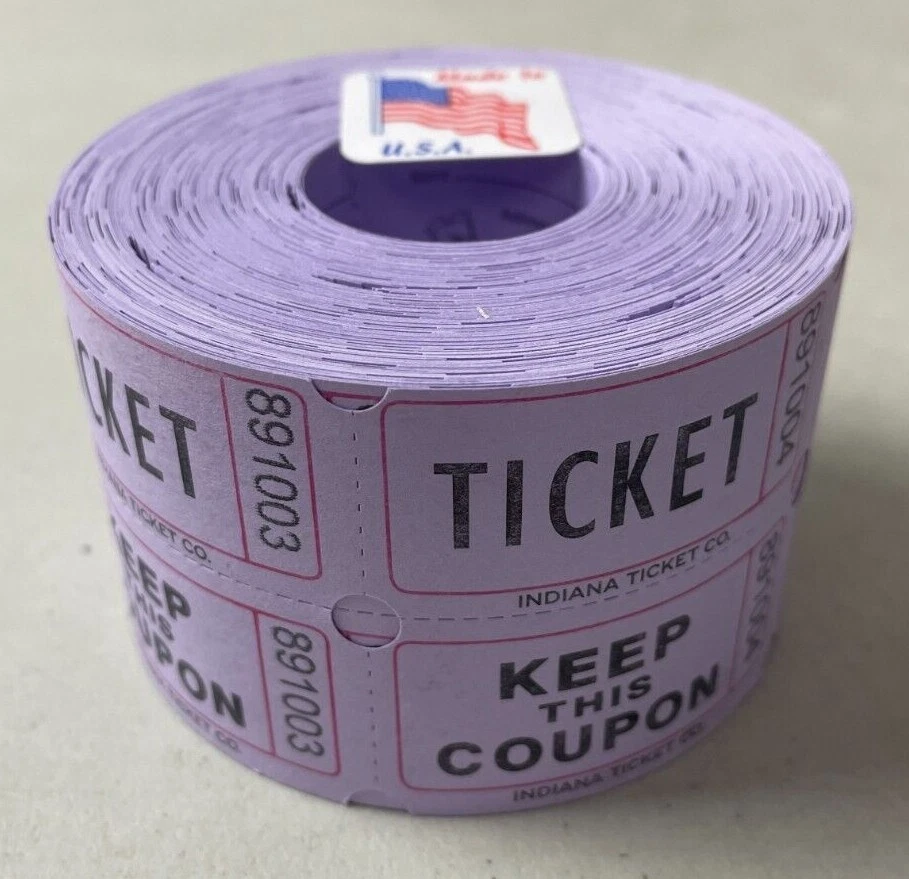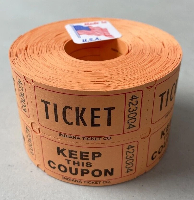 One Roll Standard Double Stub Raffle Tickets (500 Double Stub Per Roll) If you rip all of these tickets apart you will have 1000 single pieces Each Roll Will Be Consecutively Numbered Numbers Will Vary From The Pictures No Duplicate Numbers Per Order Guaranteed Ticket Portion Has Lines For Name, Address & Phone Keep This Coupon Portion is Blank on the Back Each Ticket Measures 1" X 2" Colors are Blue, Orange, Red, Lavender Purple, White, Light Pink, Yellow & Green Please ask any questions before buying. As always your satisfaction is guaranteed. If you are not satisfied for any reason just return your purchase for a full refund.