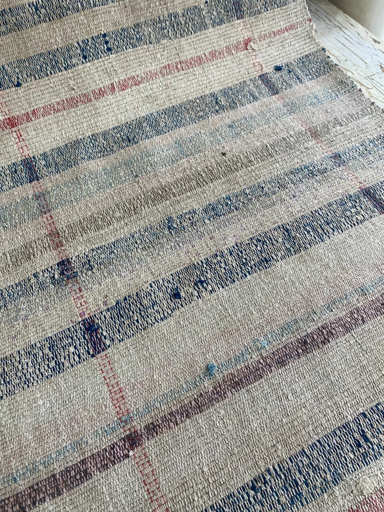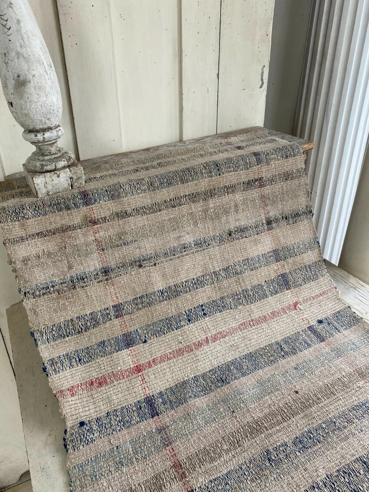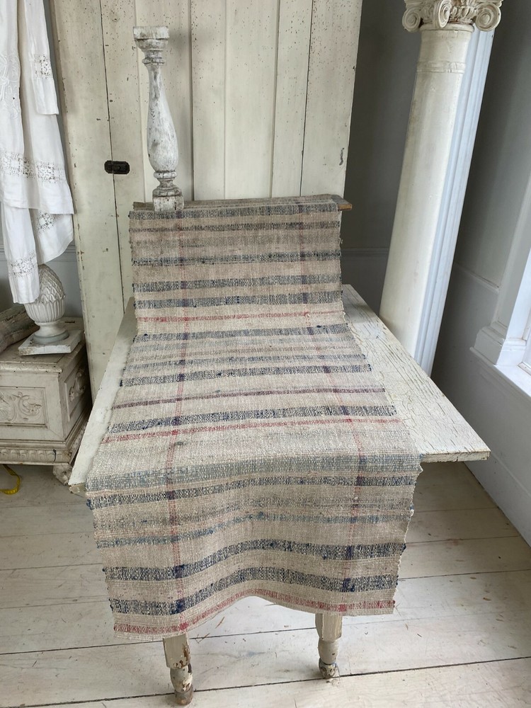 ~*~Hello and Welcome to the Textile Trunk~*~ Please follow us on Instagram! We are : textiletrunk Wonderful natural tones! This bolt is very dirty, but once cleaned I think it will be lovely !~ ( condition reflected in the price) ~*~ This lovely textile is a hand loomed rag rug from Europe, dating from the early to mid 1900's ~ . ~ Gorgeous farmhouse striped pattern and colors! This textile was woven by hand and used as floor covering. This bolt was woven with a cotton and sometimes a linen thread warp and the weft is woven with strips of various cloths! So many wonderful tones and colors. This textile would add so much flair to an interior ,Wonderful for a décor for a relaxed and fun vibe! ~ These textiles can be used in SO many ways : Ideal used as a hallway carpet, table runner, stair runner, place mats, bathmats, pillow and upholstery fabric, etc! ( please see condition details below) MEASUREMENTS : ~ This lovely piece measures about 25 inches wide by 1.75 yards ( * because these textiles are all woven by hand, the width can vary throughout the bolt as the weaver uses more or less tension! ~*~ The width on these textiles can vary by up to a few inches in places, giving that charming hand-made quality to these wonderful textiles ~*~) CONDITION : This rag rug is in as found, not freshly laundered condition.~ This bolt needs to go straight to the cleaners!!! It's being sold as damaged, but I think it will wash beautifully !! *~ These bolts were used as floor coverings and then put away, uncleaned! I've sold these wonderful textiles for many years now, and have never had an unhappy customer, however it's very important to know that it is necessary to dry clean before it can be enjoyed! It's dusty and often with visible dirt marks which will wash beautifully ~~*~ The unwashed condition is reflected in the price! ~ *~ There are some small , pale marks ~Light signs of time and use , often inherent in these wonderful antique textiles ~*~( please use the zoom feature on the photographs to view closely~) ( condition reflected in the price) Inventory number : 69Y6