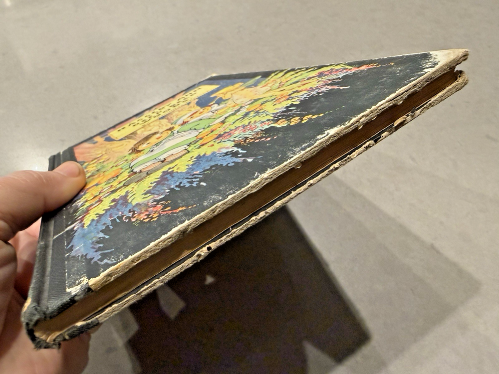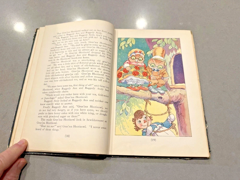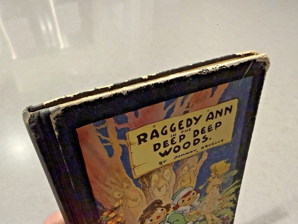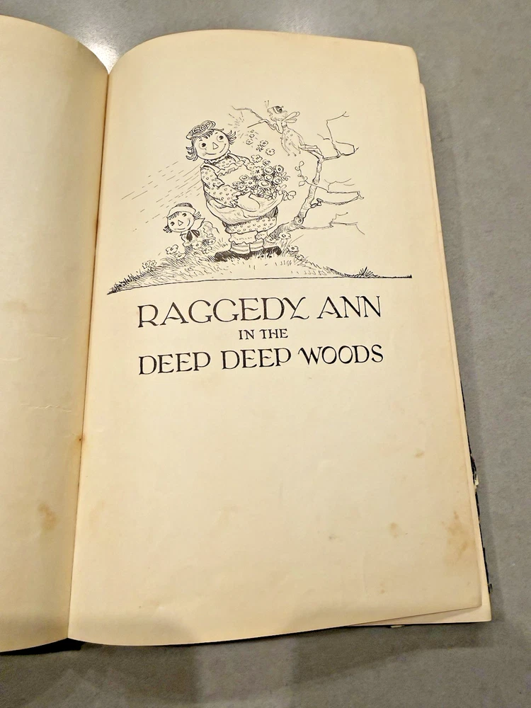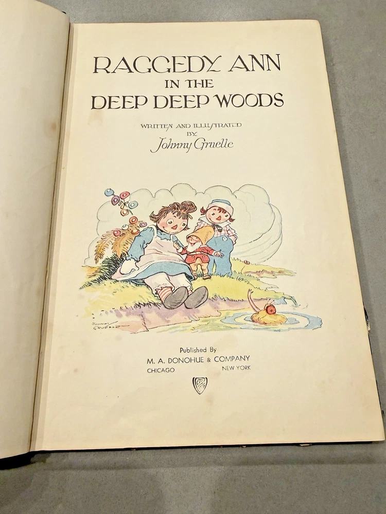 Raggedy Ann in the Deep Deep Woods Written and Illustrated by Johnny Gruelle Published by M. A. Donohue & Company, Chicago & New York Copyright 1924 Early hardcover edition featuring Gruelle’s classic full-color plates and charming line illustrations throughout. Original illustrated paper over boards with black cloth spine. Condition: • Covers display bright, attractive color • Moderate to heavy edge wear and chipping to board edges • Corners worn • Cloth spine intact and binding solid • Interior complete with all pages present • Noticeable staining to copyright and dedication pages • Some scattered age spotting to early and later pages • Color plates remain vibrant This is not a fine collector copy due to staining and board wear, but it remains complete and visually appealing with strong display presence. Please review all photos carefully as they are part of the description.