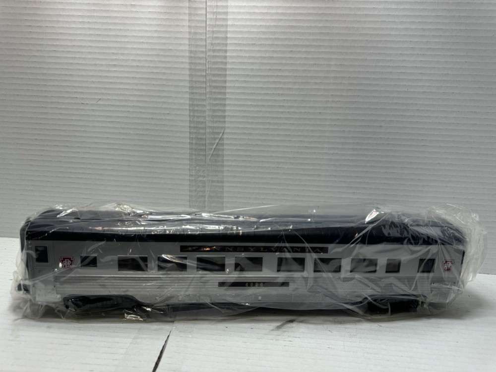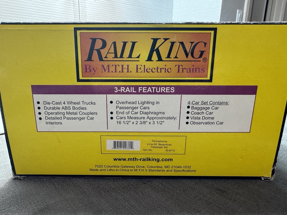 Railking o gauge Pennsylvania, four car 60 foot streamlined passenger set new inbox. Box does show somewhere from storage. No30-6715. If you have any questions, please feel free to message me thank you and have a good day.