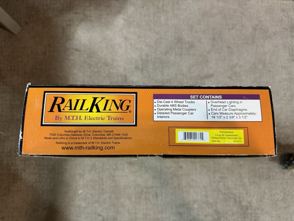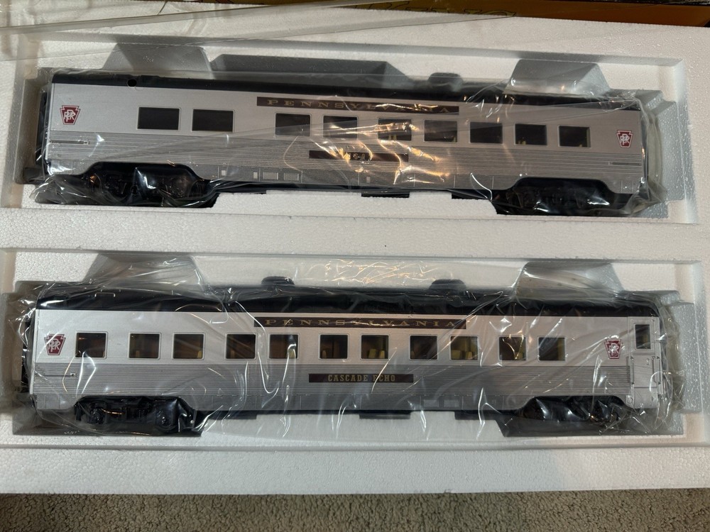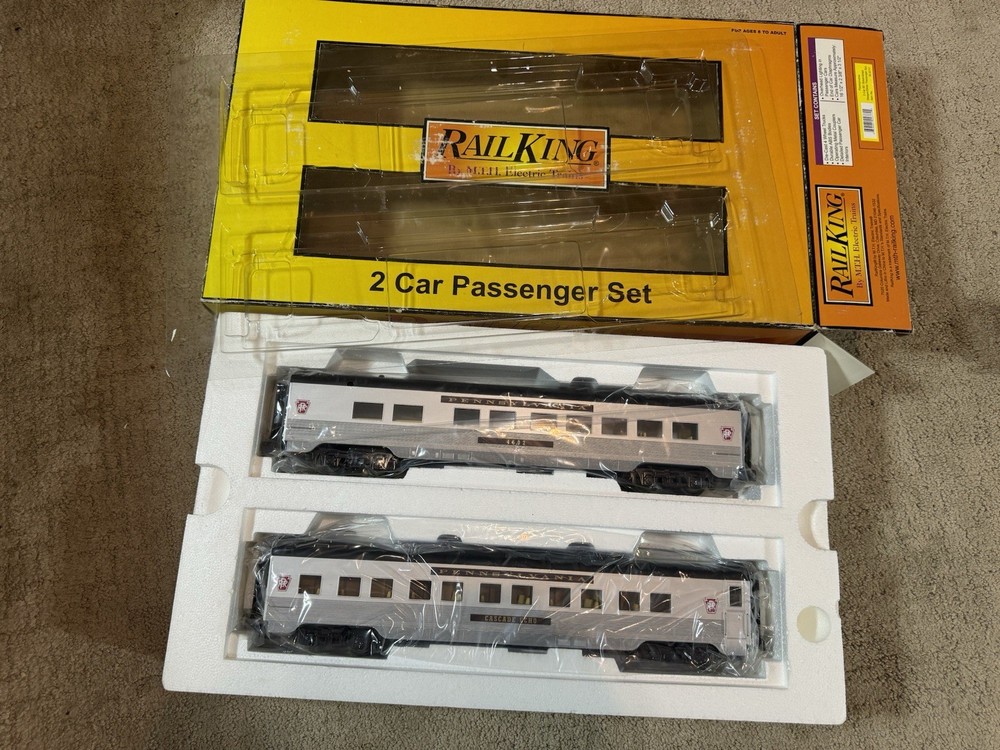 Railking o gauge Pennsylvania two car 60 foot streamlined sleeper and diner passenger set. Item number 30–6717. These are new in the box still wrapped in plastic. The box does show where from storage. If you have any questions, please feel free to message me thank you and have a good day.