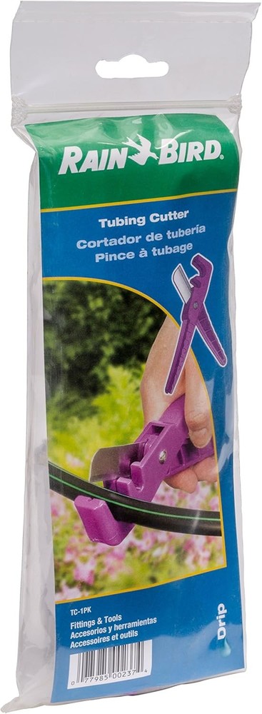 Rain Bird TC/1PKS Drip Irrigation Tubing Cutter, Cuts All Sizes Cutter Description Product Description Rain Bird TC/1PKS Drip Irrigation Tubing Cutter, Cuts All Sizes of Drip Tubing up to 3/4”. This high-quality tubing cutter easily cuts all sizes of Drip tubing to meet the unique needs of your sprinkler and irrigation system. Provides clean cuts with no jagged edges or crushing of tubing. Razor sharp stainless-steel blade cuts quickly and cleanly for faster installations. Unique design provides two different-sized wells (one for 1/2" to 3/4" tubing, and one for 1/4" tubing) providing more leverage so less force is needed to cut any tubing! Lightweight but sturdy construction. The ergonomic handle also doubles as a trenching tool to bury tubing in mulch or loose soil. Great for cutting LPDE pipe, vinyl tubing, Drip irrigation tubing, soaker hoses, clear vinyl tubes (CVT) and other "soft" tubes up to .750” outside diameter. Highly visible purple color allows tool to be easily seen in grass, soil, bark etc. Convenient plastic bag contains (1) tubing cutter. Replacement blade may be purchased separately: PPC-200XBLD. Rain Bird “The Intelligent Use of Water” From the Manufacturer Rain Bird Corporation is a privately held company founded in 1933 during the agricultural boom in California. We’re recognized as the #1 manufacturer and provider of irrigation products and services in the world. With sales offices around the globe; we offer over 4,000 water-saving irrigation products in more than 130 countries. Since the very beginning, Rain Bird has produced and offered the industry’s broadest range of high-quality irrigation products for: farms, golf courses, sports arenas, commercial developments and homes. Over the past 80-years Rain Bird has received more than 450 patents worldwide. Including the first one for irrigation in 1935 on our original impact-drive sprinkler (U.S. Patent #1,997,901) which revolutionized agricultural food-production and ushered in a new era in irrigation worldwide. In 1990 this original impact sprinkler was designated a historic landmark by the American Society of Agricultural Engineers. Our products cover all aspects of irrigation…timers/controllers, pop-up rotary sprinklers, pop-up spray head sprinklers, sprinkler nozzles, irrigation valves, Drip irrigation, drainage and much more. These products have been chosen and installed worldwide in the largest and most prestigious projects for residential, commercial, agricultural and golf course irrigation. Rain Bird is committed to The Intelligent Use of Water™ extending beyond products to education, training and services for the industry and the community. Our legacy is to design and manufacture only products of the highest value and quality. We’re grateful to have received numerous recognition awards from many of our valued partners. Rain Bird “The Intelligent Use of Water" Features: High-quality lightweight cutting tool; makes clean cuts with no jagged edges or crushing of tubing Works on all brands of 1/4" to 3/4" Drip irrigation tubing Razor sharp Stainless-steel blade and ergonomic handle Features recessed wells requiring less leverage and force Provides a faster, easier Drip system installation Highly visible purple color allows tool to be easily seen in grass, soil, bark, mulch etc Product Details: Product Dimensions: 1.57 x 1.25 x 8.38 inches Item Weight: 1.6 ounces Manufacturer: Rain Bird Item model number: TC/1PKS Is Discontinued By Manufacturer: No Handling We will ship all orders within 1 business day of payment. Delivery We Do Not Ship Outside of the Continental US. Return Policy All items qualify for returns within 30 days of receipt. Buyer is responsible for return shipping on any item that is not damaged. Feedback We take our reputation seriously, we buy and sell online, so we understand the value of trust. If you are unsatisfied with your order, please contact us and we will work with you to resolve it to your satisfaction.