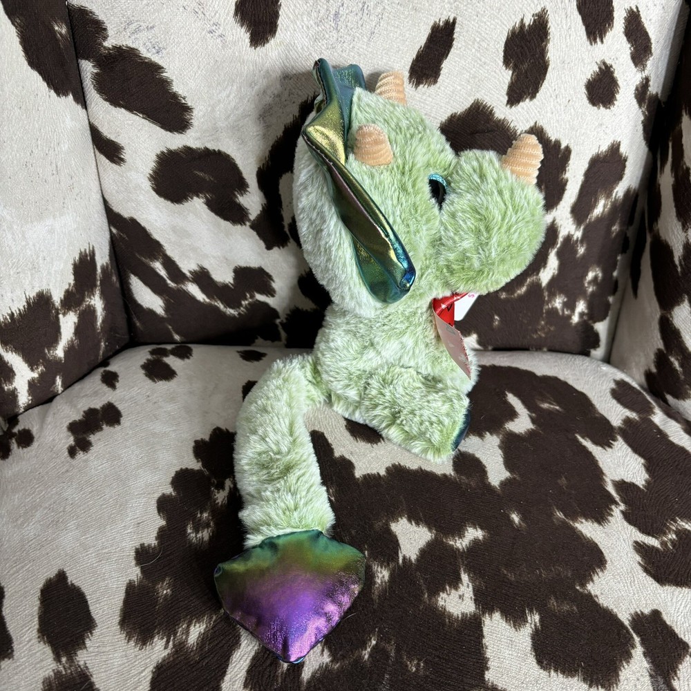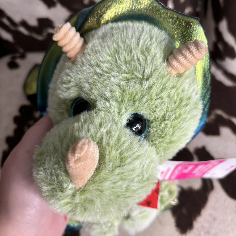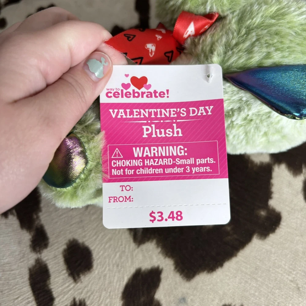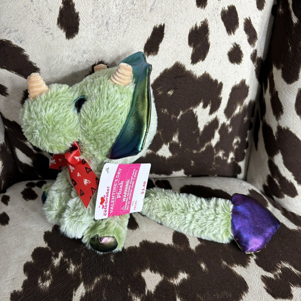 Way To Celebrate! Rainbow Holographic Ribbed Triceratops Valentines 7” Plush NWT Brand new with swing tags and tush tags intact. No tears/holes or stains on plush. Measures about 6.5”-7” tall. Light green triceratops dinosaur plush with ribbed beige horns, rainbow holographic spine and tail spike and a red ribbon/bow around its neck with hearts on it. One side of ribbon has light fraying.