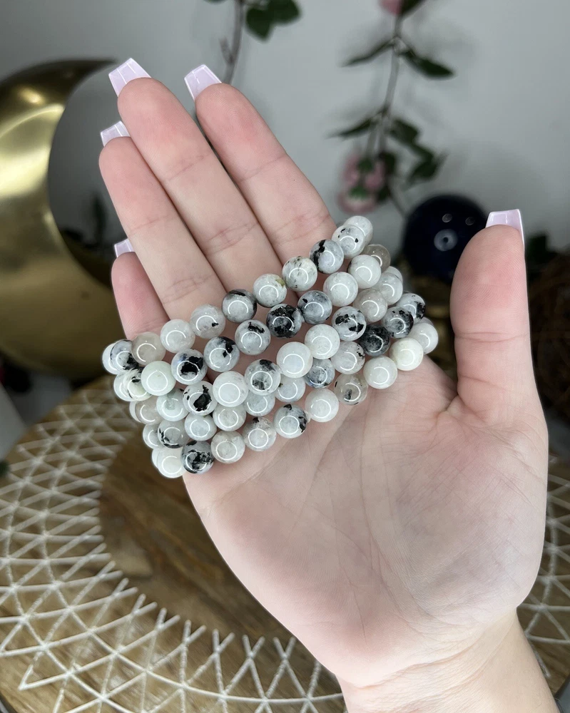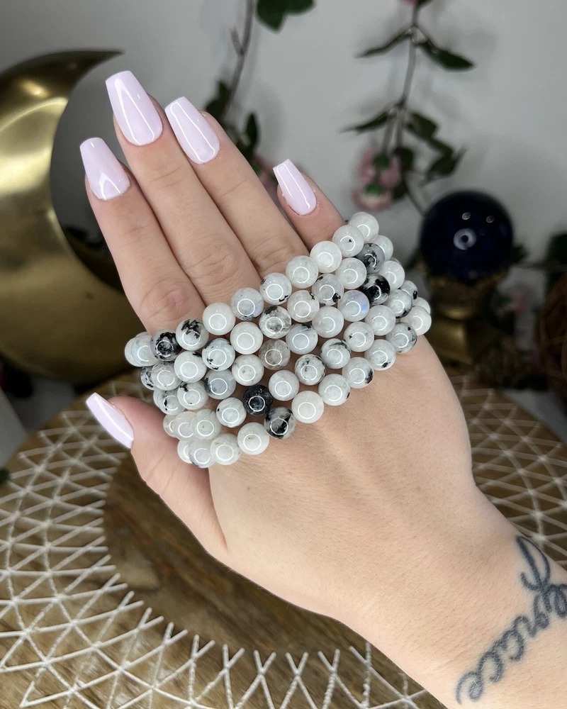 Listing is for one (1) Rainbow Moonstone bracelet. All are intuitively chosen. 8mm beads. Moonstone, the ethereal and enchanting crystal that embodies the mystical energies of the moon. Immerse yourself in the captivating allure of moonstone and experience its transformative properties that enhance intuition, promote emotional healing, and connect you to the divine feminine. With its shimmering iridescent glow and otherworldly beauty, moonstone is a symbol of divine feminine energy and lunar magic. This crystal reflects the soothing and nurturing energies of the moon, evoking a sense of calmness and serenity. As you connect with moonstone, its gentle vibrations envelop you, awakening your intuition and opening the doors to inner wisdom. Moonstone is known as the stone of new beginnings and emotional healing. Its luminous energy resonates with the crown and third eye chakras, enhancing your intuition and psychic abilities. With moonstone by your side, you'll experience a deepening of your connection to your inner self, intuition, and spiritual guidance. Embrace the transformative power of moonstone as it supports emotional healing and balance. Its calming energy helps to soothe emotional stress, anxiety, and uncertainty, fostering a sense of emotional stability and well-being. Moonstone encourages self-reflection, emotional healing, and personal growth, allowing you to release past wounds and embrace a renewed sense of emotional wholeness. Moonstone also enhances creativity and inspiration. Its mystical energy stimulates the imagination, inviting innovative ideas and artistic expression. Moonstone's gentle vibrations inspire a sense of wonder and curiosity, helping you tap into your creative potential and bring forth your unique gifts and talents. Beyond its emotional benefits, moonstone offers physical healing properties as well. It is believed to support hormonal balance, aid in fertility, and promote overall well-being. Moonstone's gentle energy can assist in alleviating menstrual discomfort, regulating the menstrual cycle, and promoting hormonal harmony. Each moonstone crystal is a unique work of art, showcasing its own mesmerizing play of colors and variations. From polished palm stones to exquisite jewelry pieces, the allure of moonstone captivates the eye and adds a touch of mystical beauty to any setting. Whether used in meditation, worn as a talisman, or displayed in your living space, moonstone radiates its transformative energy, inspiring intuition, emotional healing, and connection to the divine feminine. Immerse yourself in the profound energy of moonstone and embrace the magic of the moon. Allow its mystical properties to enhance your intuition, promote emotional healing, and connect you to the divine feminine within. Experience the transformative power of moonstone as it illuminates your path, awakens your inner wisdom, and guides you towards a life filled with intuition, emotional balance, and profound transformation.