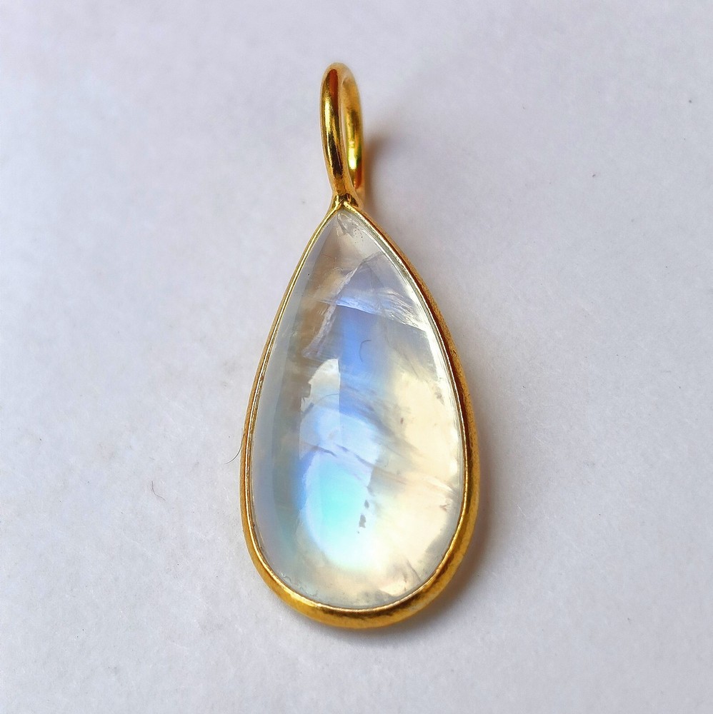 Crafted with an 18k yellow gold setting, this pendant showcases a pear-shaped moonstone gemstone that glows with a captivating fire. The bezel setting ensures the stone's security, while the locket type adds a touch of charm to this exquisite piece. A single, eye-clean moonstone, natural and not enhanced, is the star of this show, its beauty underscored by the gold's warm glow. The pendant is a versatile piece suitable for numerous occasions, from anniversaries and birthdays to engagements and Mother's Day. It comes with the assurance of a seller warranty and is nickel-free, making it a considerate choice for those with sensitive skin. Designed and manufactured in India, this pendant is a testament to timeless elegance and artisanal craftsmanship. Material Metal = 18k Gold Gemstone = Moonstone Gemstone Color = Fire Gemstone Size = 8x15 MM Gemstone Creation =Natural Total Charm weight =1.100 gram Charm Ball Size = 4.5 mm Inside Charm Total Length = 22 MM Charm Total Width : 9 mm Product Making = Handmade Thank You Visiting My Shop Shipping US shipping - Free Shipping International- Free Shipping We provides you each item is individually packed securely with quality products to help ensure safe and undamaged delivery. RETURAN POLICY Your satisfaction is of the utmost concern to us. Should you need to return an item, you can do so within 7 days of receipt of the item a full refund. Return shipping charges are not reimbursable. All items must be in their original condition, not worn or altered. Thank You RR JEWELS