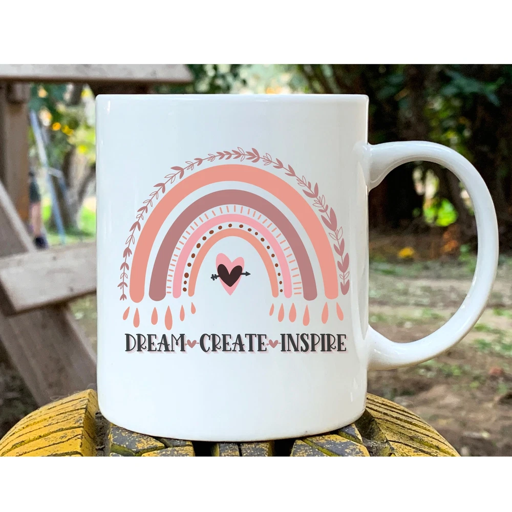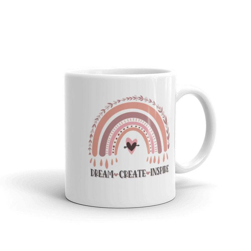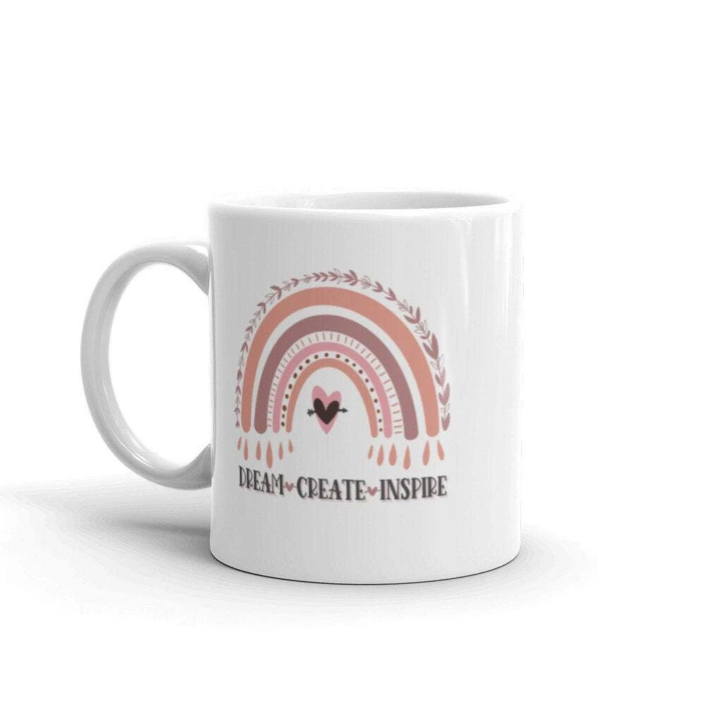 Rainbow Mug Dream Inspire Create Boho Rainbow Mug Inspirational Mug Motivational Product Details.. This high quality 11oz. ceramic white mug has a premium hard coat that provides crisp and vibrant color reproduction sure to last for years. Perfect for all hot & cold beverages. The highest quality printing possible is used. It will never fade no matter how many times you wash it. Material: 100% Ceramic. Print both sides. Dishwasher and Microwave Safe. High Gloss + Premium White Finish. Printed in the U.S.A. Personalized & Custom. We support personalized and custom mug to add custom, when placing an order, you can add notes to the "order note" in shipping address section. Also you can contact us directly via message. Shipping Info. Ready to ship in 1 to 2 business days, All products are made-to-order and proudly printed in the United States. Shipped by USPS and DHL, You will receive your order in 5-7 days. Replace & Refund. All products are defective during shipping broken, chipped will be replaced free of charge. You are not satisfied with the product, we will refund 100% money to you. If any other issues arise, please do not hesitate to message, we would be more than happy to assist you.
