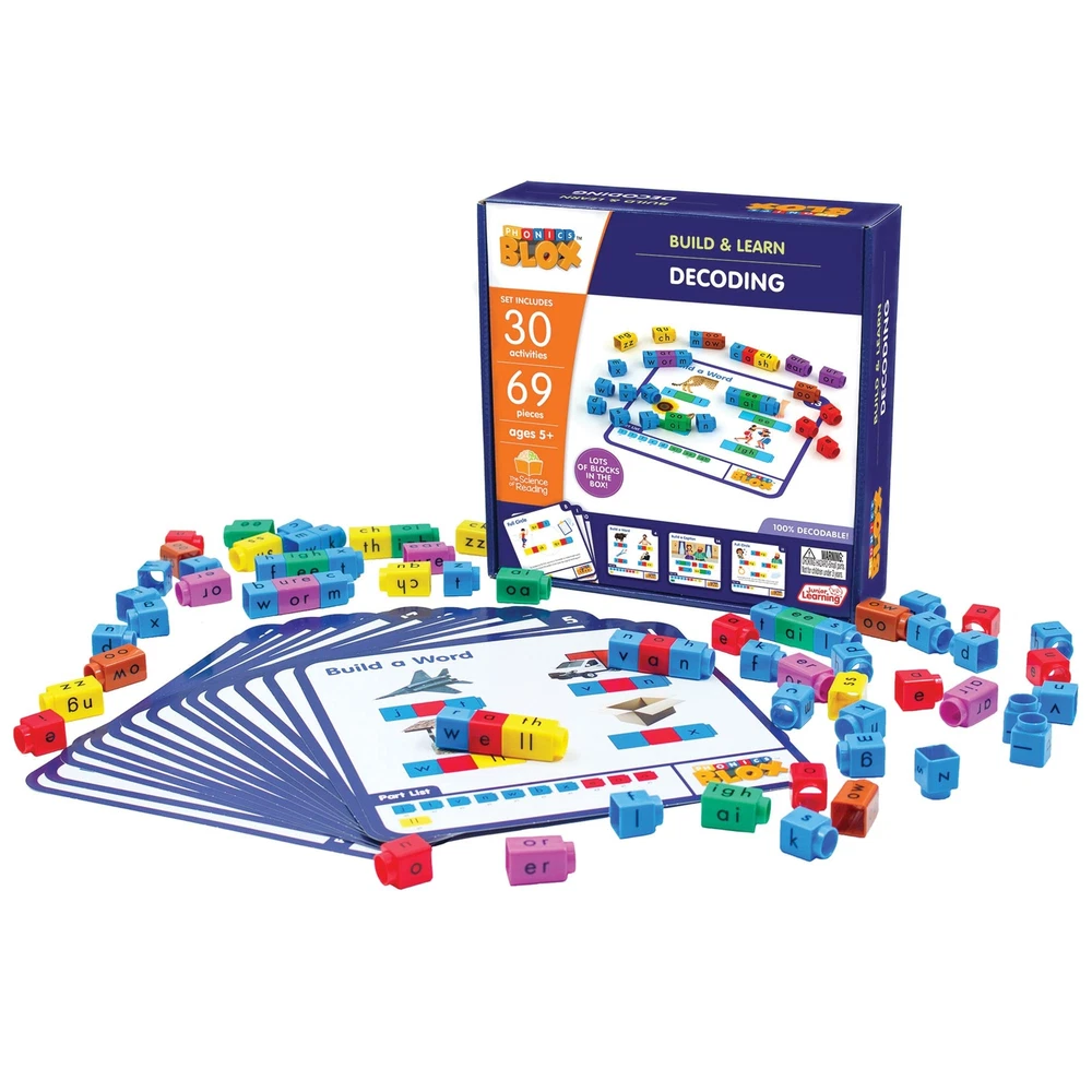 RAINBOW PHONICS BLOX: DECODING - PHASE 3 - The decoding set covers the next 18 letter patterns and teaches decoding with the first 44 sounds. Children will enjoy the variation across the activities, and the color-coding implicitly supports their developing decoding skills. Simply choose the phonics blox to use for each activity as listed at the bottom, then slide them together to spell or decode words. Follows a systematic progression and relates to Phase 3 of the Rainbow Phonics program. A fun, hands on way to learn decoding skills. Each box contains all the Blox needed for completing every activity in the set. Phonics Blox is a comprehensive, interactive, and educational tool for mastering reading and enhancing phonics skills. Easy for students, teachers, instructors and parents to use. HANDS ON MANIPULATIVES for mastering phonics activities. The use of physical Blox and varied activities keeps students motivated and involved in their phonics practice. 30 LEARNING ACTIVITIES: Includes 30 activity cards, each designed to progressively build phonics skills and mastery of patterns and sounds. INTERACTIVE DECODING: Covers the next 18 letter patterns and teaches decoding with the first 44 sounds, building on foundational phonics skills. COLOR-CODING throughout the set and the series act as a visual reminder for students for easy recall. Engages students in the Science of Reading. ALL-INCLUSIVE BOX: Lots of blocks in the box! Each box contains all necessary Blox and activity cards needed to complete the activities, ensuring that students have everything they need to engage in phonics practice.