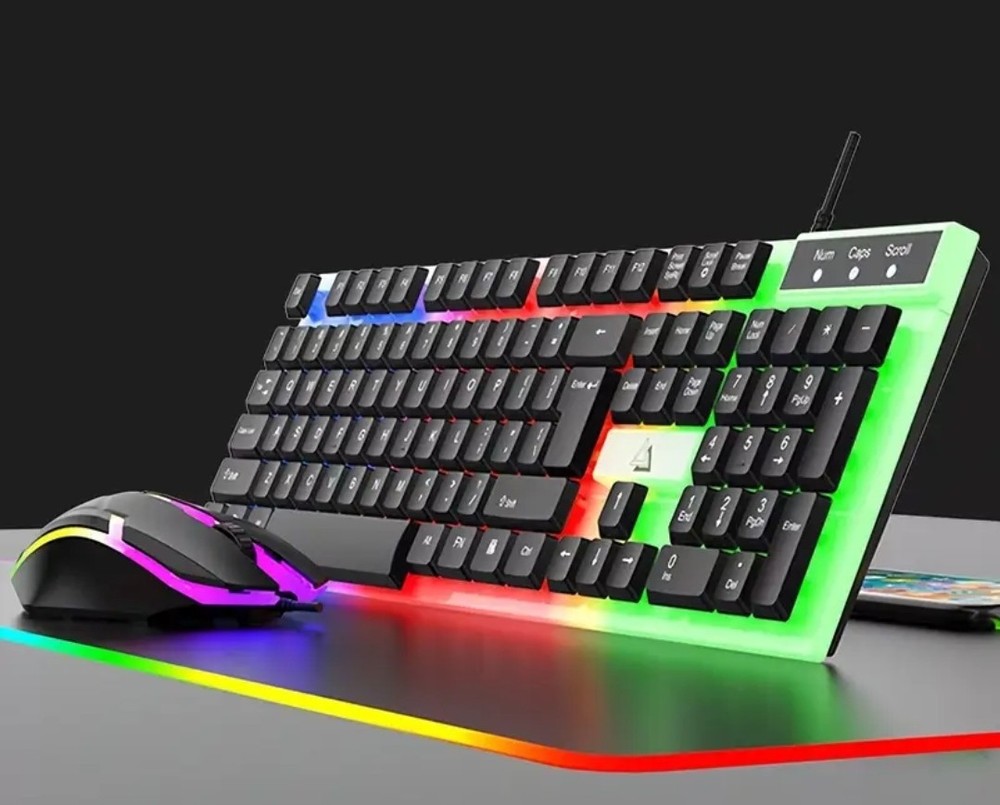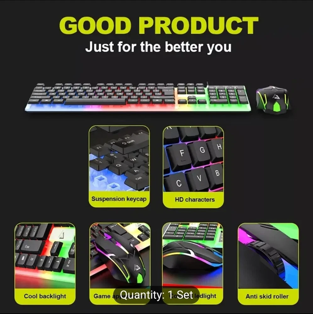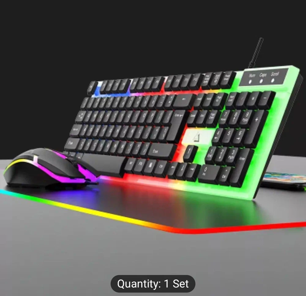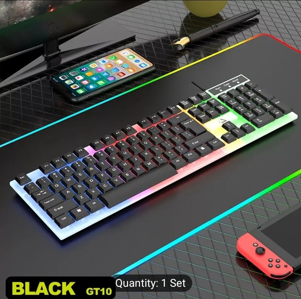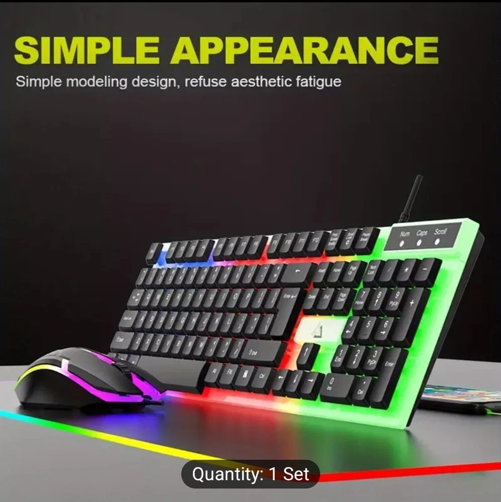 This is a Rainbow Gaming Keyboard and Mouse Combo featuring a ZIYOU LANG brand mechanical keyboard in black color. The keyboard has a QWERTY layout, illuminated keys, enhanced function keys, and is water-resistant. It is a wired USB connectivity with plug and play functionality. The set includes a Logitech BASE model keyboard and comes with English language keys.