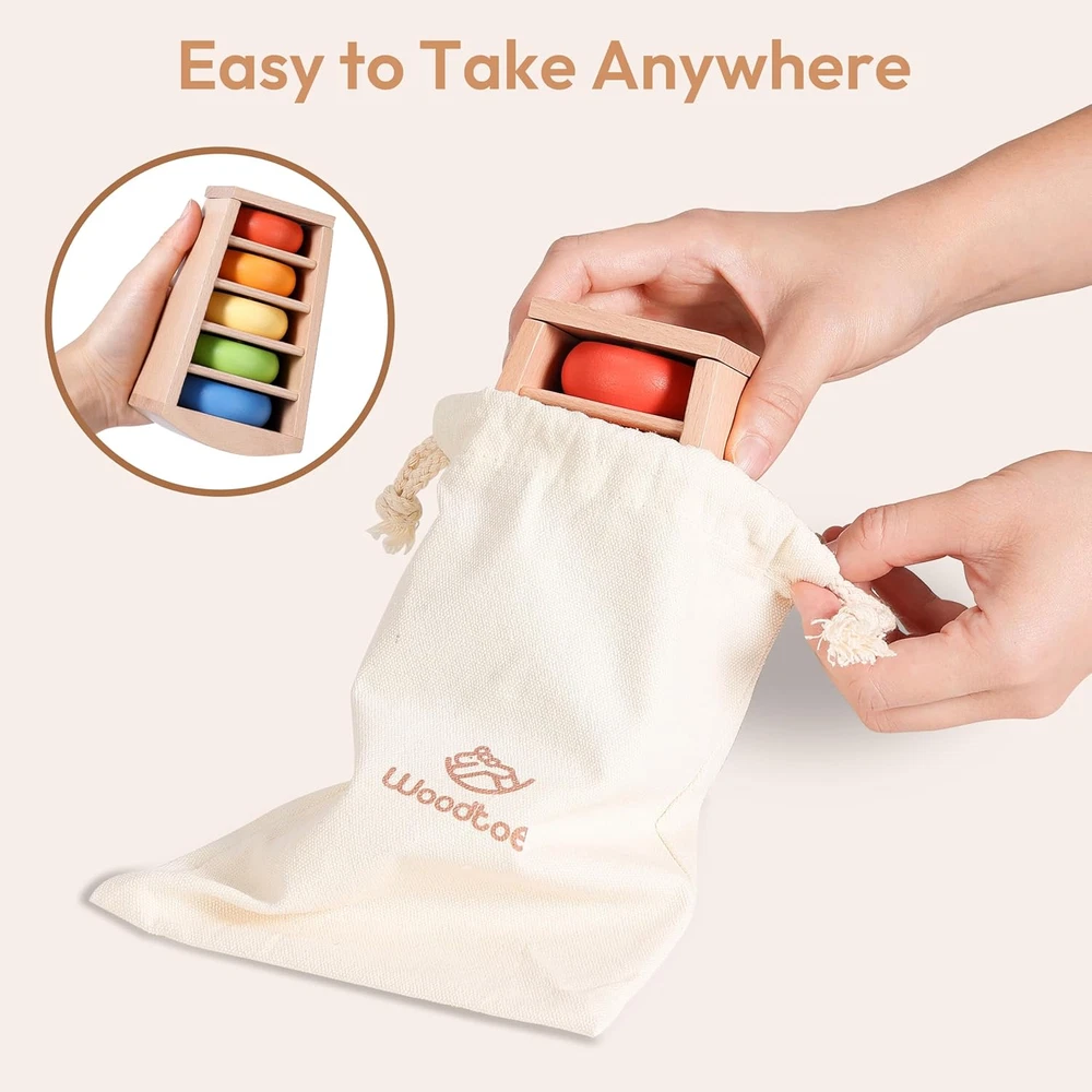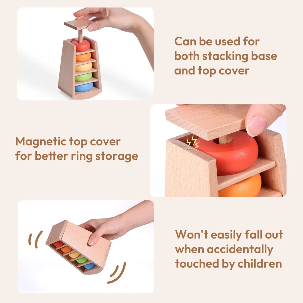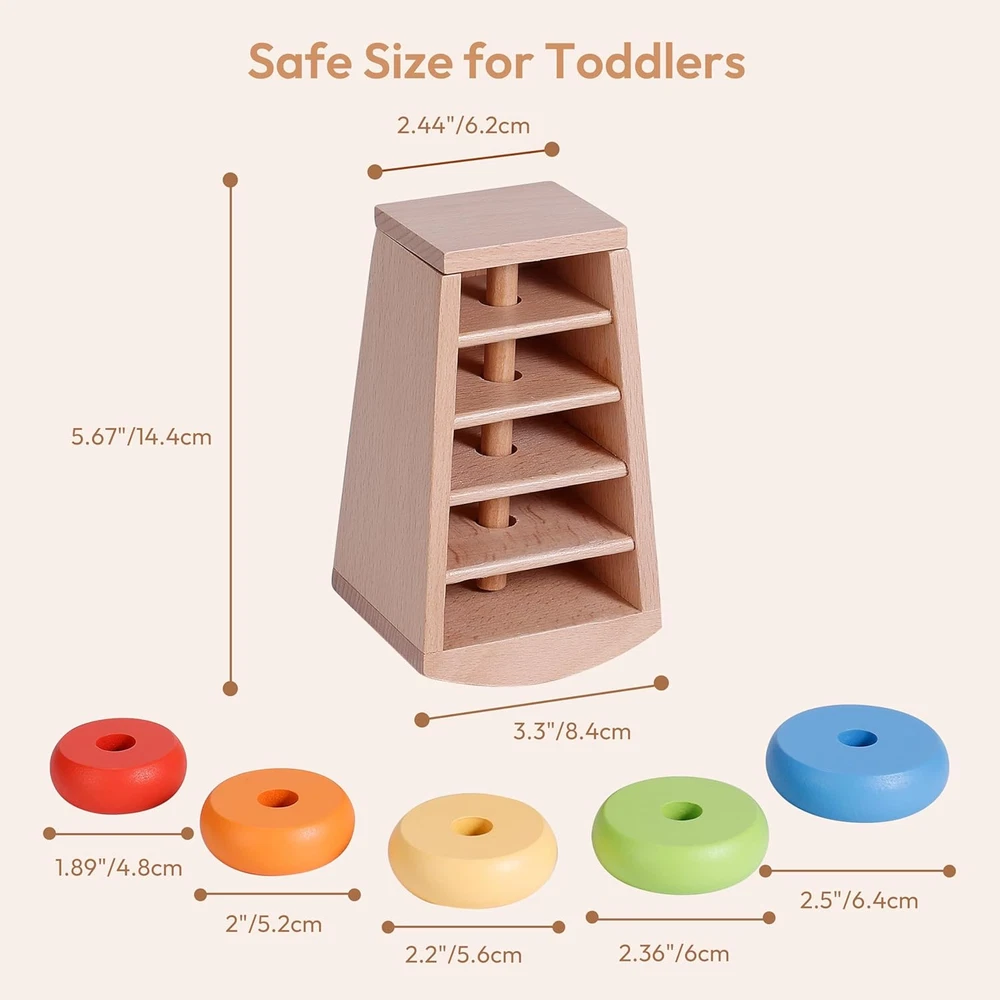 Montessori Size Sorting Toy: This baby stacking toy offers sorting and stacking modes of play. Children learn to distinguish sizes by placing different-sized rainbow rings into corresponding slots. They can also flip the top board upside down to play stacking games on a flat surface. This toy is designed to develop children's fine motor skills and sensory abilities Rich Color Recognition: This rainbow stacker features 5 different colored rings, which not only help children recognize and differentiate colors but also come with a wobbling base that adds to the fun of play. This wooden stacking toy encourages children to actively explore and discover, enhancing their cognitive and motor skills, making learning both enjoyable and effective Safe Materials: This wooden Montessori toy is made from natural beech wood, with a smooth surface coated in safe water-based paint, ensuring safety and durability during play. The smallest ring has a diameter of 1.89 inches, meeting safety standards and posing no risk of swallowing or choking Easy to Carry: This stacking rings baby toy is compact and portable, coming with a excellent canvas bag, making it suitable for travel and outings. Whether at home, in the car, or on vacation, children can enjoy the fun and educational opportunities this toy provides, ensuring continuous engagement and entertainment Educational Toy for Toddlers: This unique Montessori baby toy can greatly help children develop hand-eye coordination and cognitive development. It is very suitable as a holiday such as a birthday, Christmas for children aged 18+ months, to express your love to your baby, grandson, or friends. Children will be very happy and play to their heart's content, and adults and children can spend unforgettable time together Product Description
