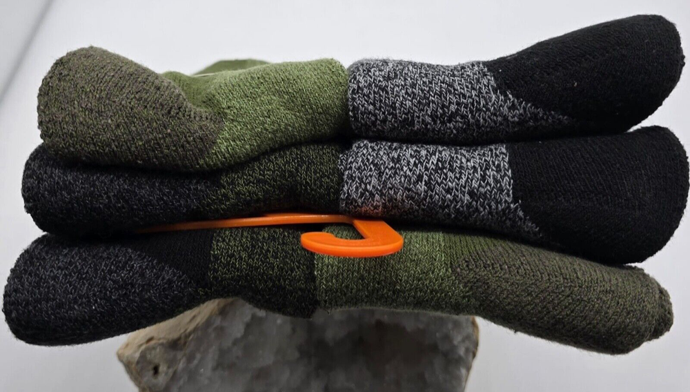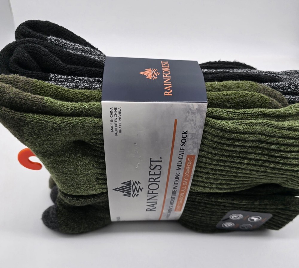 RAINFOREST Mid-Calf Socks Set includes 6 pairs in sizes 6-12. The socks are primarily Green in color with reinforced construction. Made from a blend of Polyester, Spandex, and Cotton, they feature arch support, cushioning, and moisture-wicking properties. Suitable for outdoor activities, these socks are designed for men and have a regular fit. Made in Pakistan. Shoe size 6-12. The socks come in Green/Black colors. Made of 72% polyester, 22% cotton, and 4% rubber and 2% spandex, have cushioning, reinforced heel & toe, moisture-wicking. Ideal for casual or workwear occasions, these socks are perfect for winter and fall seasons, with a focus on outdoor activities and cold-weather sports.