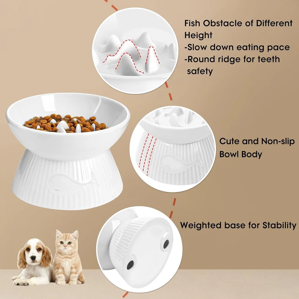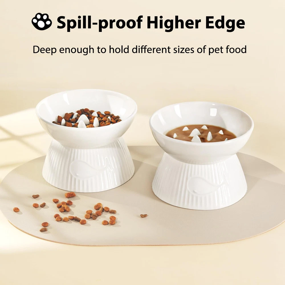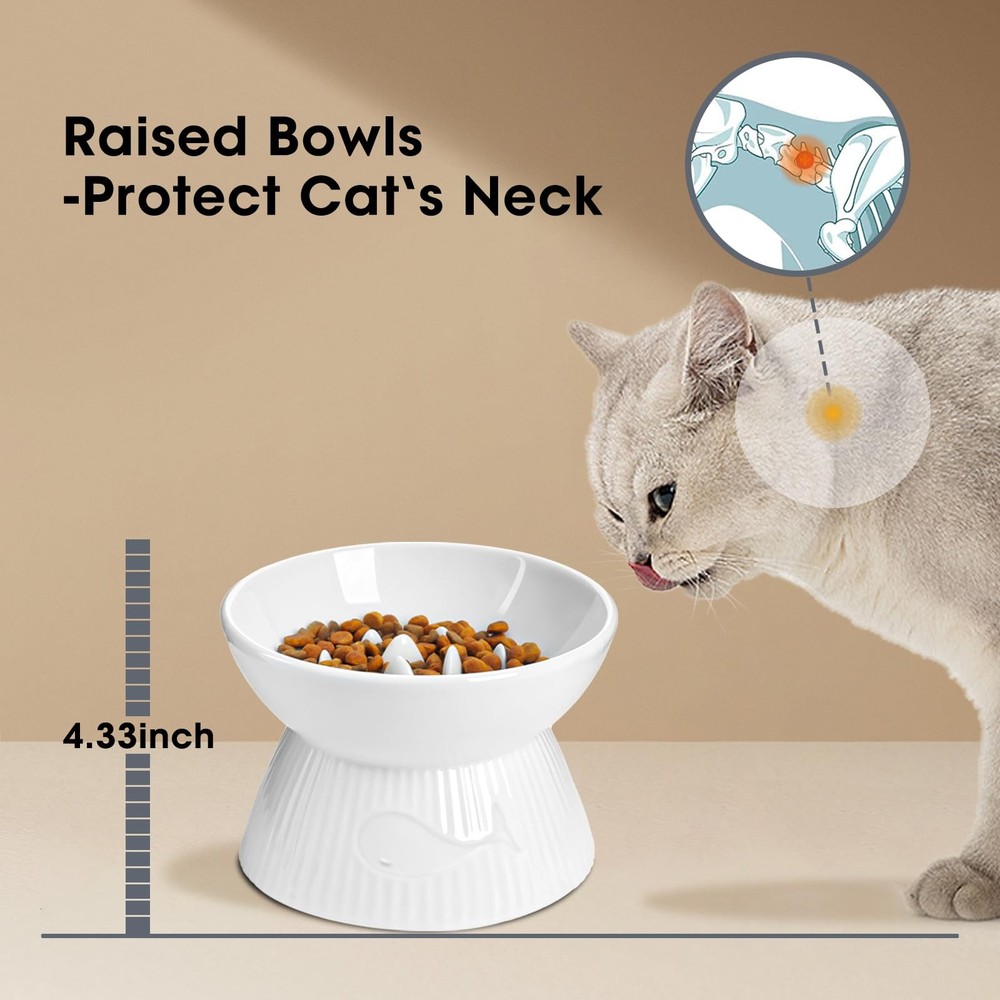 Ceramic Cat Slow Feeders Slow Down Eating with Upgraded Ridges. Fast eating may swallow large amounts of food and air into the stomach, which can lead to choking, vomiting and other indigestion. This obstacle ridges are designed higher and irregular, which can effectively train your puppy and kitty to eat slowly. Help improve pets' digestion, prevent bloat, choking and obesity. Raised Stand for Neck & Joint Protection. This raised slow feeder cat bowls increases the height of feeding station to 4.33", so that pets no longer have to strain unnaturally to eat from ground level, which makes it easy to swallow and reduce strain on your pet's neck and joints. Safe Ceramic & Easy to Clean and Reheat. The veterinarian recommends using a ceramic bowl than plastic one. Our cat slow feeder wet food bowl is made of high-temperature fired ceramics, free of BPA,lead or cadmium. Besides, porcelain finish is not easy to breed bad things, which prevents pet's black chin and feline acne. The smooth surface is easy to clean in dishwasher and warm up homemade food in microwave. Spillage-Proof Flat Opening with Higher Edge. If you are fed up with cleaning messy floor for you pet every day, our slow eating cat bowl is better than any tilted ones. designs this cat food bowl slow feeder with flat opening and higher wall to prevent food spillage. It can hold different sizes of pet food bought or made by yourself. Henceforth, you don't need to worry about your crazy eater messing up the floor every day. Prevent Moving or Tipping with One-piece Design & Weighted Base. Unlike those with separated stand, our one-unit design with wider and weighted ceramic base can prevent raised cat slow feeder bowl from moving around or tipping over when eating. It reduces the mess and scratches on the floor. Besides, you don't have to waste time to assemble or disassemble for daily refilling and cleaning. For medium and large cats, and small-size dogs. Capacity:1.7 cups (13 ounce) for wet food, 1 cup for dry food. Note: The height 4.33" does not work for kitten or small-size cat.