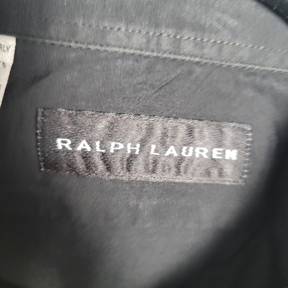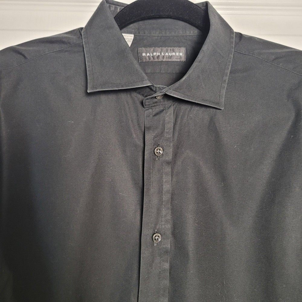 Ralph Lauren Black Label Shirt Mens 17 Black Made In Italy Dress Long Sleeve Previously worn with general light wear and lint throughout. One cuff button is broken. No major stains or tears observed. Brand: Ralph Lauren Style: Mens long-sleeve button front dress shirt with spread collar and barrel cuffs. Color: Black Size on tag: 17 (approximate mens XL neck size). Material: 100% cotton. Made in Italy. Details: Solid color design with tonal buttons, classic dress shirt styling without chest pocket, suitable for business, office, or formal wear. Special note: Previously worn with general light wear and lint throughout. One cuff button is broken. No major stains or tears observed. 304