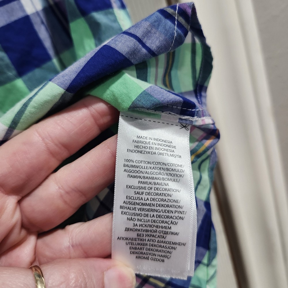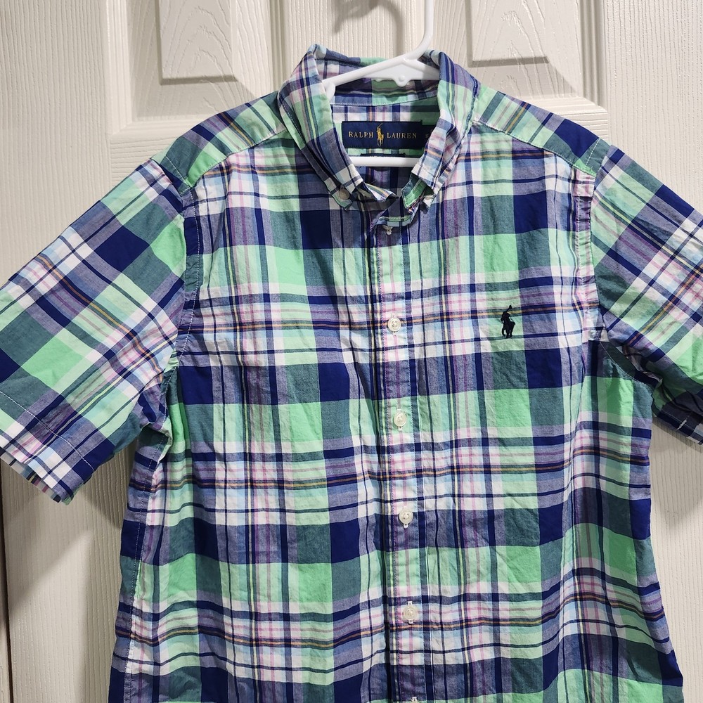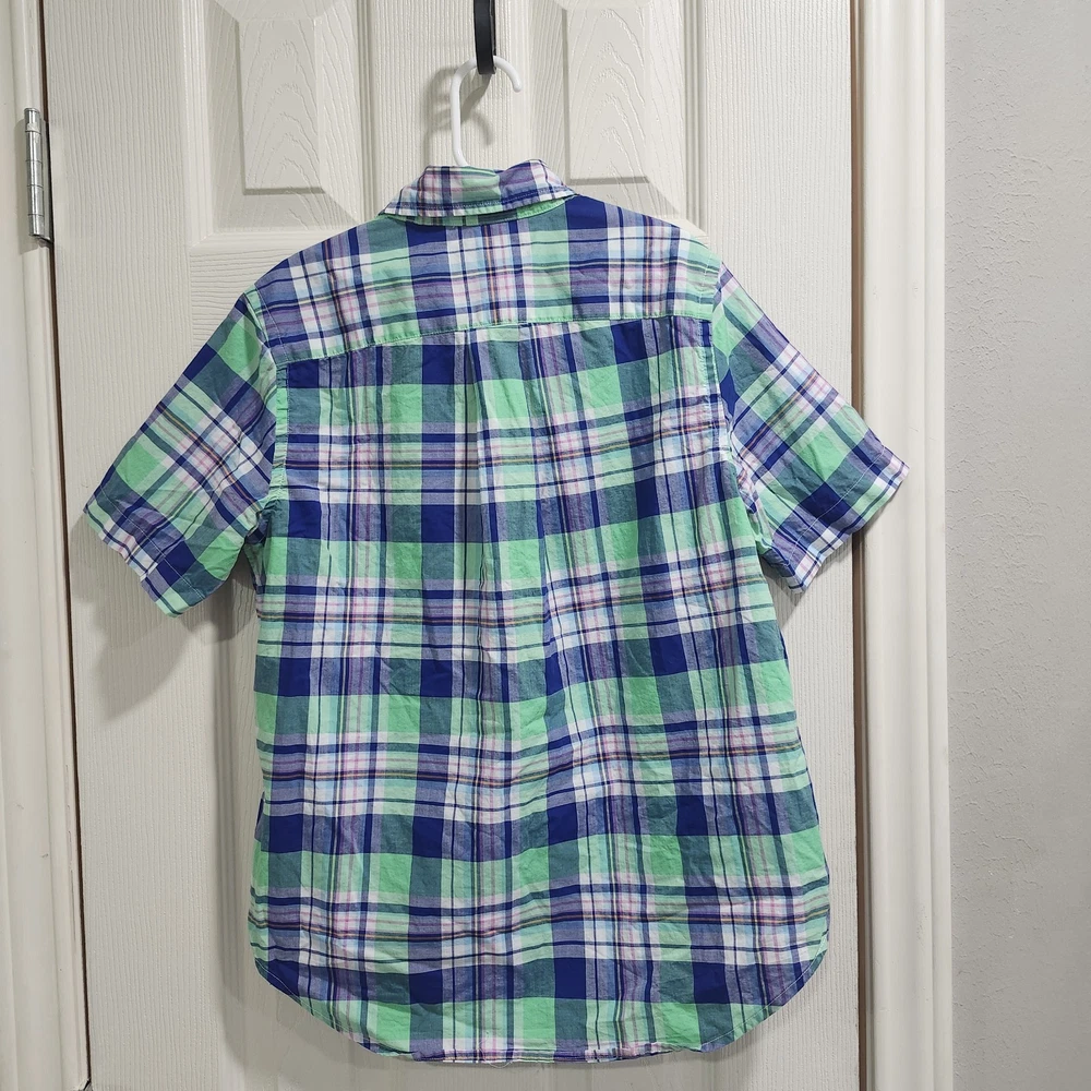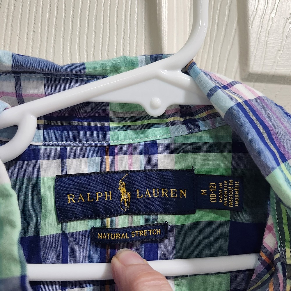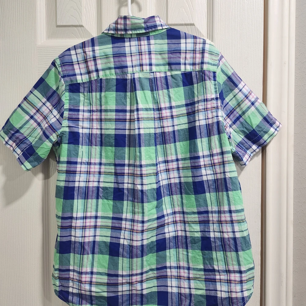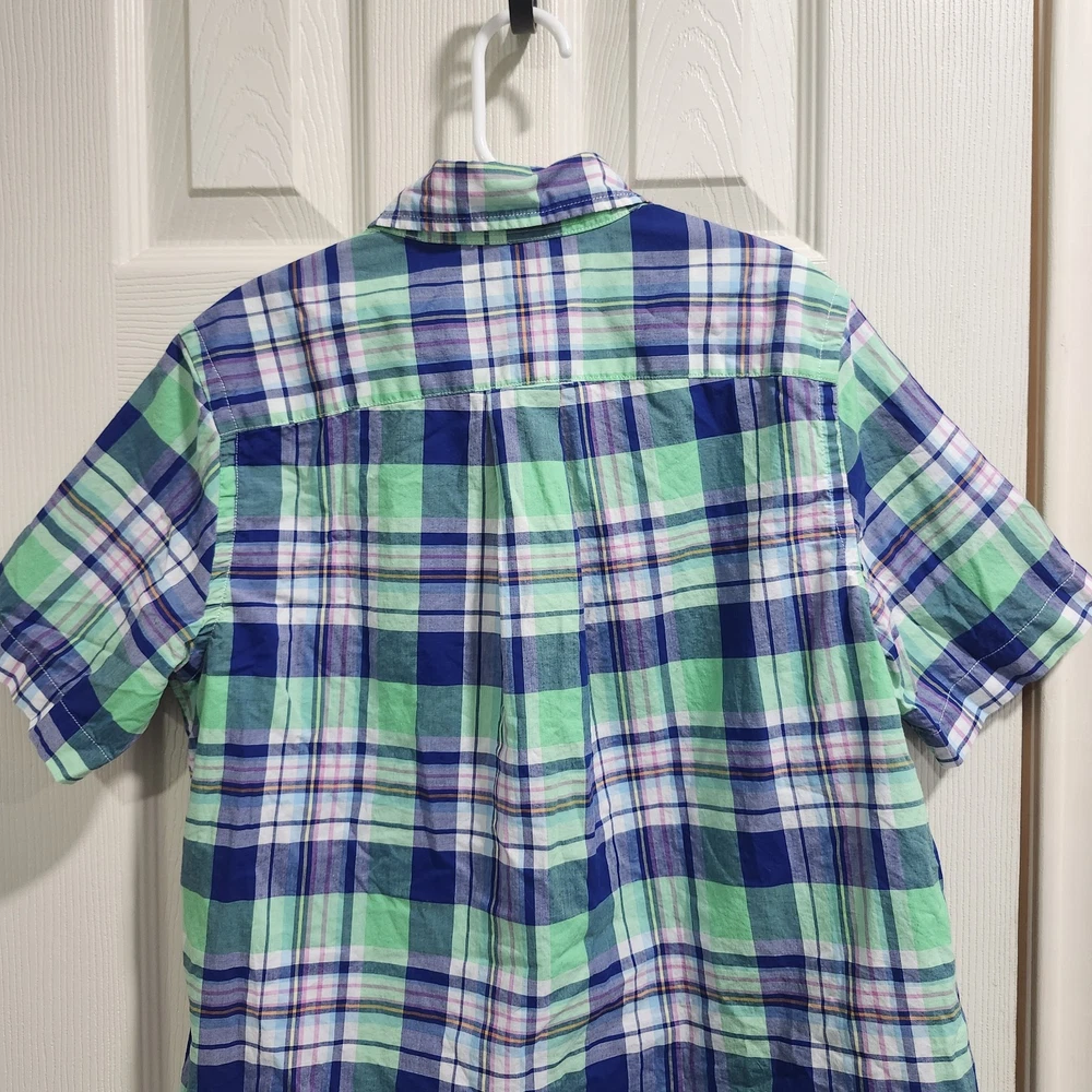 Boys Polo Ralph Lauren plaid button-down shirt in shades of blue, green, and white with the classic embroidered pony logo. Features a button-down collar, short sleeves, and the “Natural Stretch” fabric for comfortable everyday wear. Lightweight cotton blend feel that’s great for spring and summer outfits. Classic preppy style that pairs easily with shorts, chinos, or jeans. Condition: Good preowned condition with normal light wear. No major flaws noted. Brand: Polo Ralph Lauren Size: Boys M (10–12) Measurements (laid flat): • Armpit to armpit: 18 in • Front length: 23.5 in • Back length: 24.5 in • Sleeve length: 8.5 in • Shoulder: 13.5 in Please compare measurements to a favorite shirt for best fit.