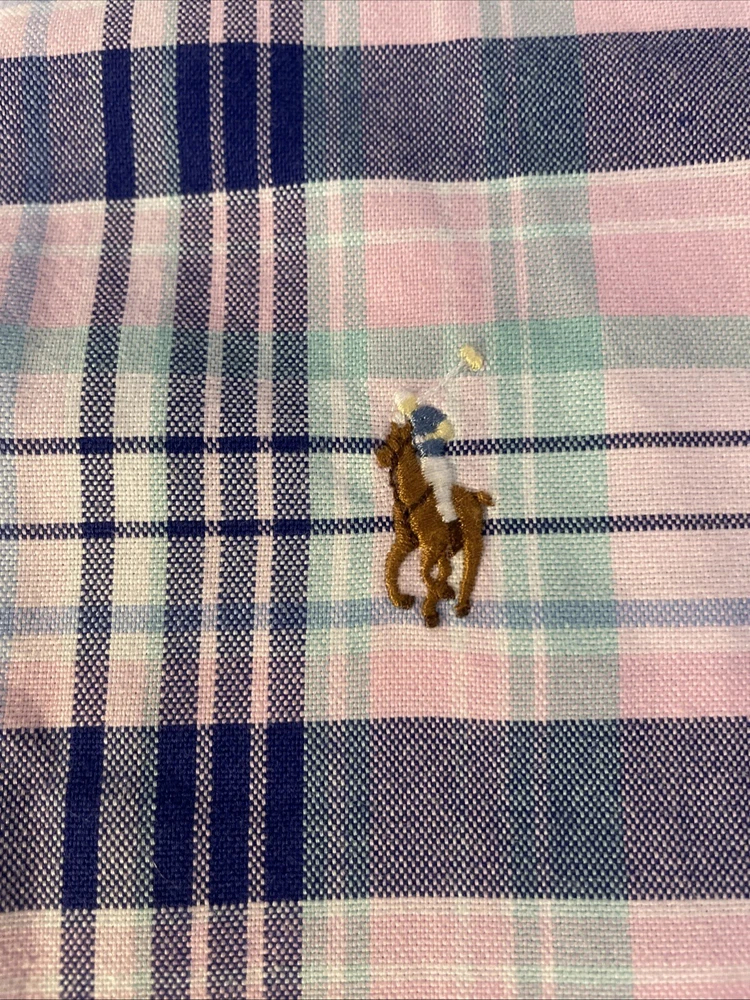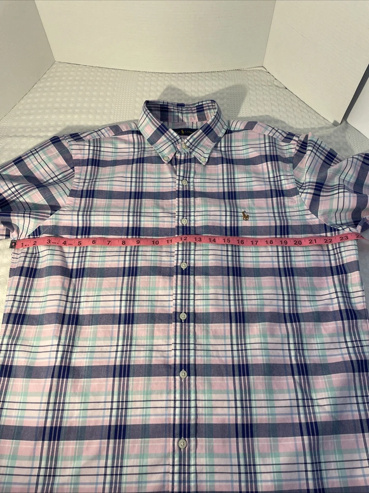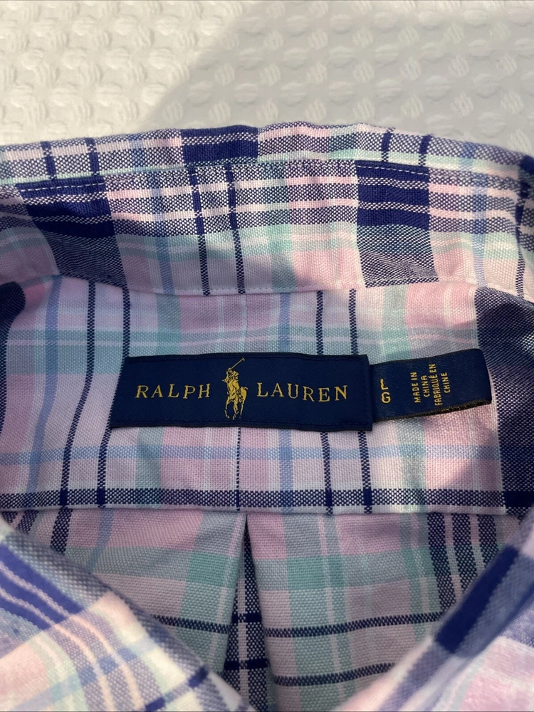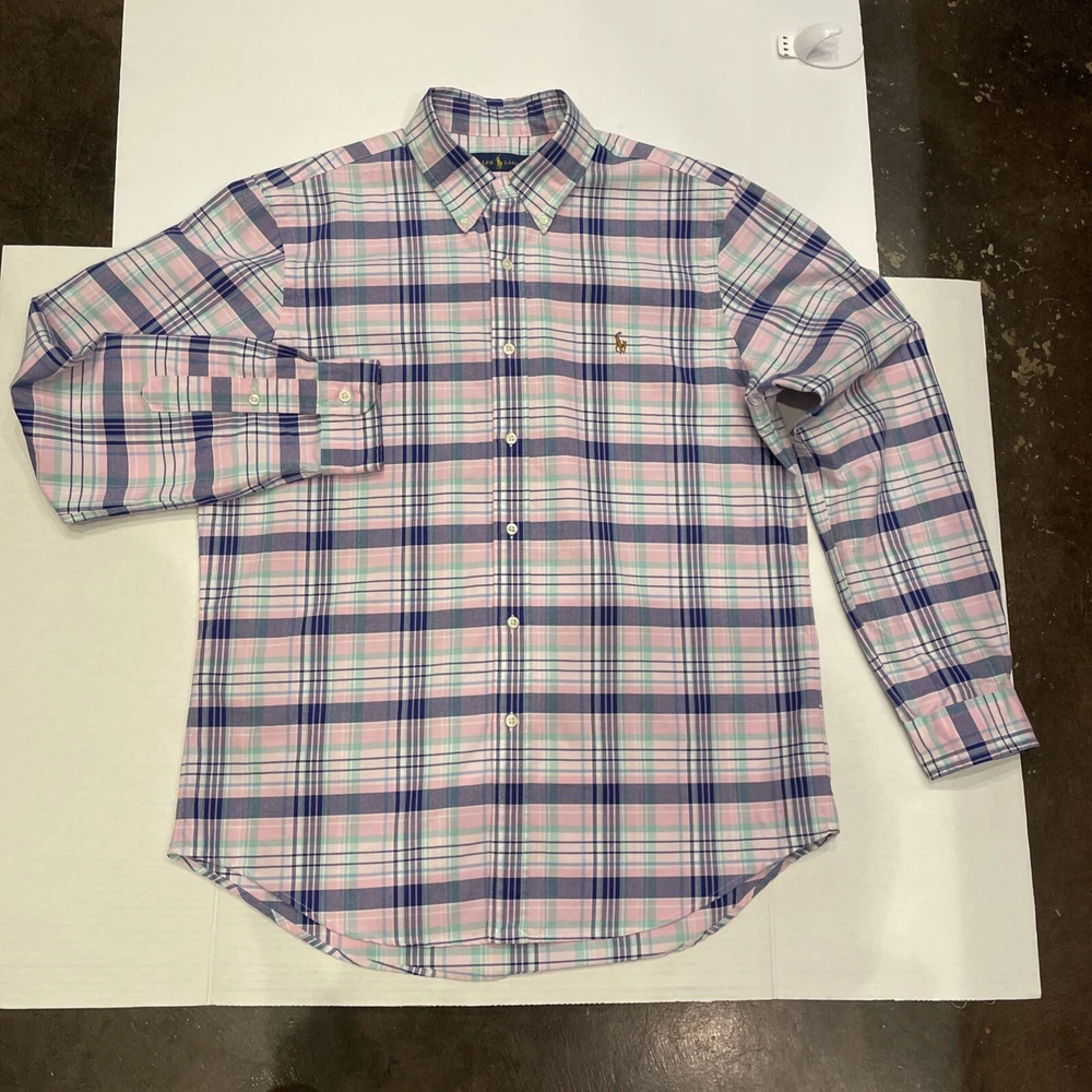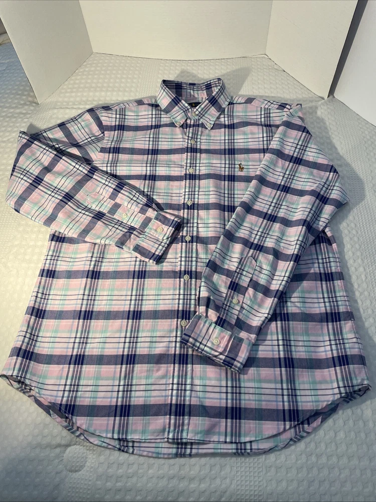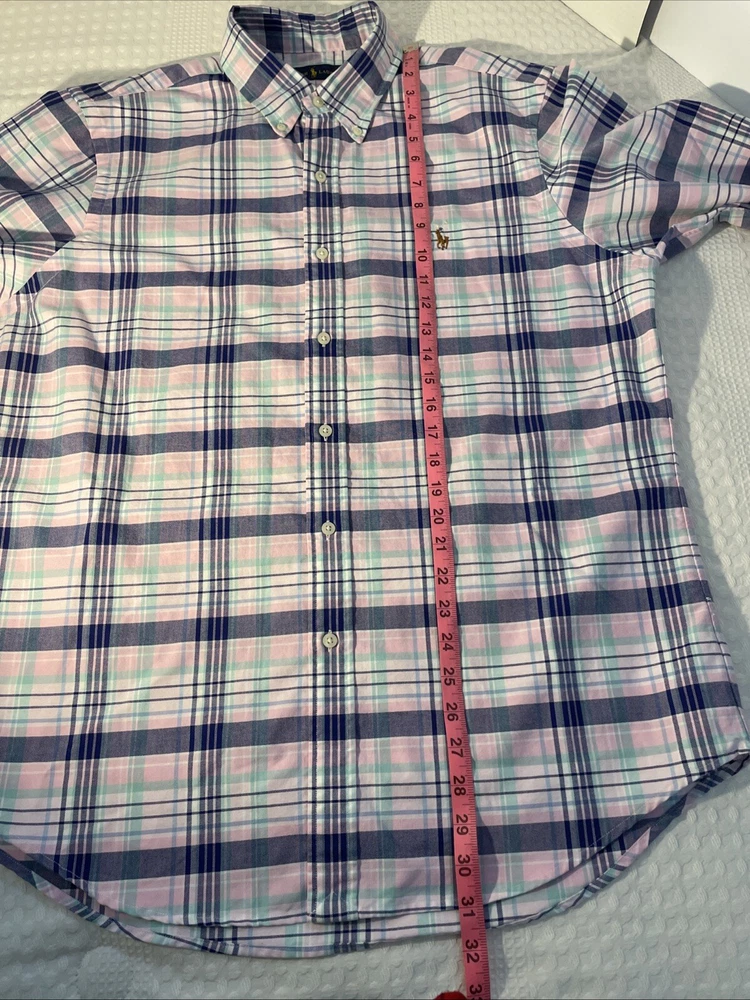 This Ralph Lauren men's shirt features a classic fit design in size L, with a colorful plaid pattern in shades of blue, pink, and green. Made from 100% cotton fabric, this button-down shirt has long sleeves and a collared neckline with a button-down style. The shirt is suitable for all seasons and showcases the classic and colorful theme typical of Ralph Lauren designs.